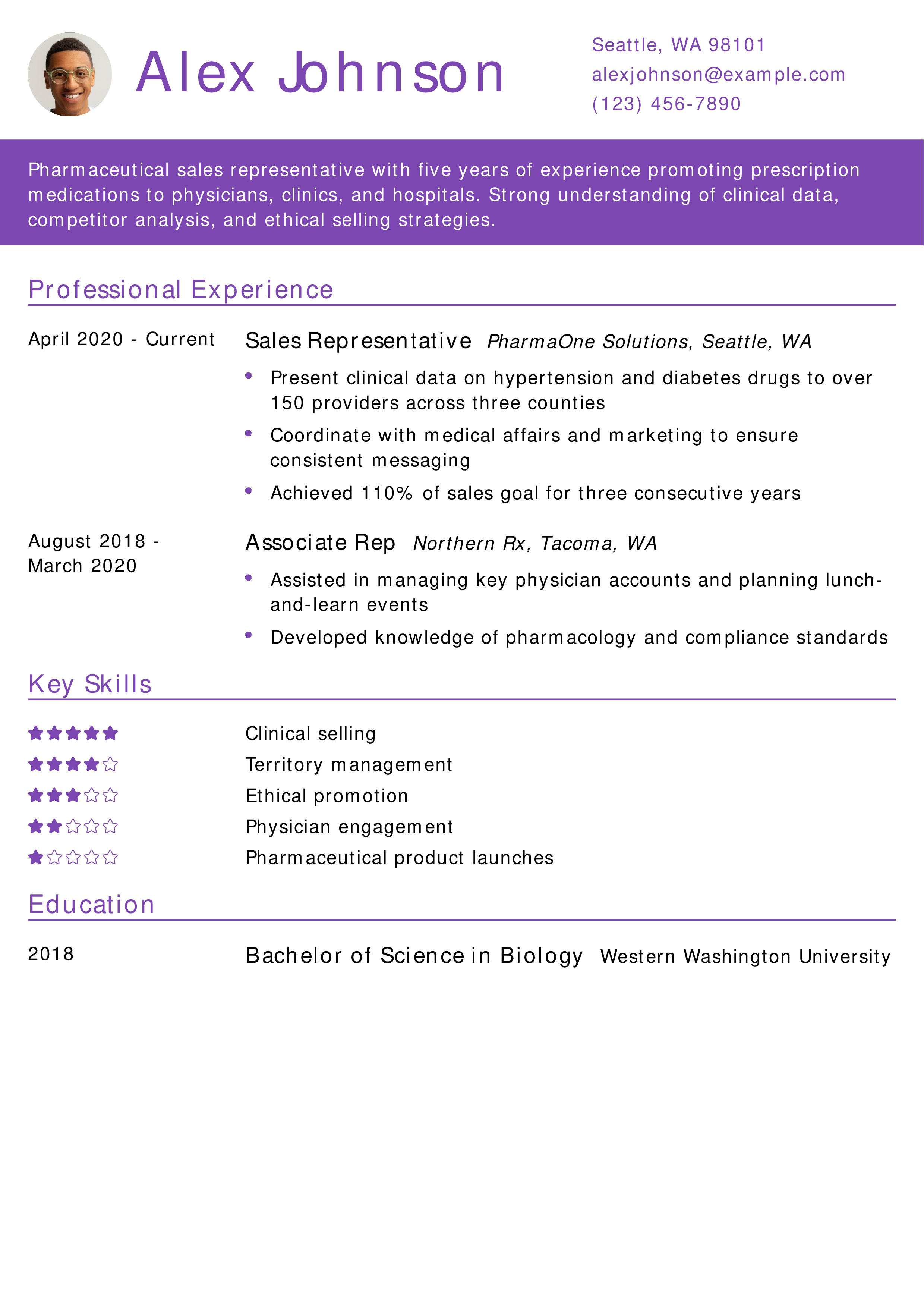 This resume is impactful because it highlights pharmaceutical regulations and performance in clinical product sales. For tips on tailoring your experience, visit resume language skills.