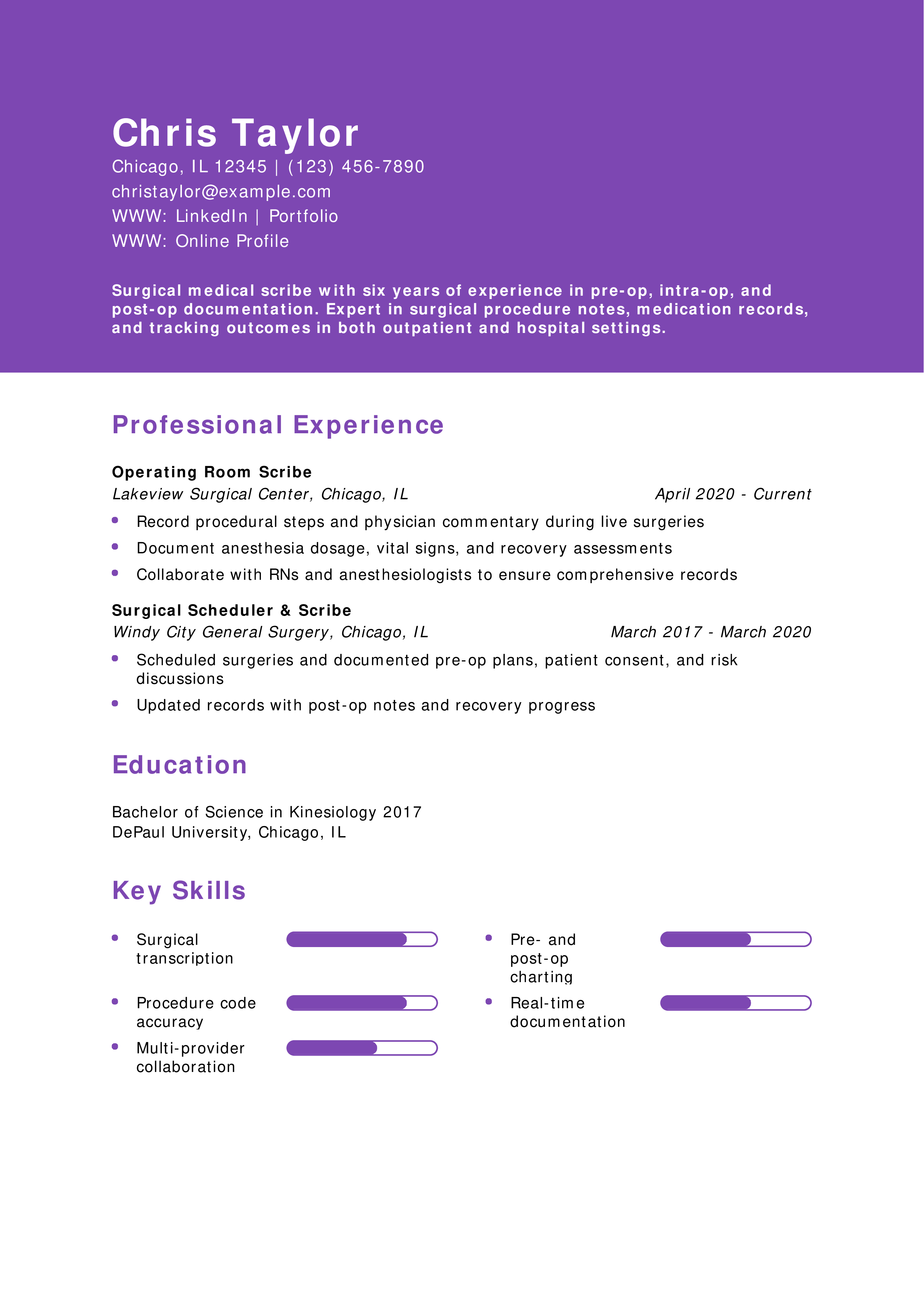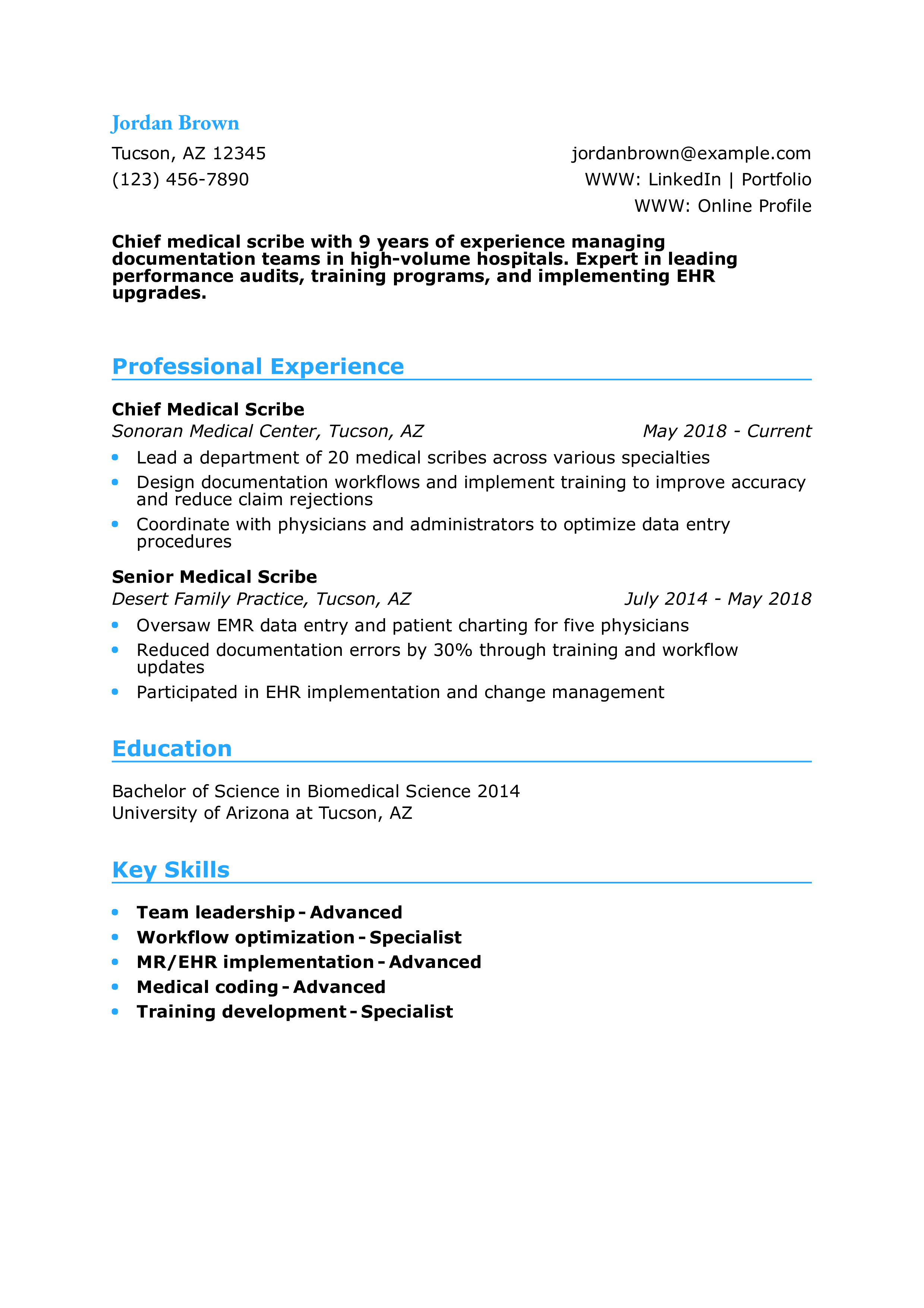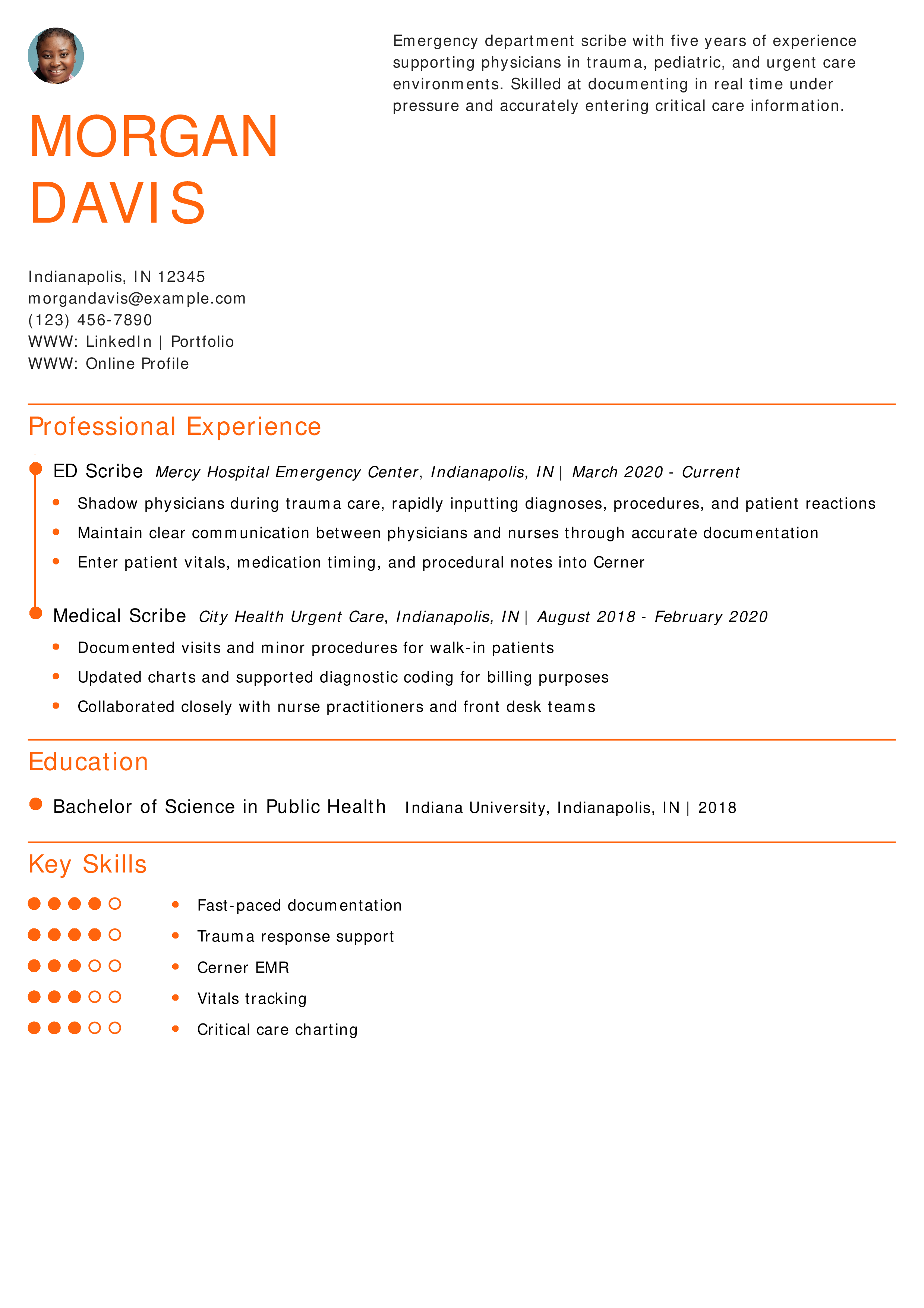 “Medical scribe resumes should reflect speed, accuracy, and knowledge of clinical terminology. Detail how you’ve supported providers and improved documentation workflows. ”