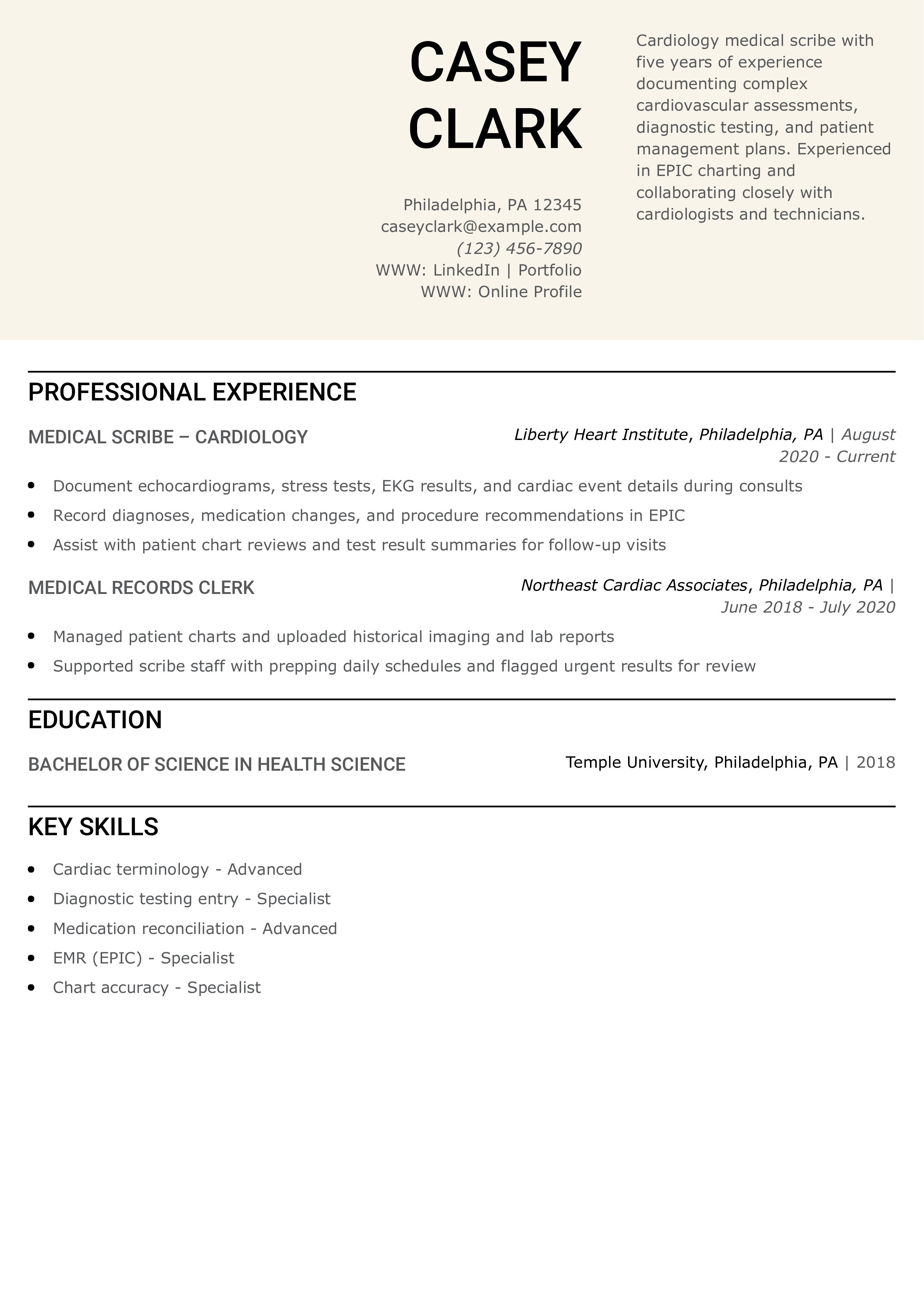 Cardiology Medical Scribe Resume