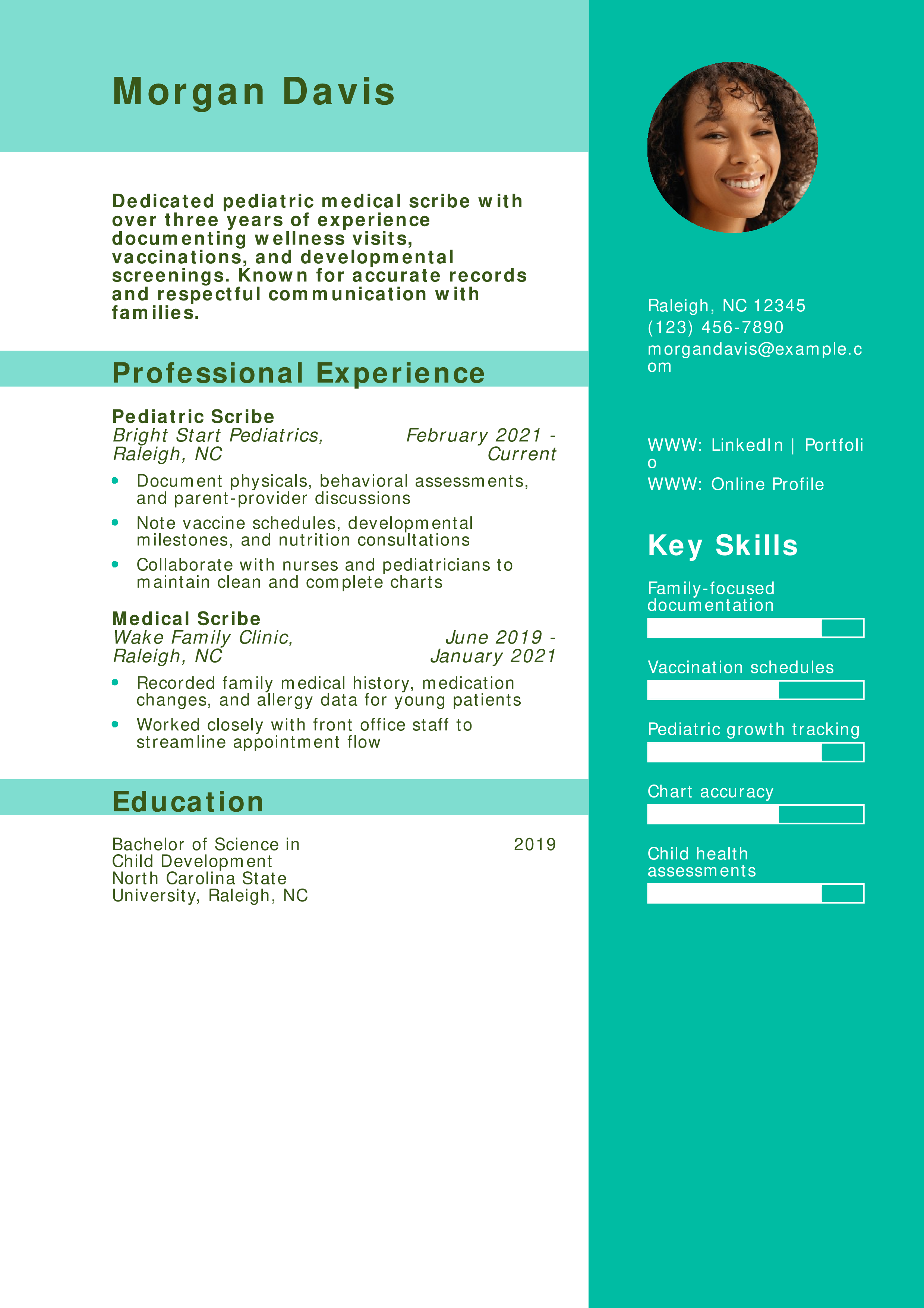 This resume is notable for its clear pediatric focus and collaborative tone. It conveys warmth and attention to detail, essential in children’s health care. For help expressing emotional intelligence, visit resume interests section.