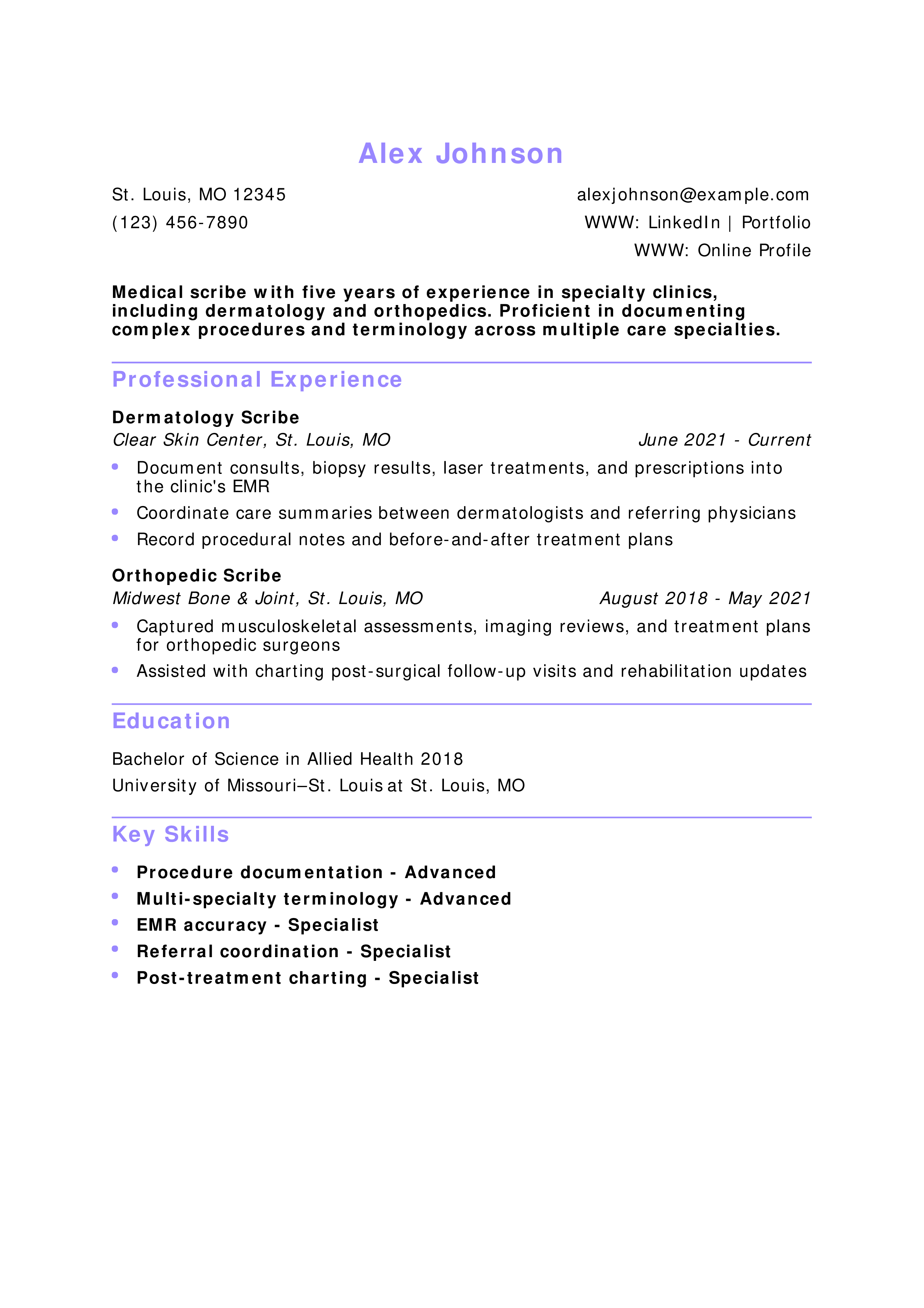 A medical scribe with three years of professional experience specializing in medical terminology, Health Insurance Portability and Accountability Act (HIPAA) regulations, written communication, and clinical operations. A proven track record of identifying opportunities to enhance clinical workflows, accuracy, and efficiency for medical organizations and physicians.