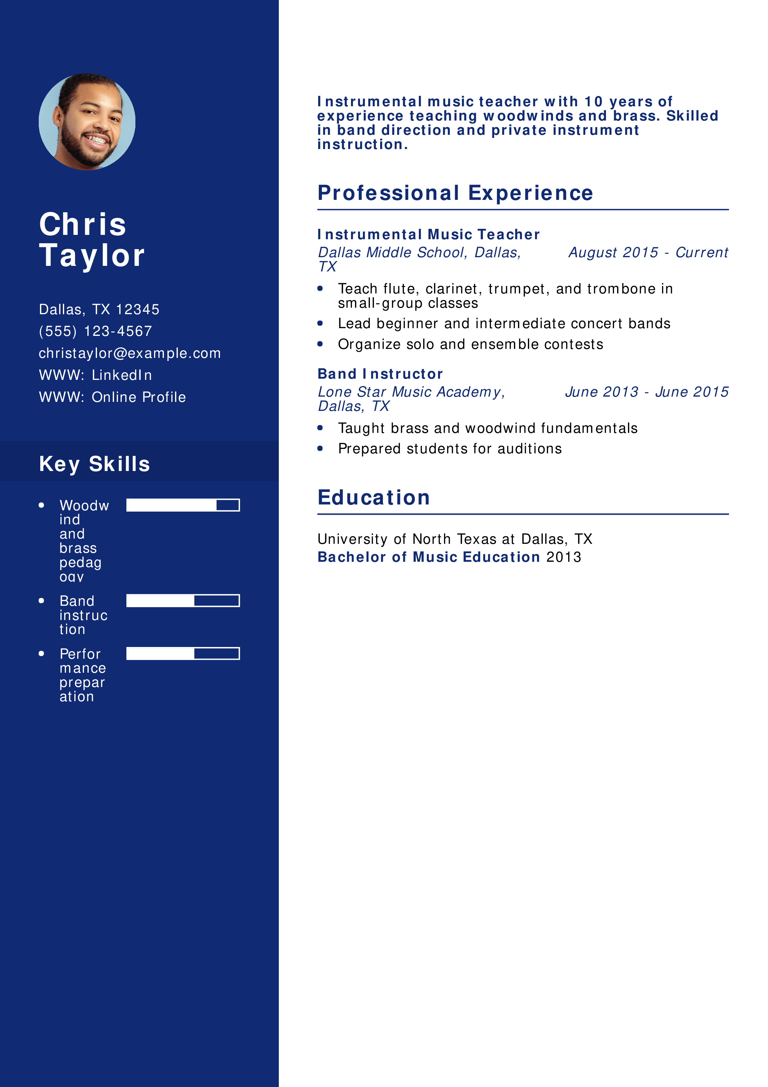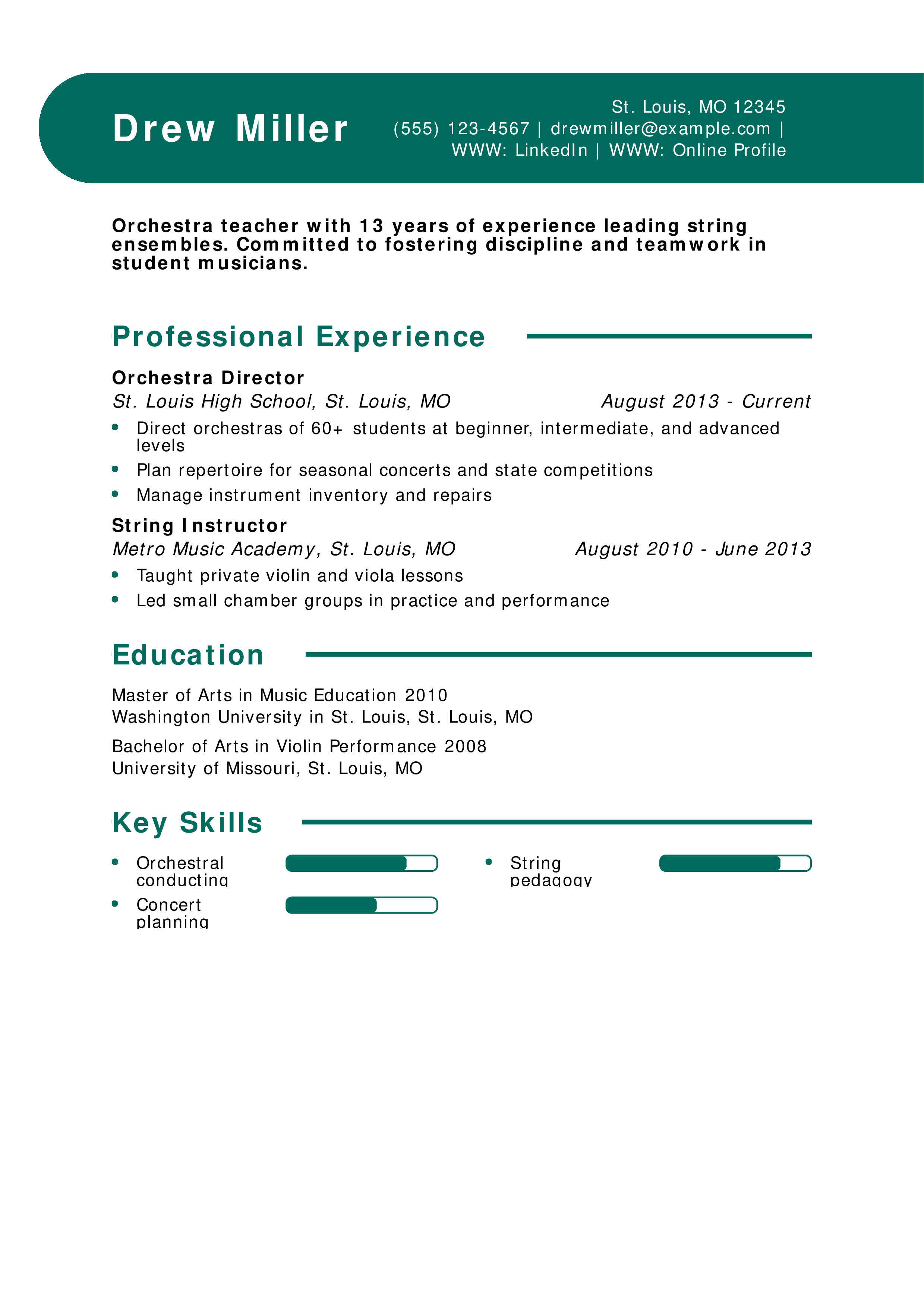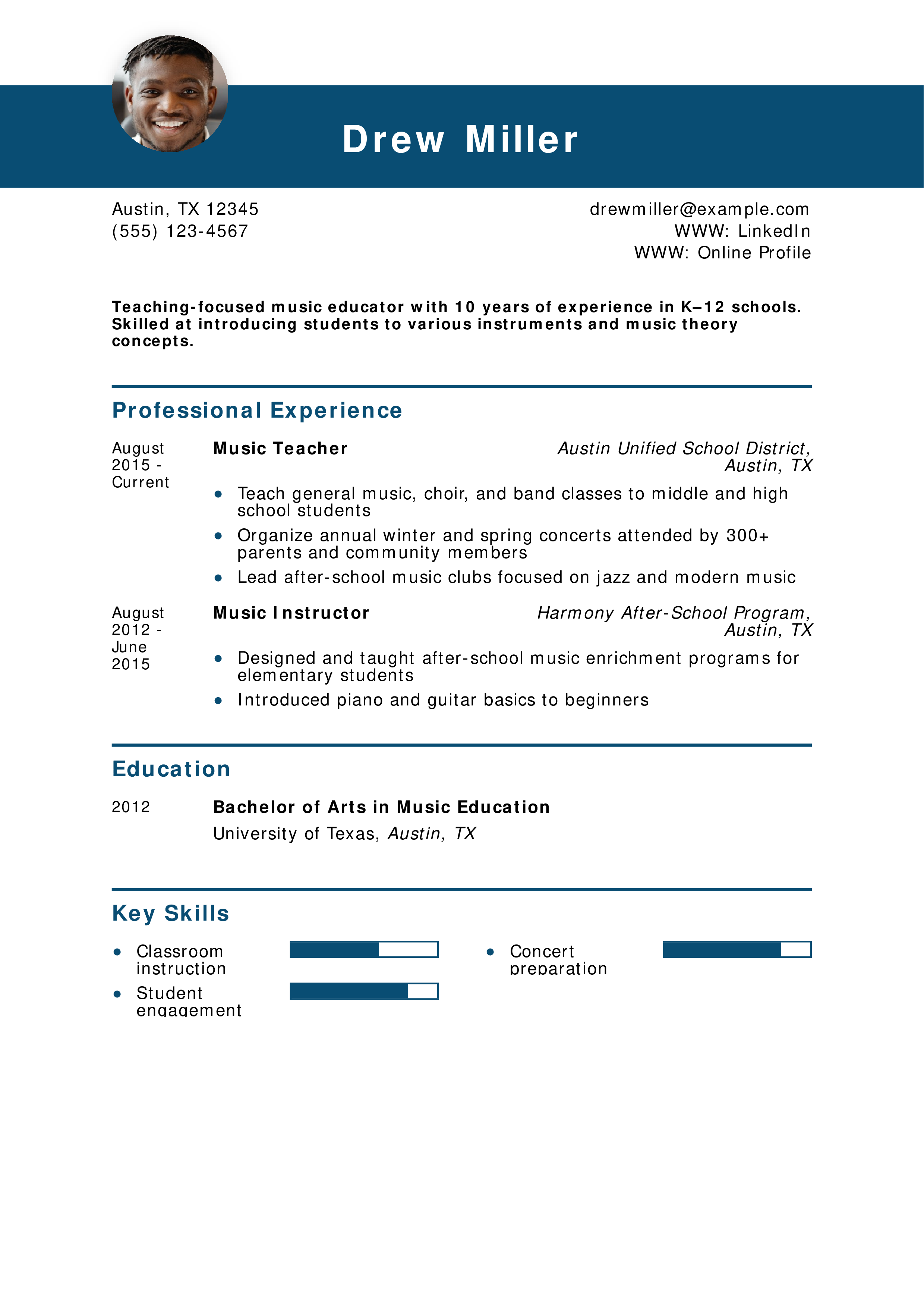 Music teachers combine strong subject knowledge and communication skills to excite people about music and the arts. For an effective music teacher resume, include a “Key Skills” section that gives the hiring manager an overview of your expertise. This also optimizes your resume for application tracking systems (ATS) that filter the documents for hiring managers. Including keywords from the job description in your resume will help you get through the initial screening. Consider including terms like those below: