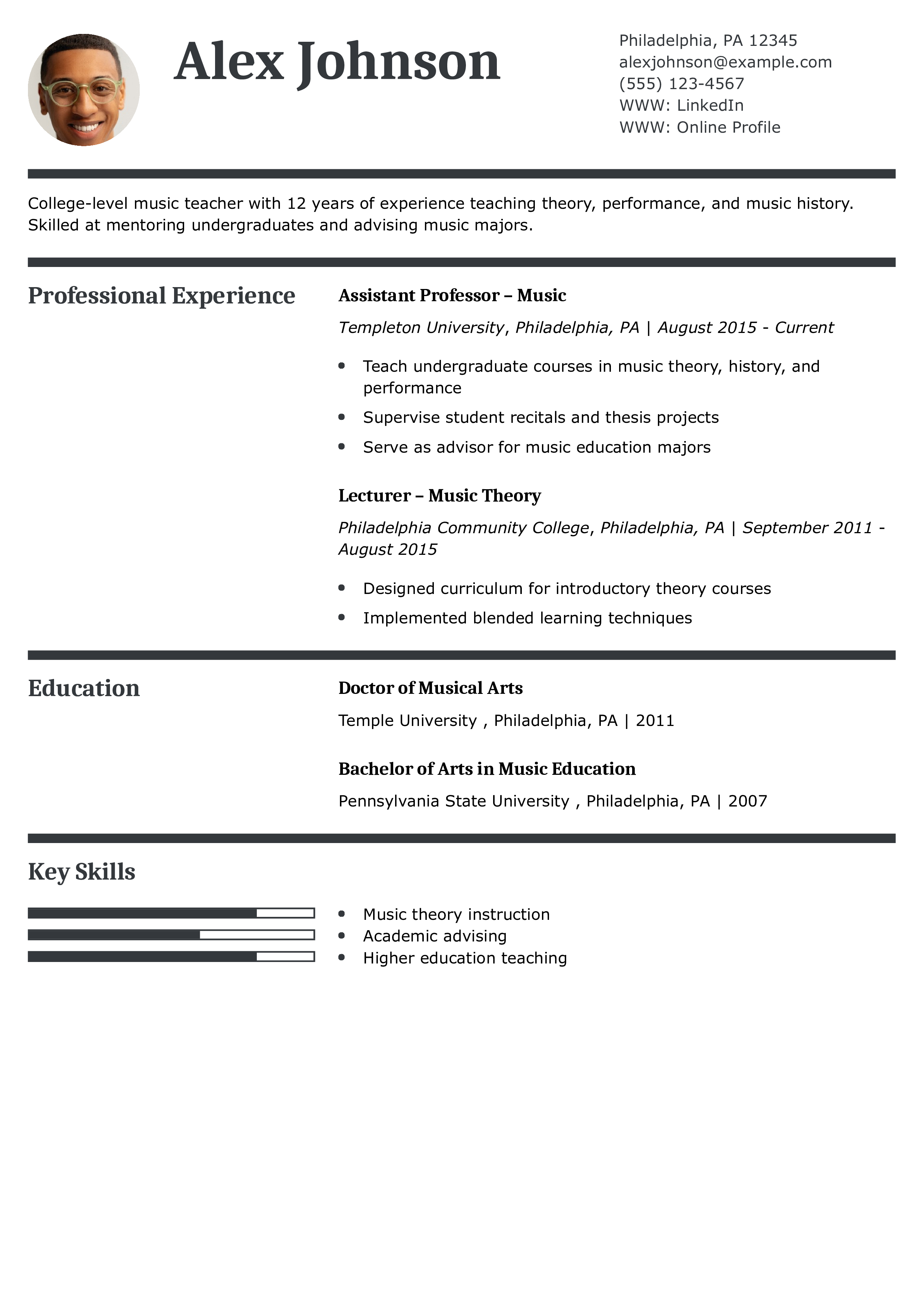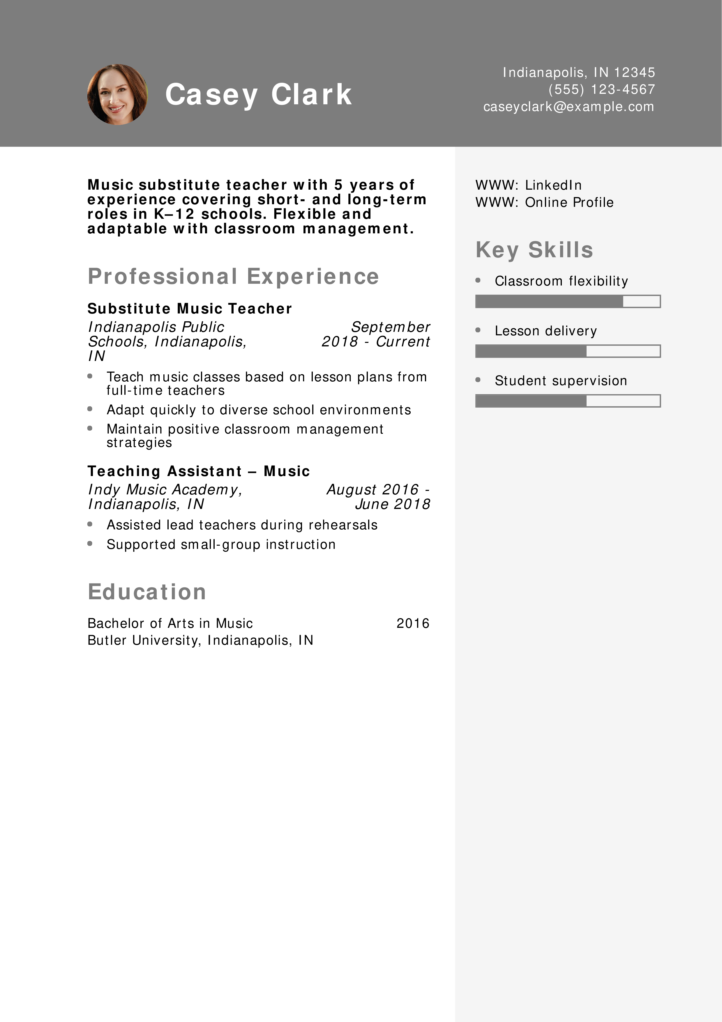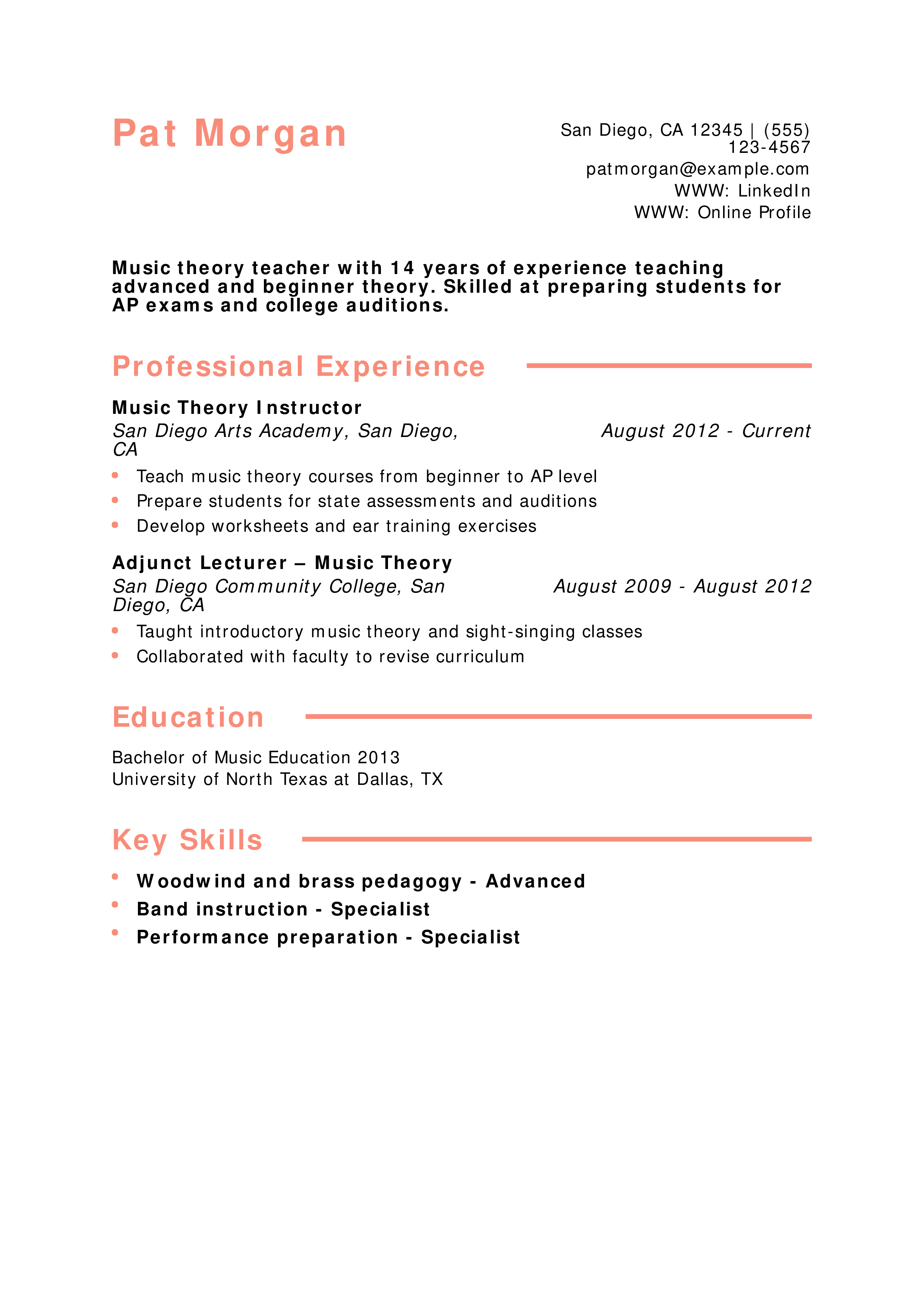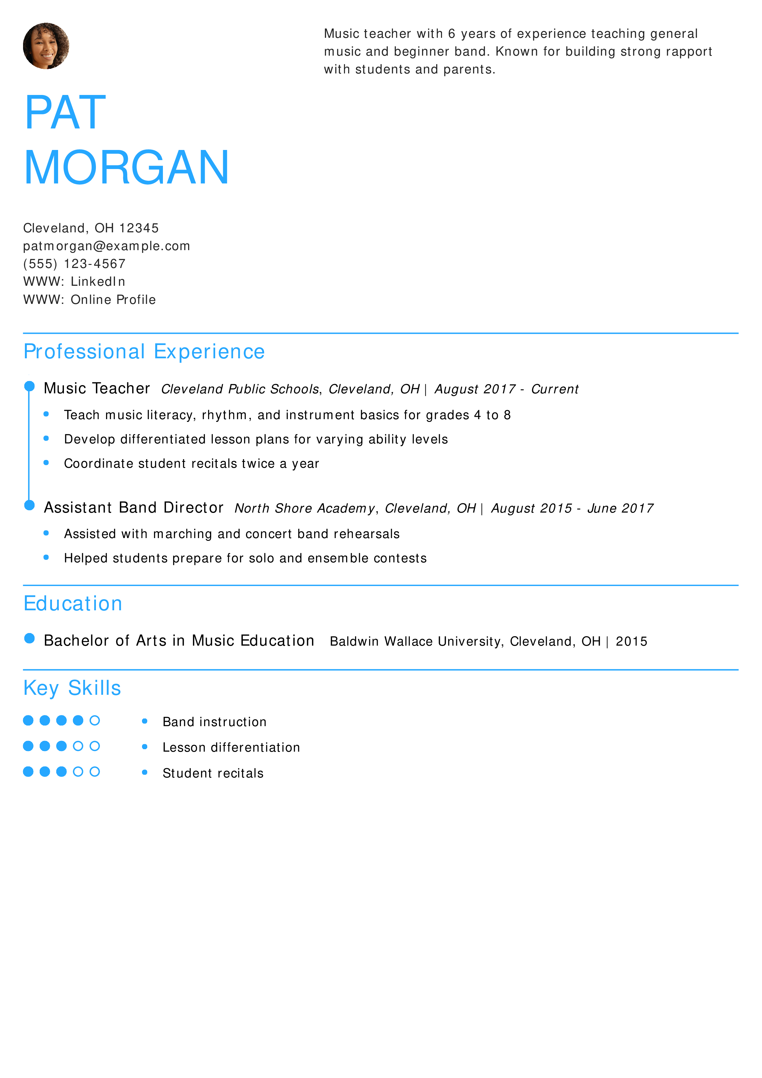 Music teachers combine strong subject knowledge and communication skills to excite people about music and the arts. For an effective music teacher resume, include a “Key Skills” section that gives the hiring manager an overview of your expertise. This also optimizes your resume for application tracking systems (ATS) that filter the documents for hiring managers. Including keywords from the job description in your resume will help you get through the initial screening. Consider including terms like those below: