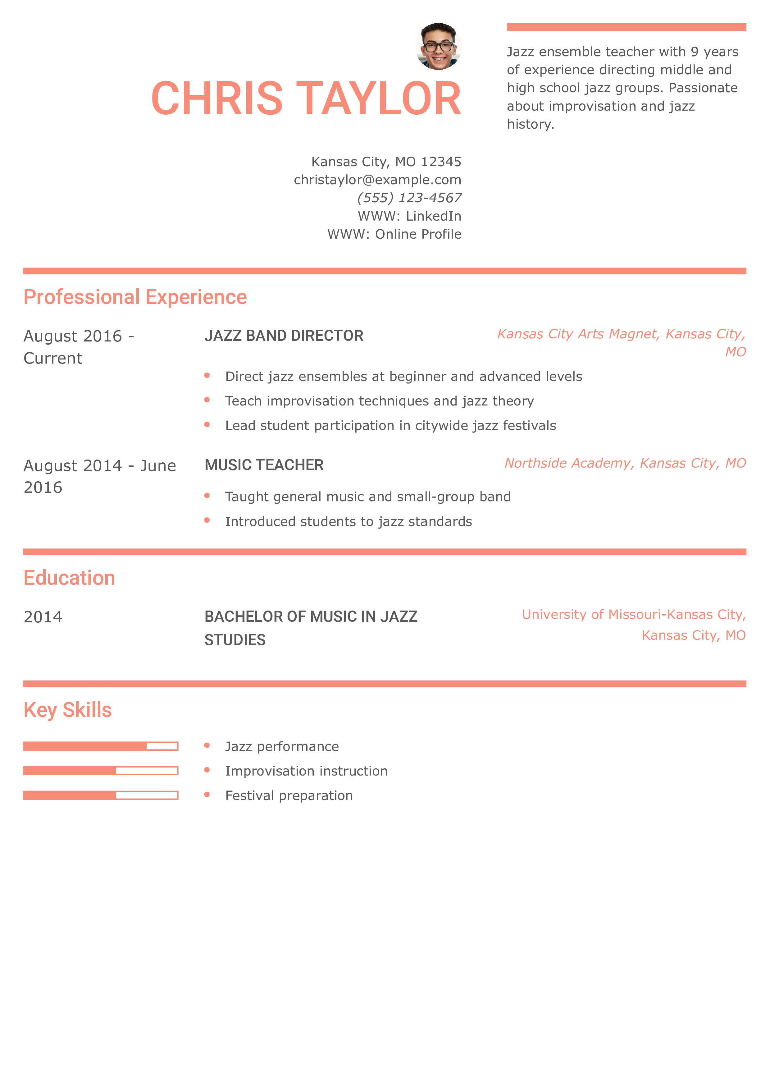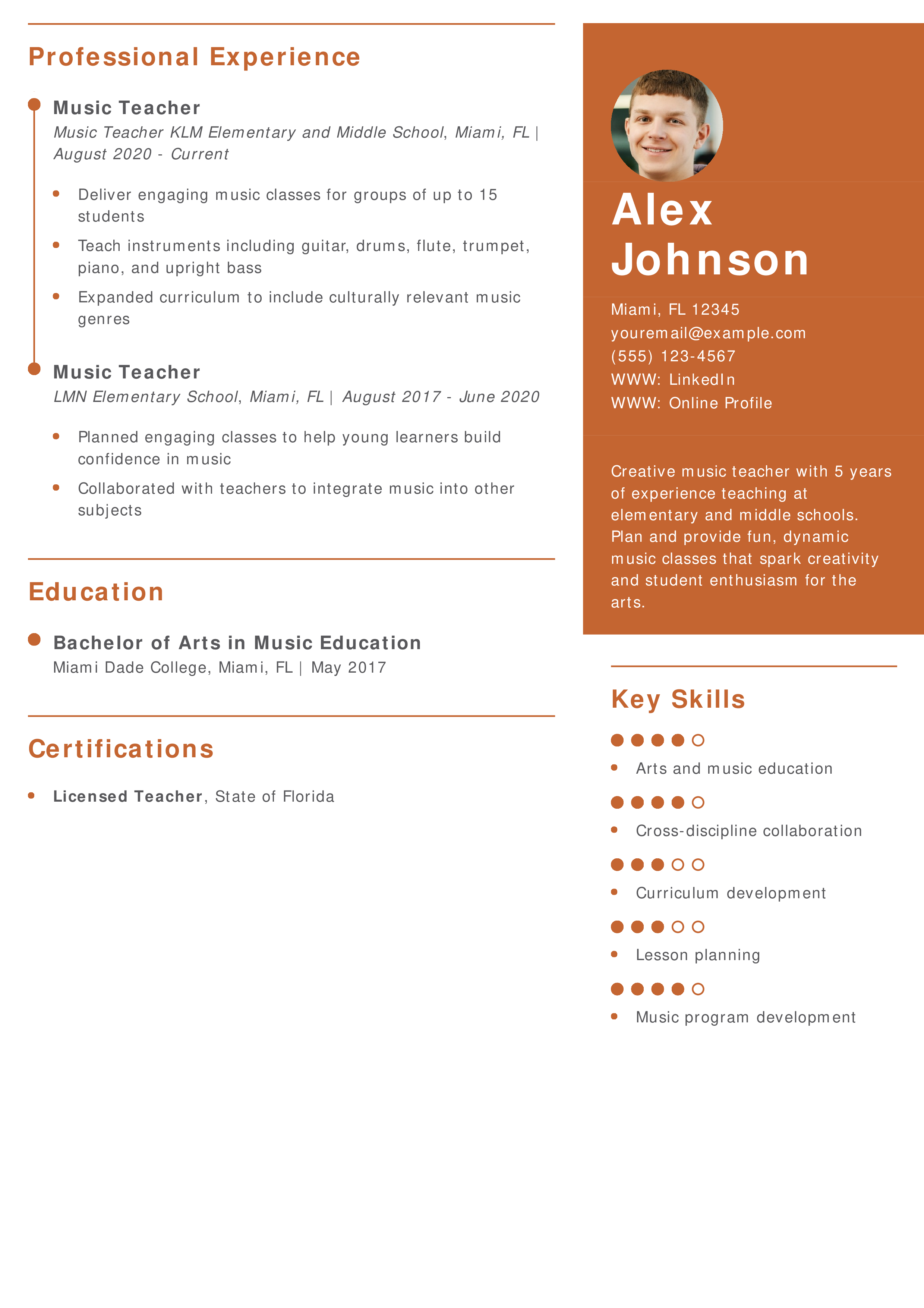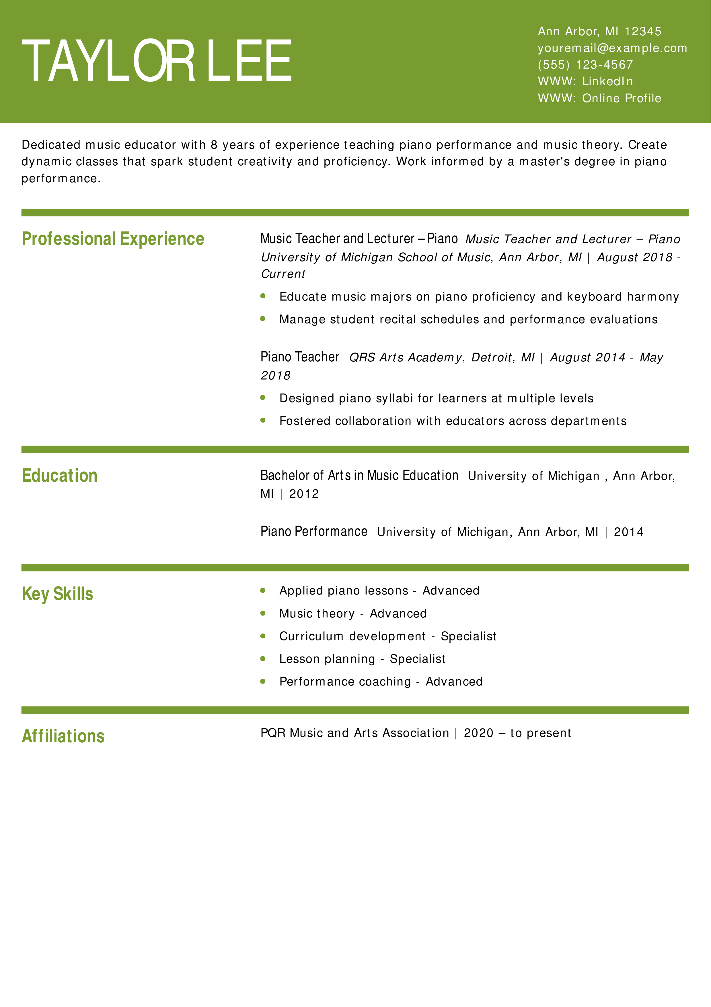 When it comes to picking the right resume template, it needs to strike the right chords with potential employers or schools. Opt for a template that reflects your creativity and professionalism, showing your passion for music and teaching. However, keep it clean and easy to read, just like a well-written sheet of music. Heavy use of colors and elaborate graphics may give a unique look, but they can distract the reader from the content of your resume.