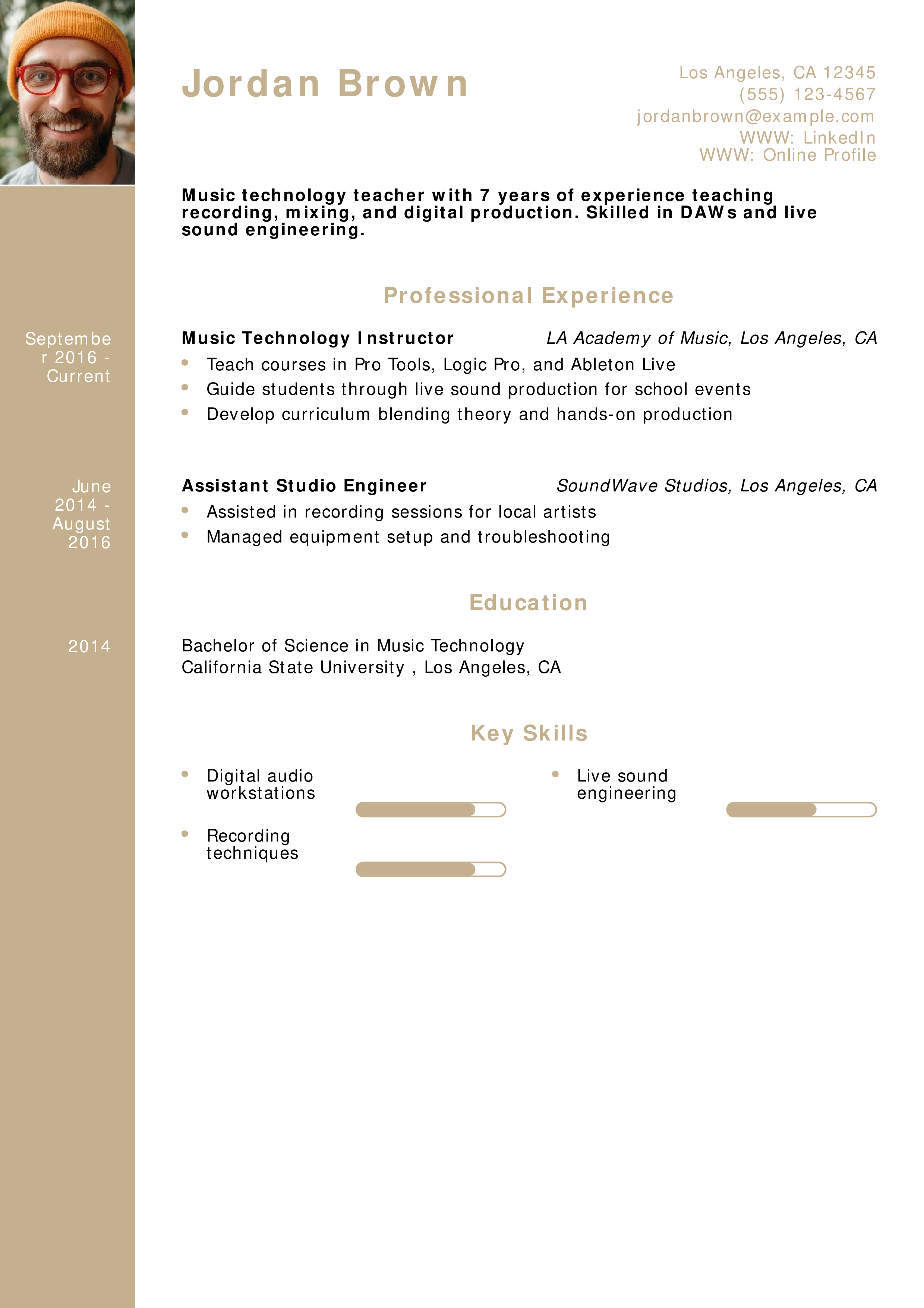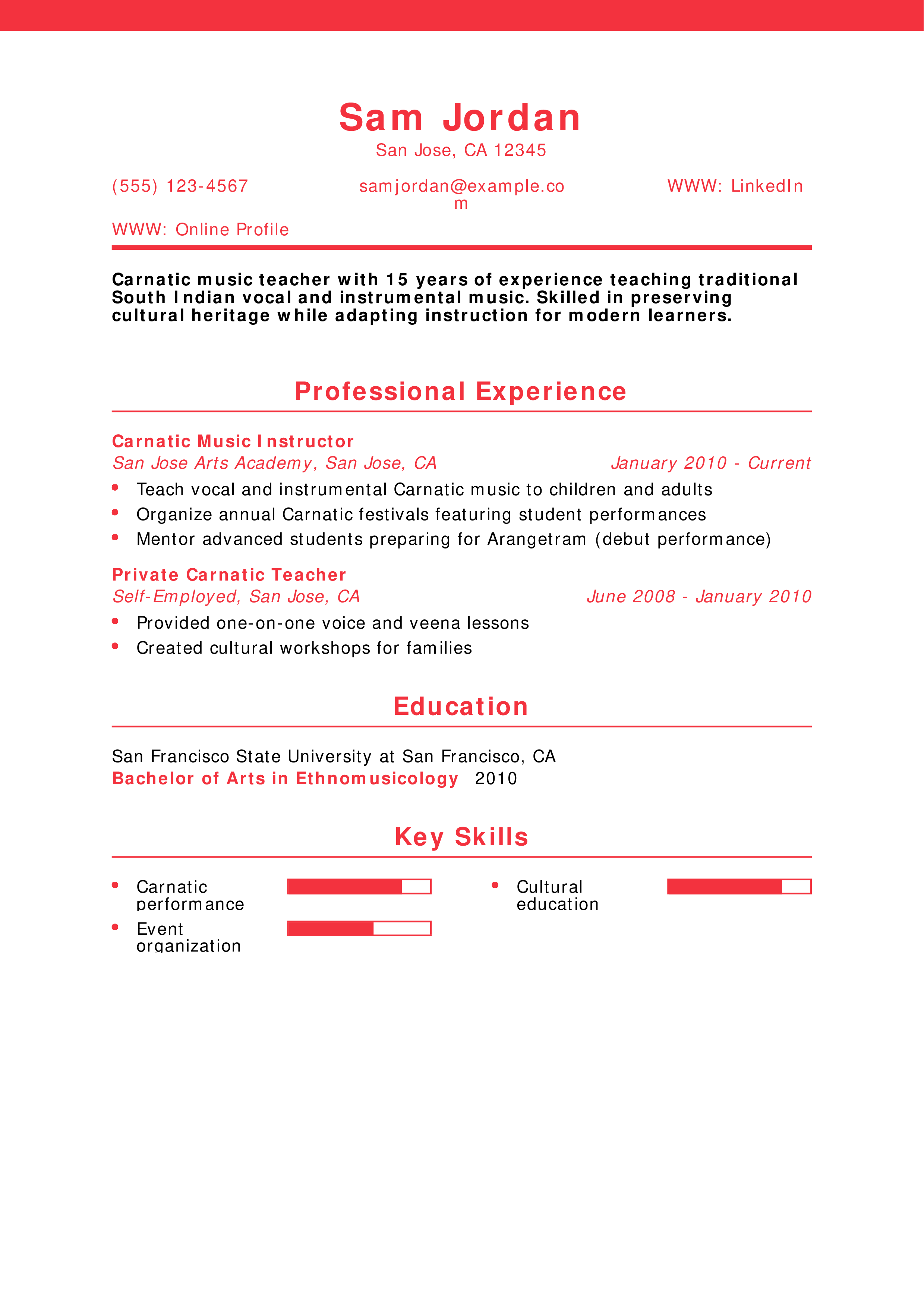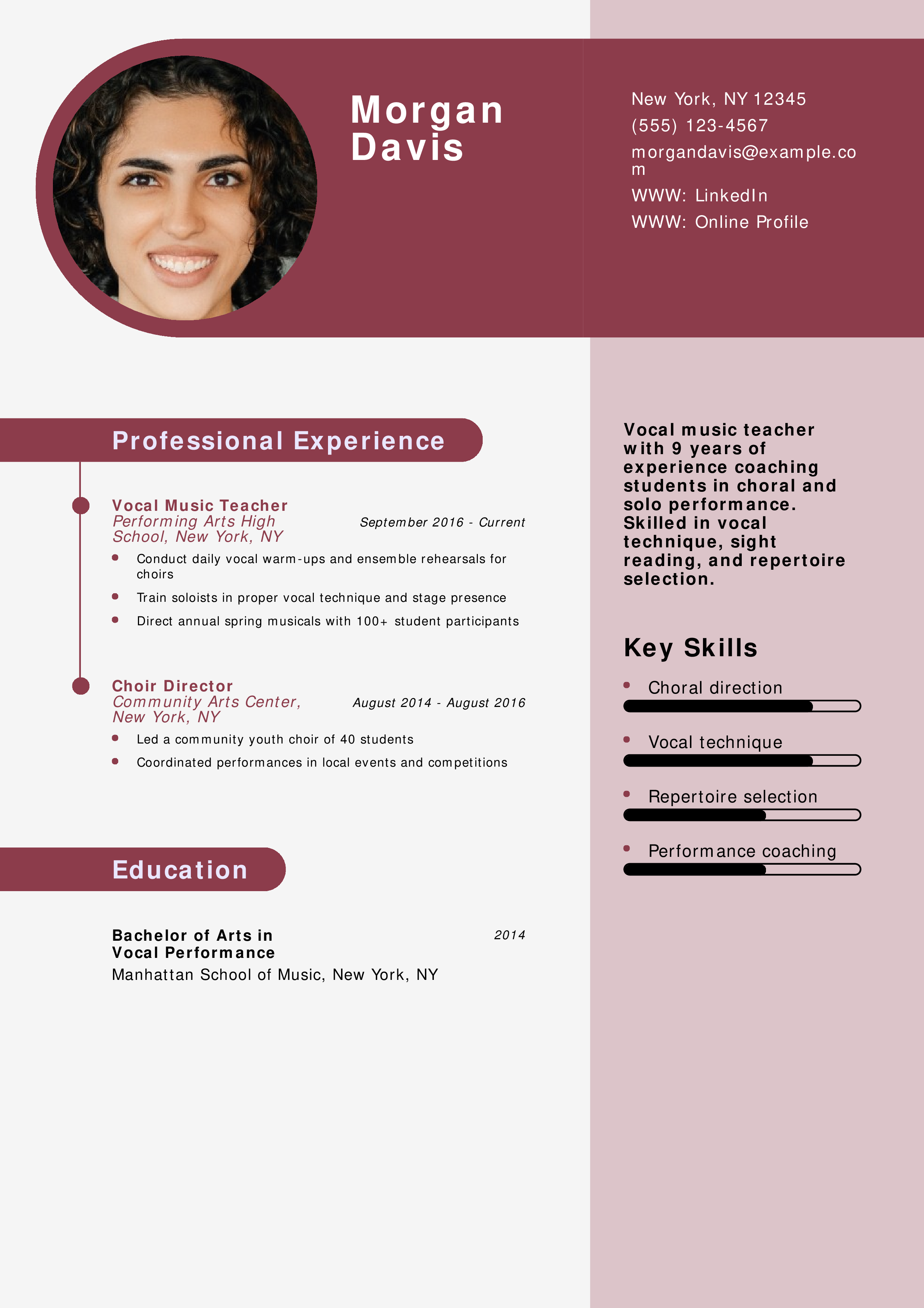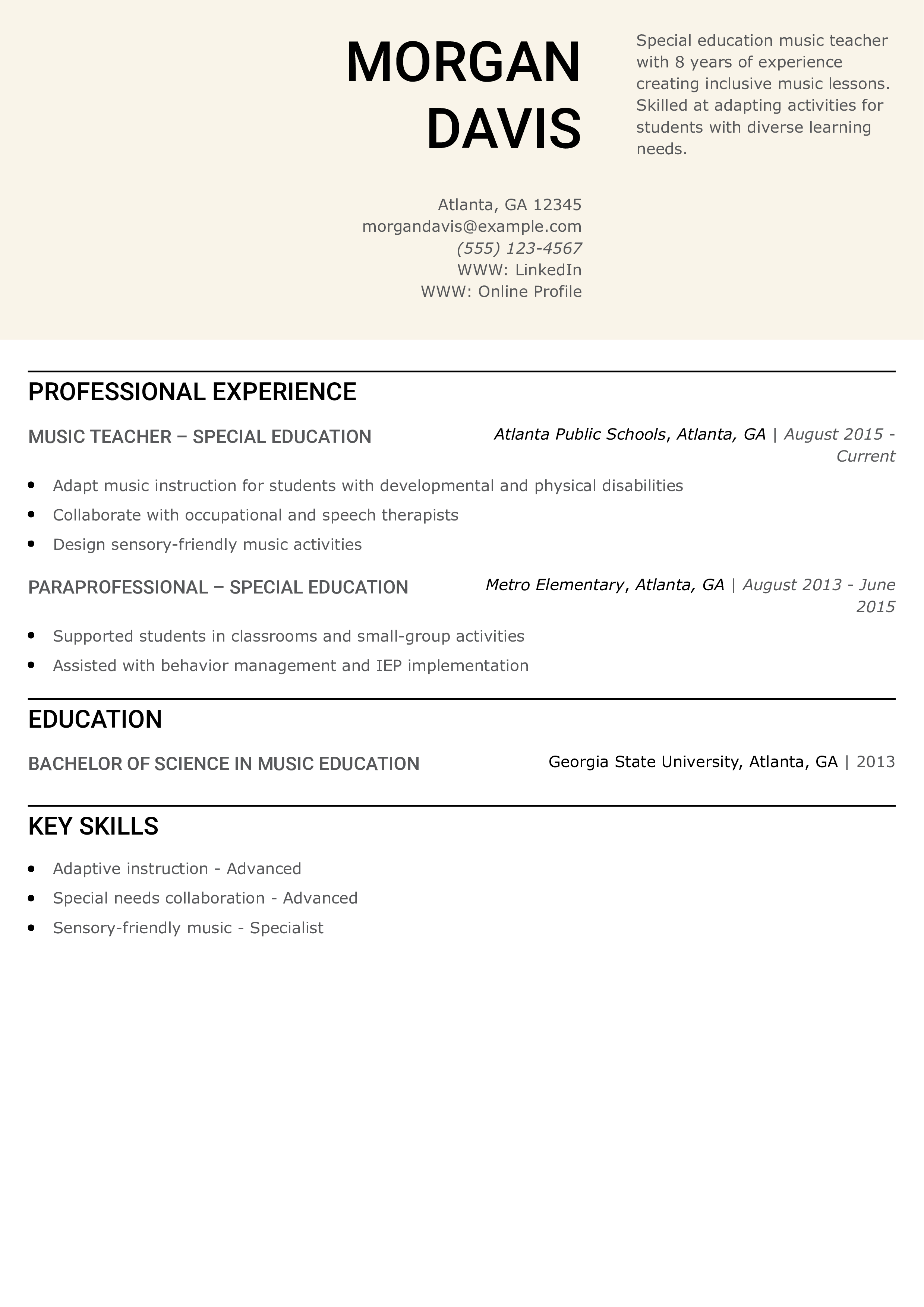 When it comes to picking the right resume template, it needs to strike the right chords with potential employers or schools. Opt for a template that reflects your creativity and professionalism, showing your passion for music and teaching. However, keep it clean and easy to read, just like a well-written sheet of music. Heavy use of colors and elaborate graphics may give a unique look, but they can distract the reader from the content of your resume.