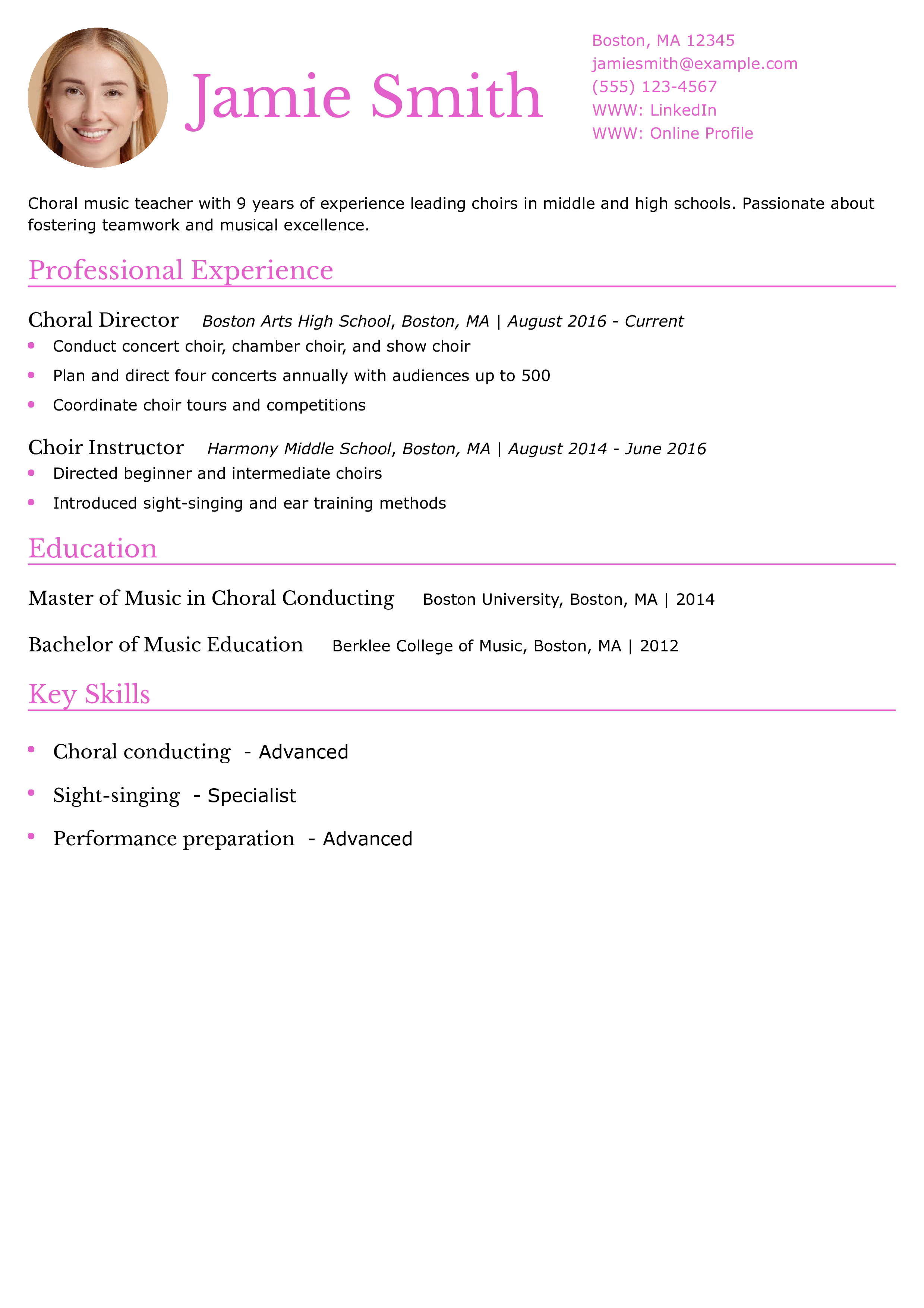 A one-page resume is ideal for most music teacher positions, especially if you have less than 10 years of experience. For experienced professionals, a two-page resume may be appropriate, but only if it includes valuable, job-relevant content. Focus on showcasing your key achievements, certifications, and skills that align with the job description.