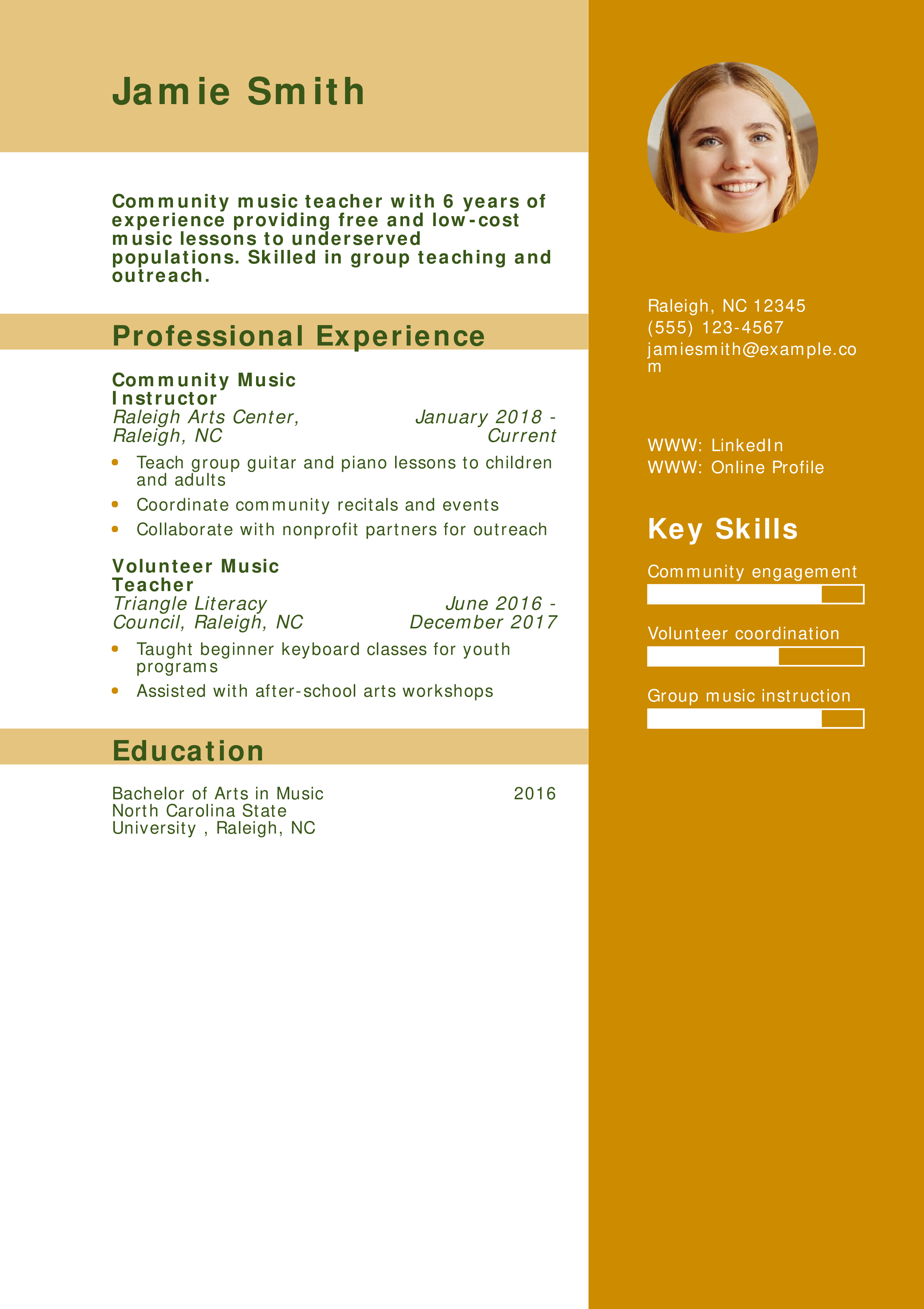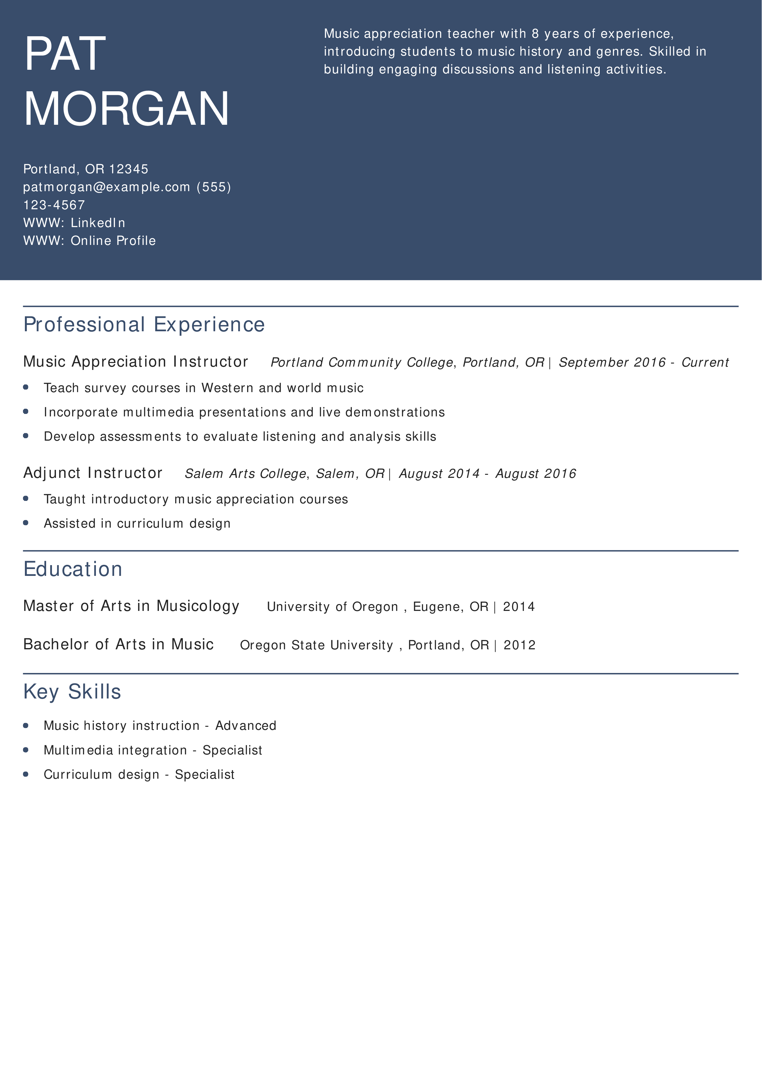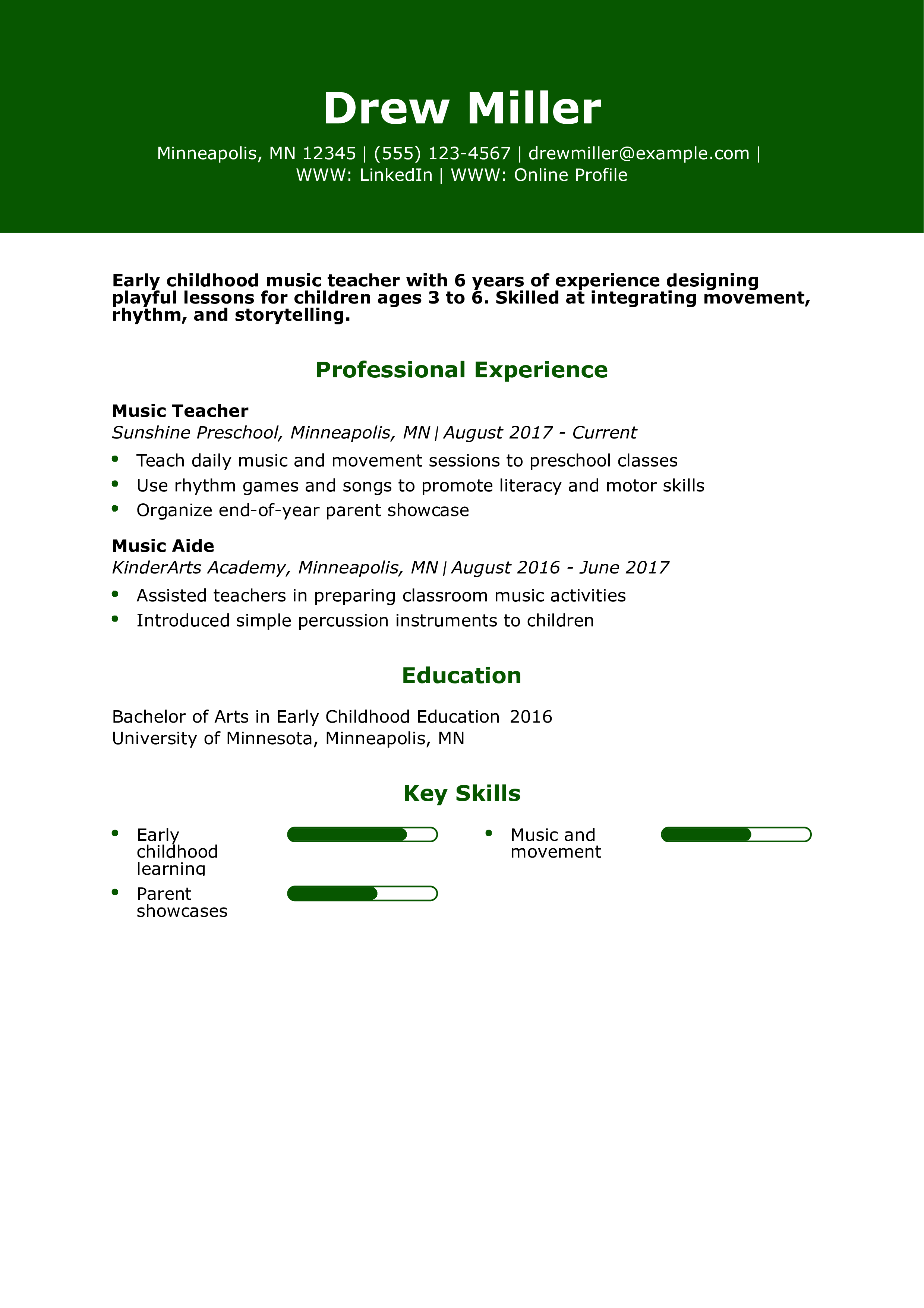 Music teachers combine deep technical knowledge with strong pedagogical skills, motivating students to express themselves musically. But how do you capture those themes on a clear, concise resume? You may be unsure where to start.