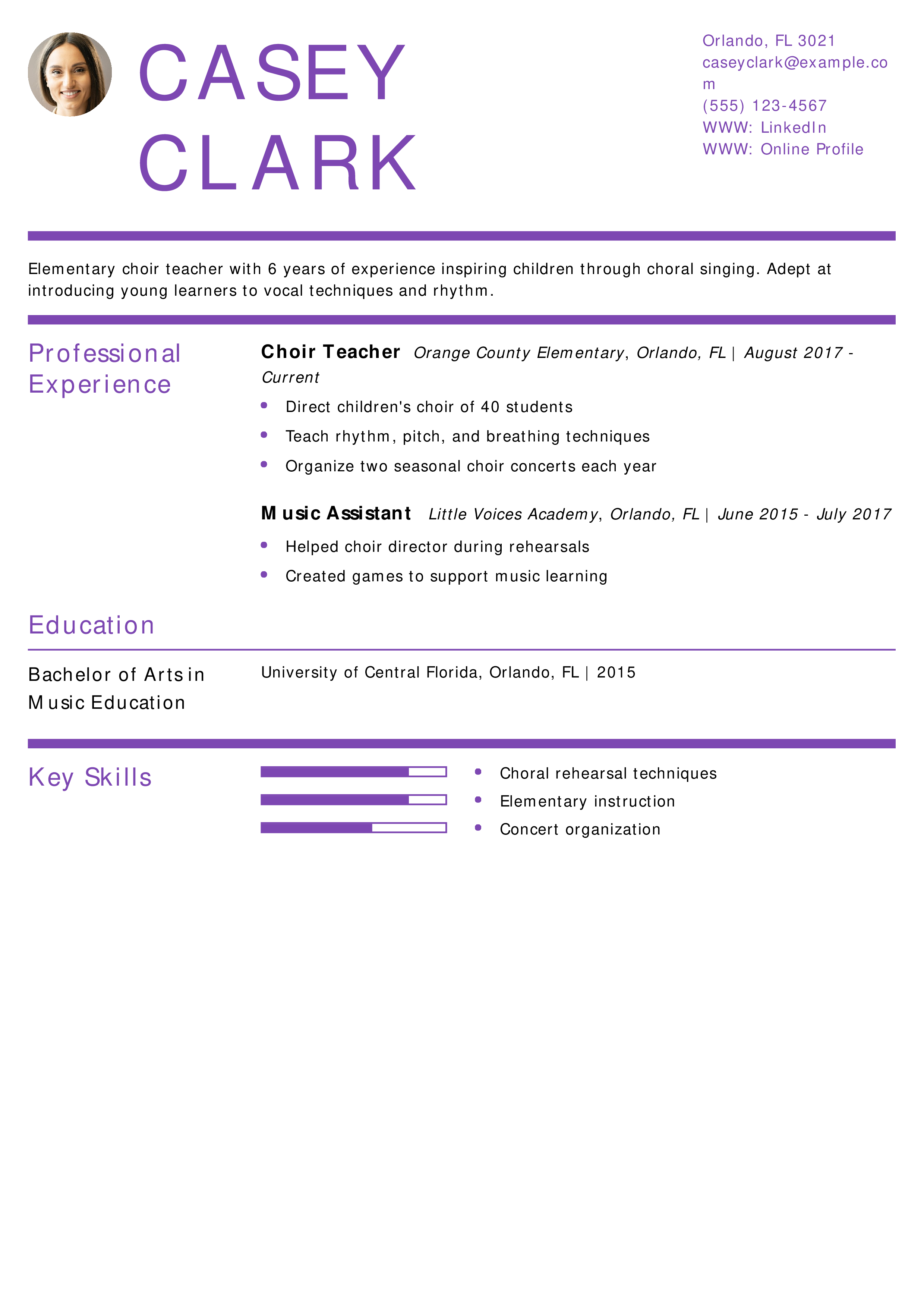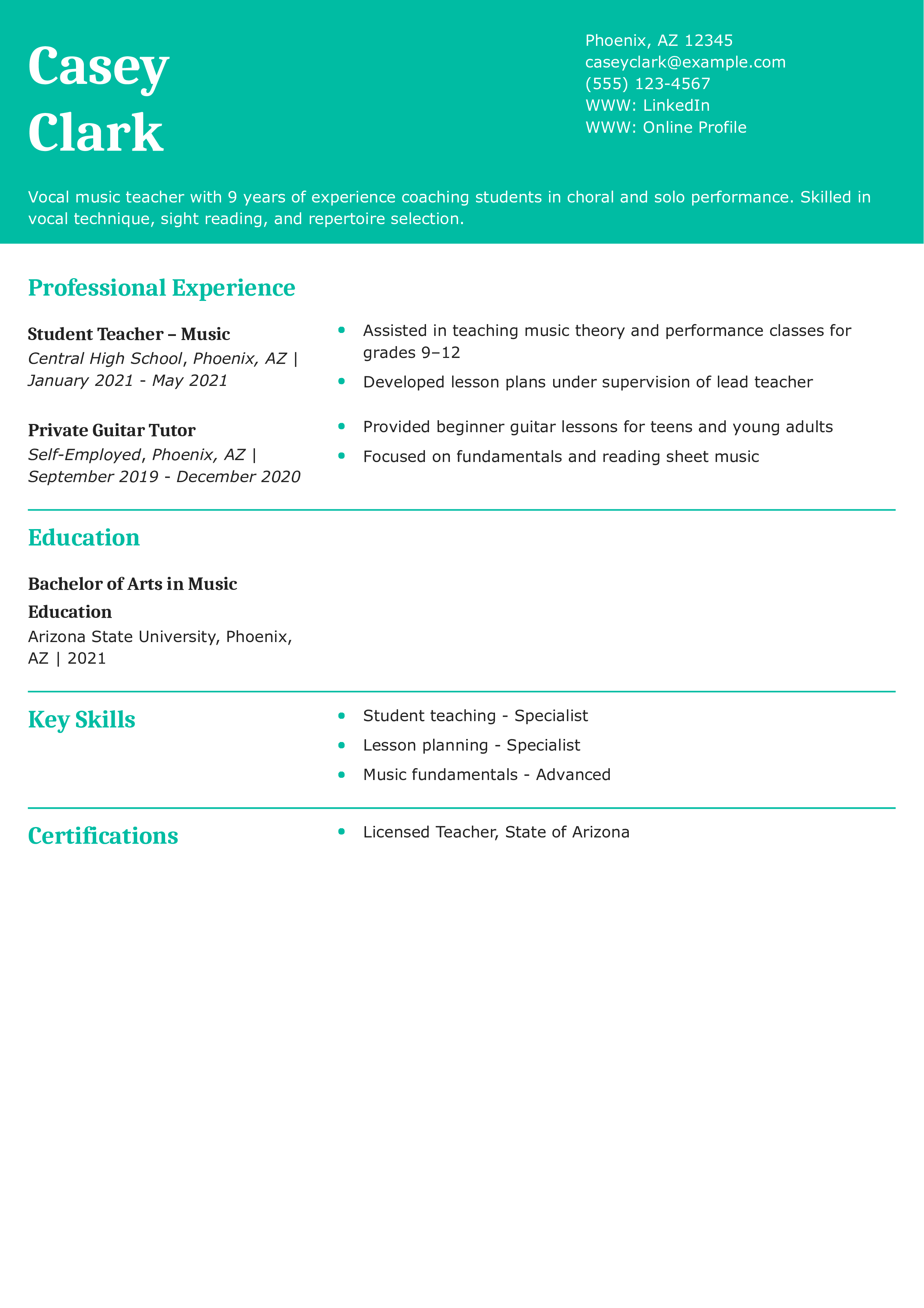 A chronological resume is often the best choice for music teachers as it emphasizes a strong background in hands-on experience teaching students over a long period of time. Schools can easily see your career progression and everything you’ve accomplished for as long as you’ve been a music teacher. However, a combination format can be a good option for entry-level educators or those who would rather highlight their skills, education, and certifications over their work history.
