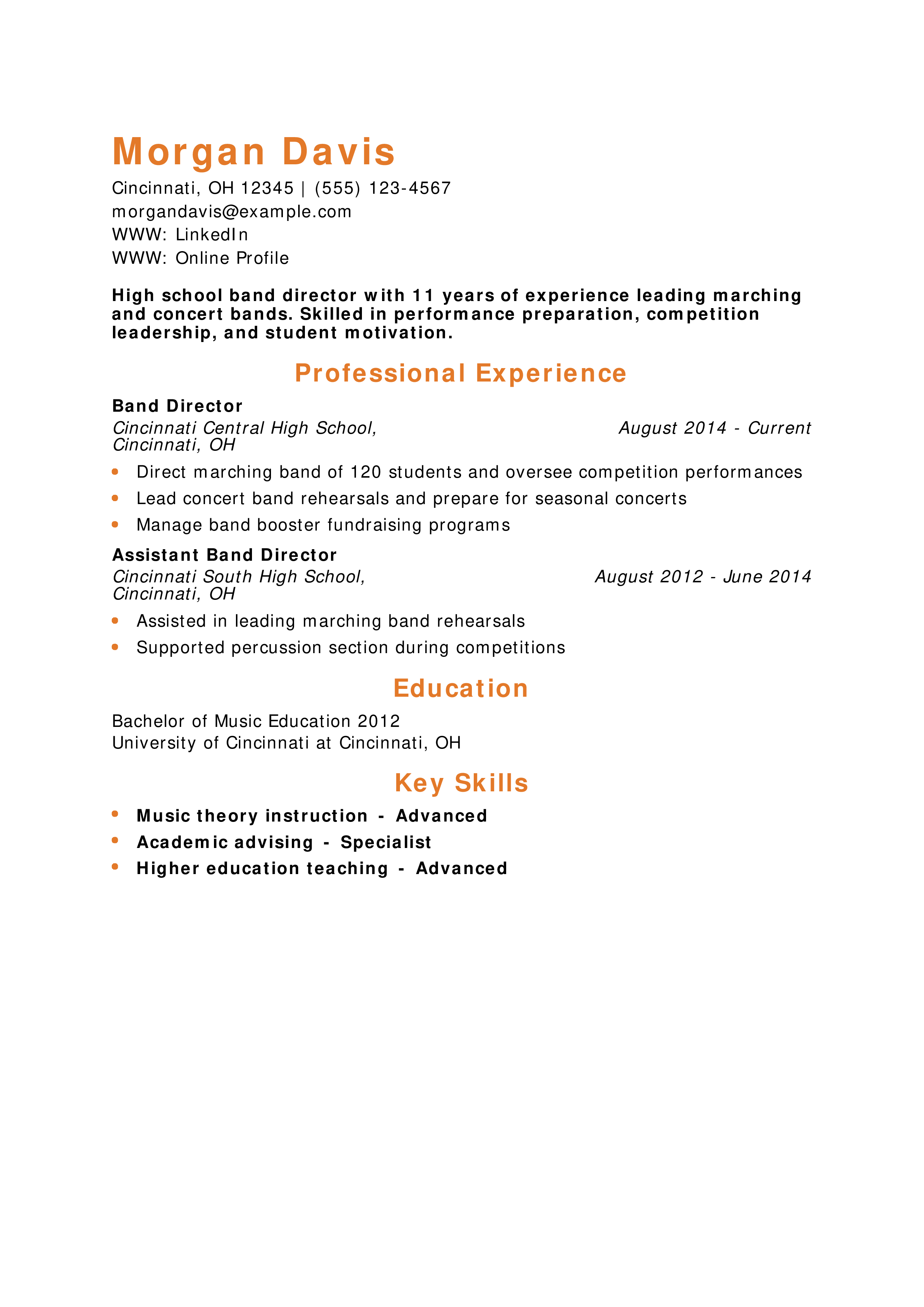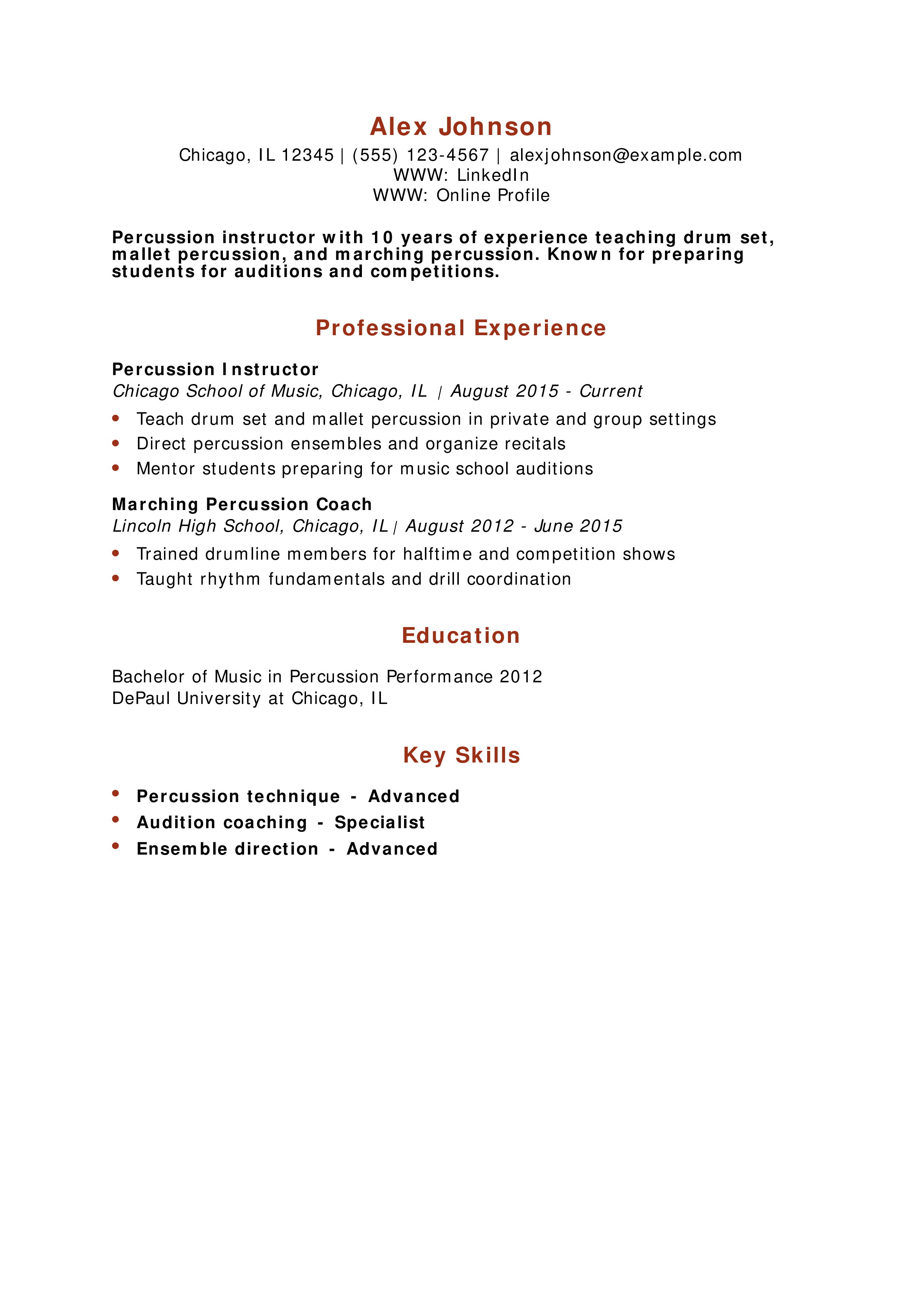This resume is strong because it blends ensemble leadership with private teaching. Learn more about resume organization at Resume Outline Examples.