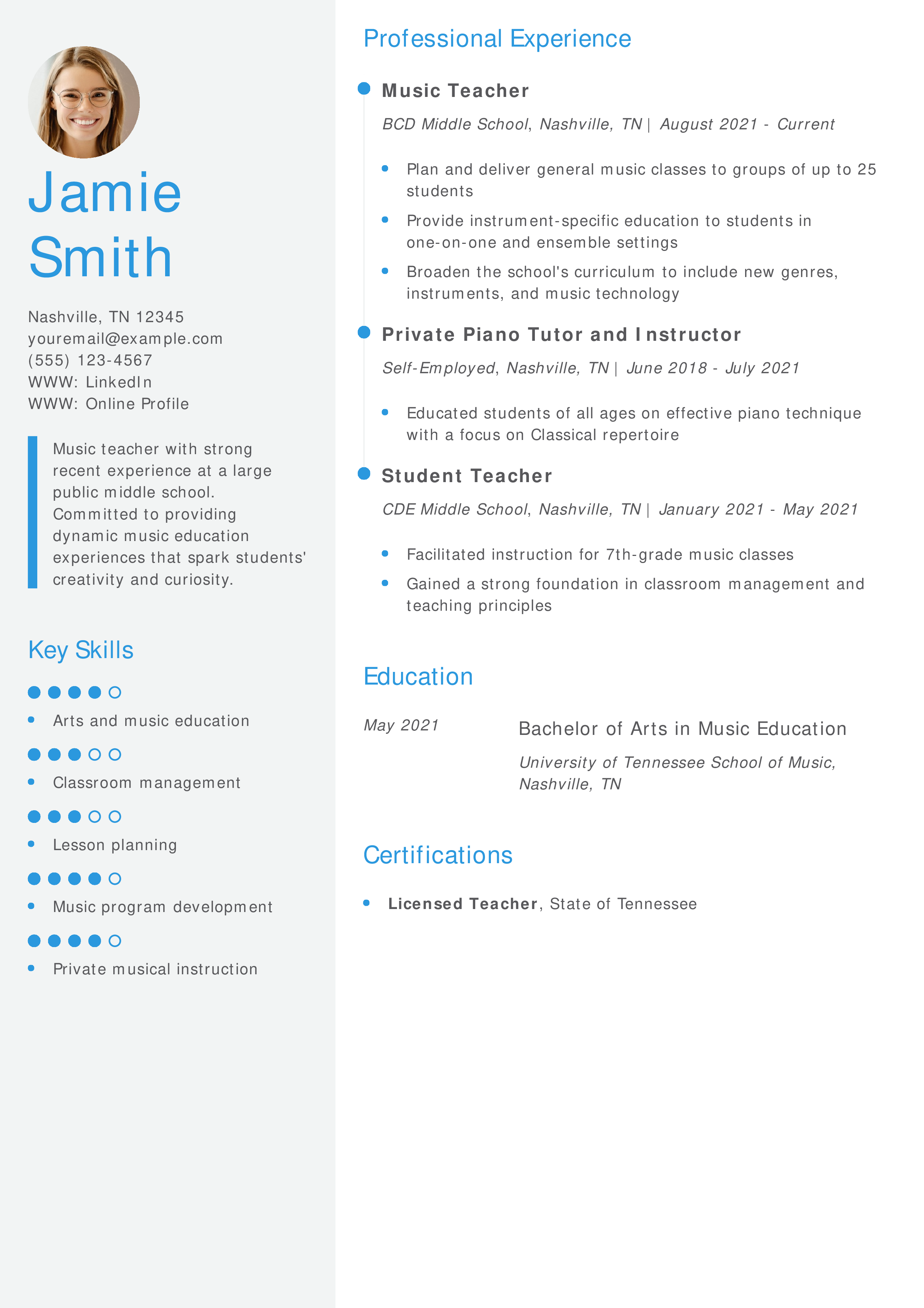 If you’re a music teacher within a public or private school system, your education section is a vital part of your resume. Be sure to include your highest degree and any state licenses required for the job. In addition to your education and licensing, list any relevant certifications you may have earned during your career.