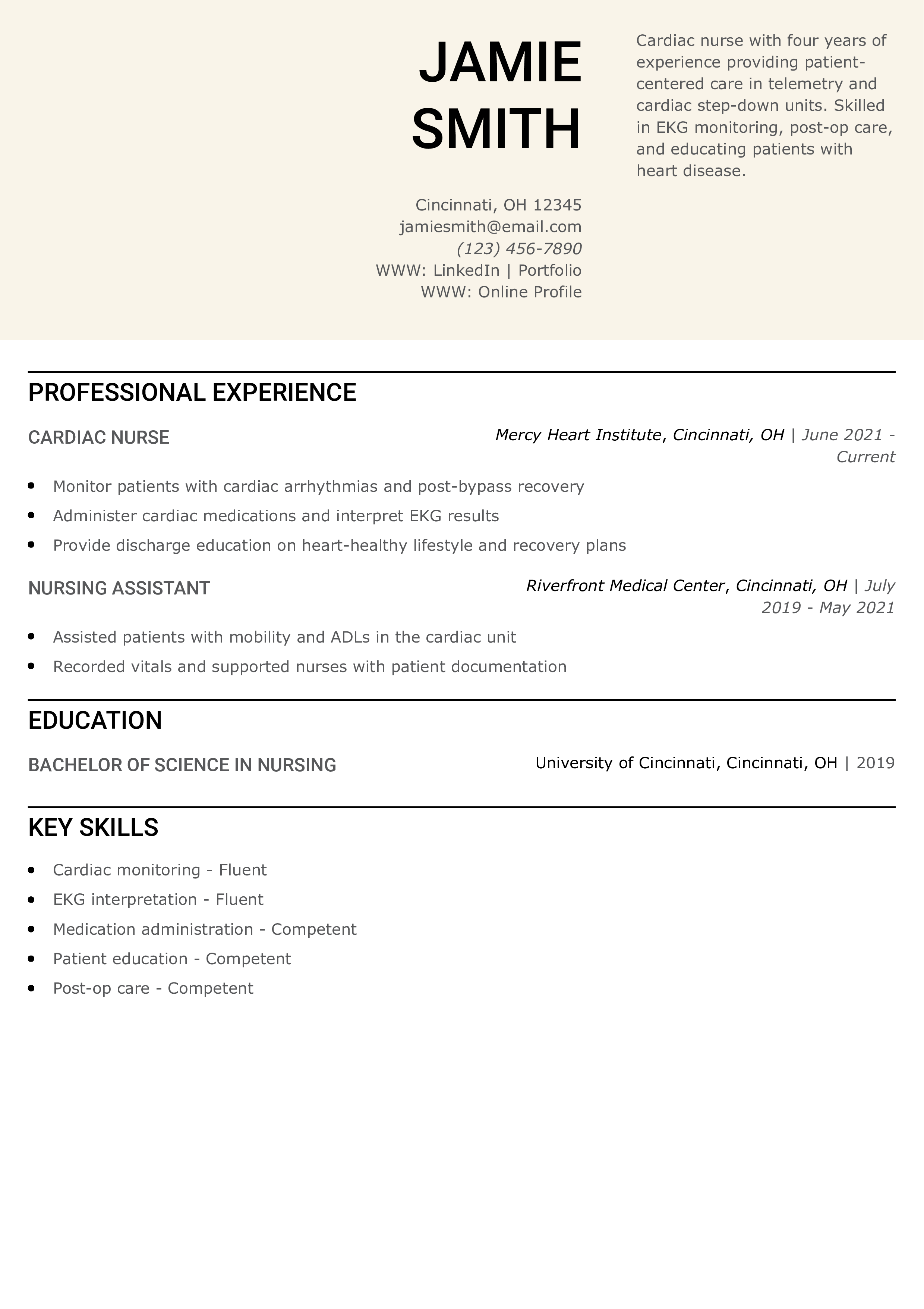 This resume highlights technical skills like EKG monitoring alongside patient education, a strong balance in cardiac care.