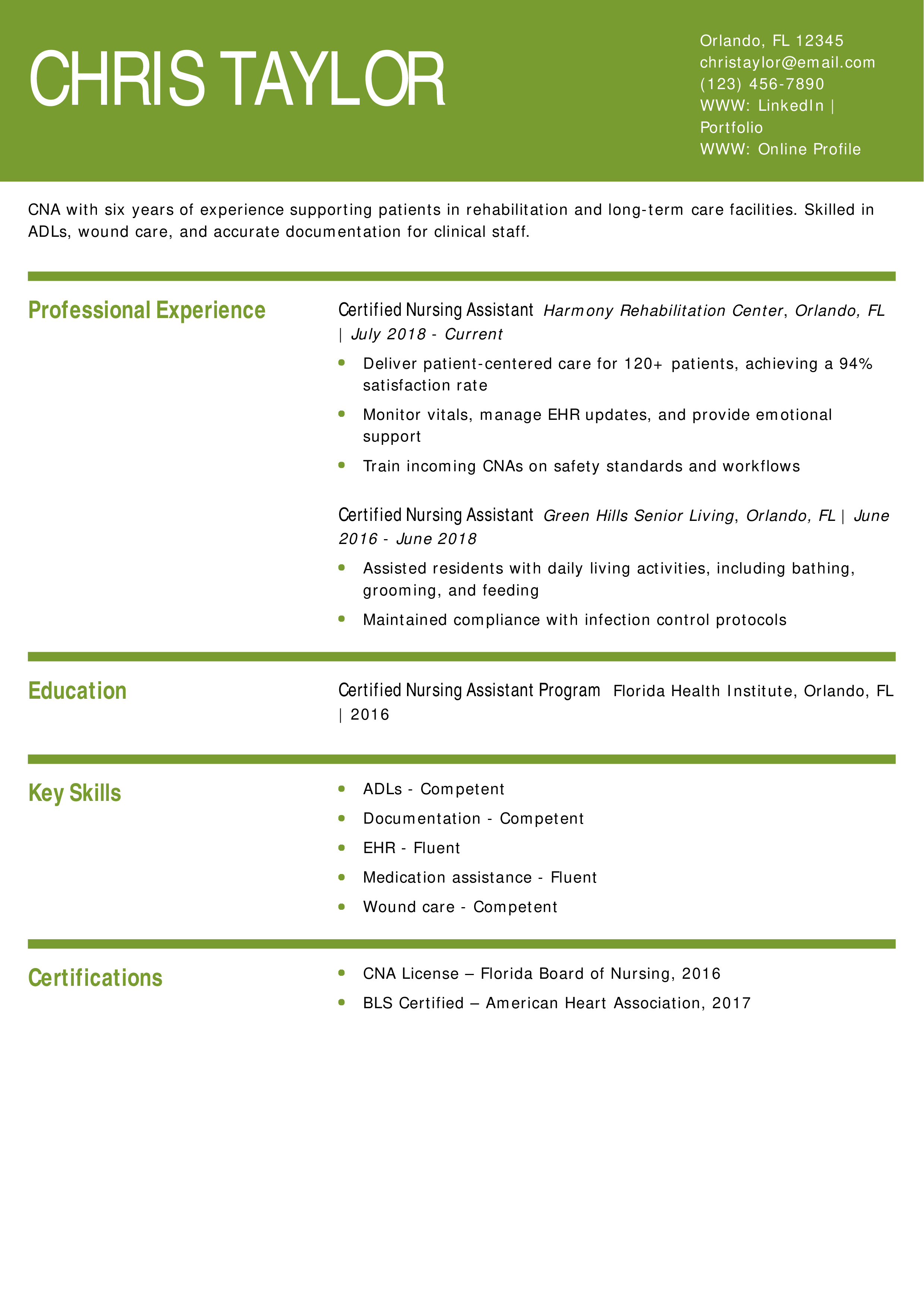 Always include your CNA license and state registration. Find more advice at resume skills.