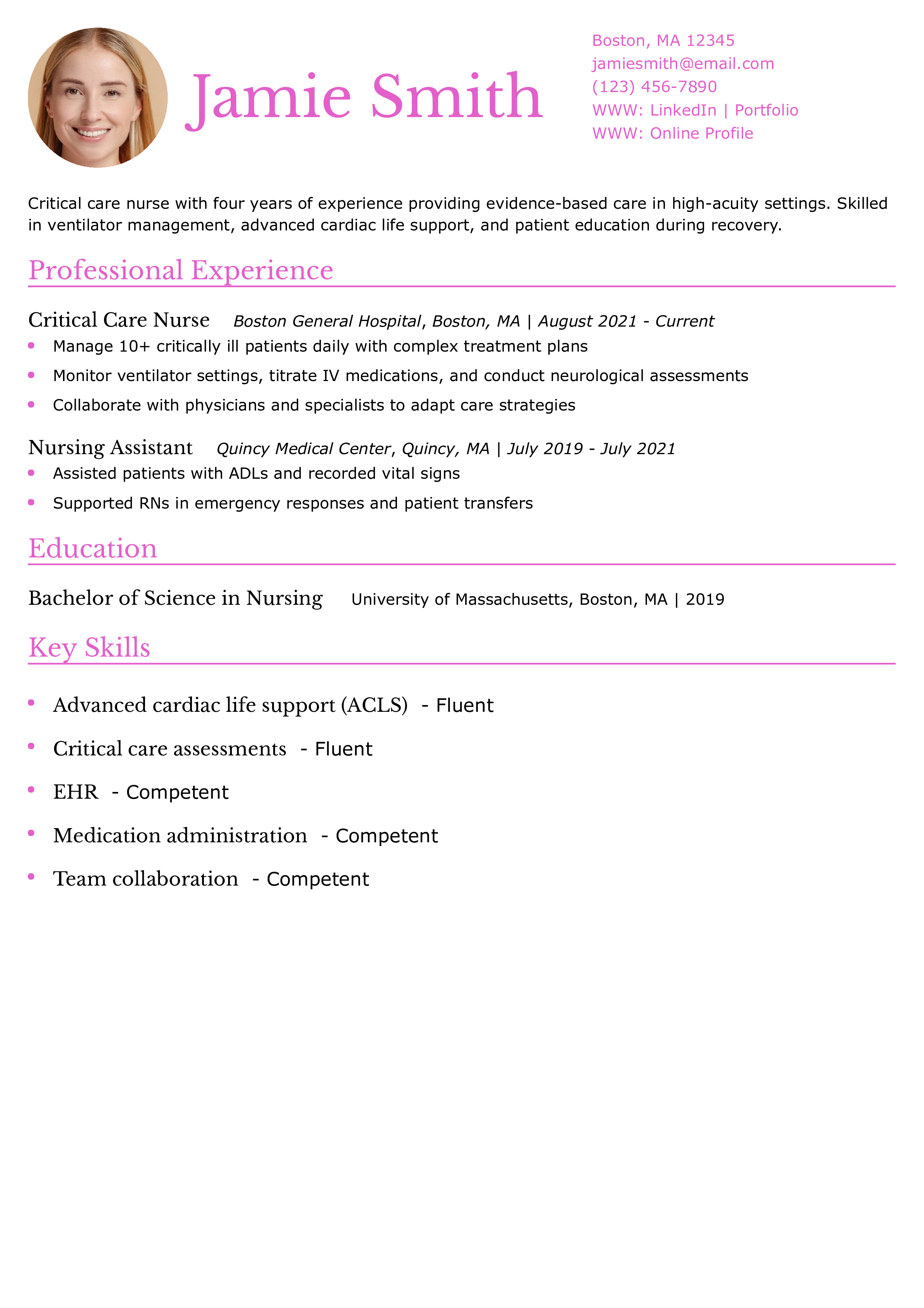 If you’re targeting ICU roles, emphasize specialized patient monitoring. For formatting guidance, see best fonts for a resume.