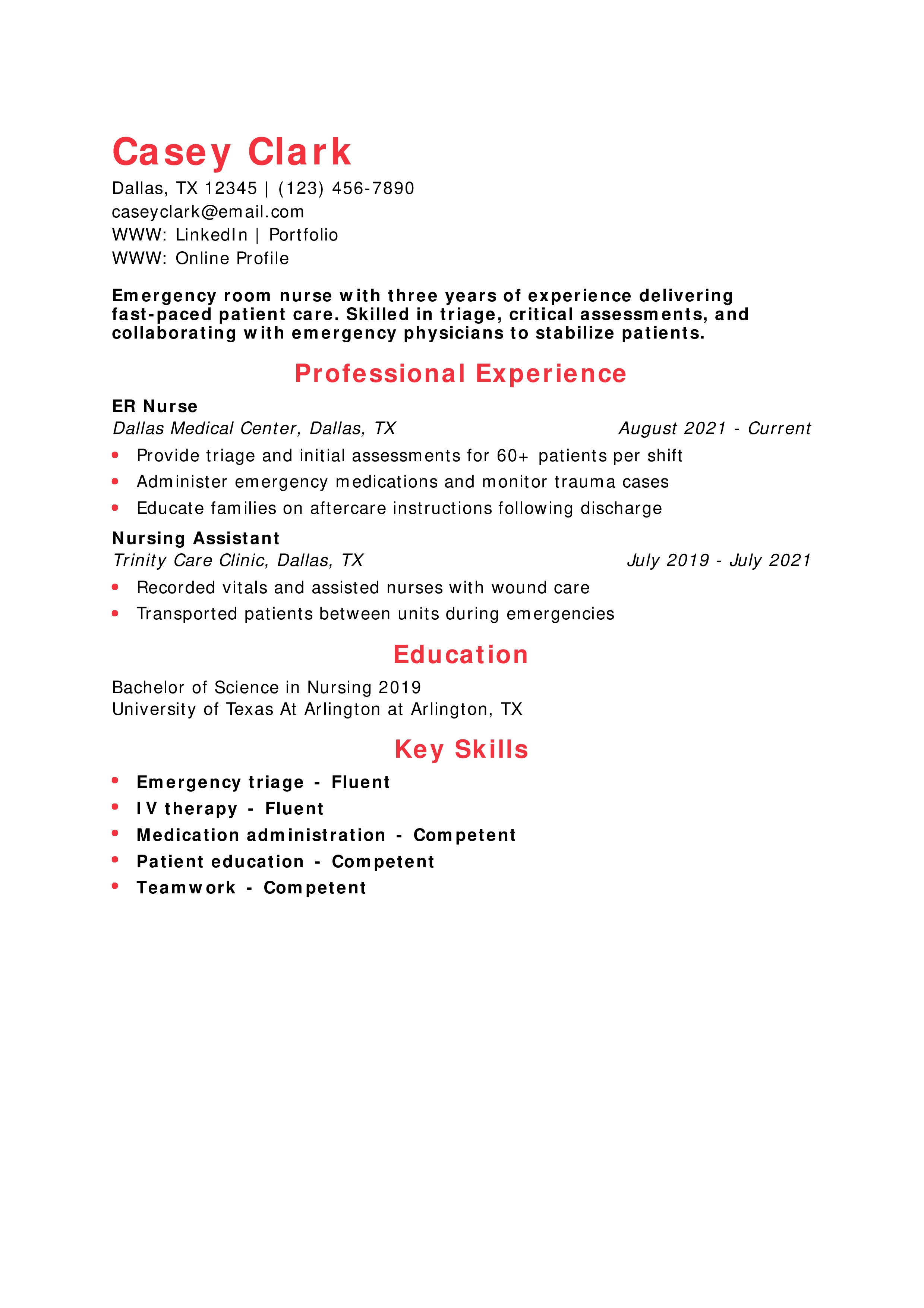 For ER roles, highlight triage and crisis-management skills. See customer service skills resume for tips on demonstrating communication in stressful settings.
