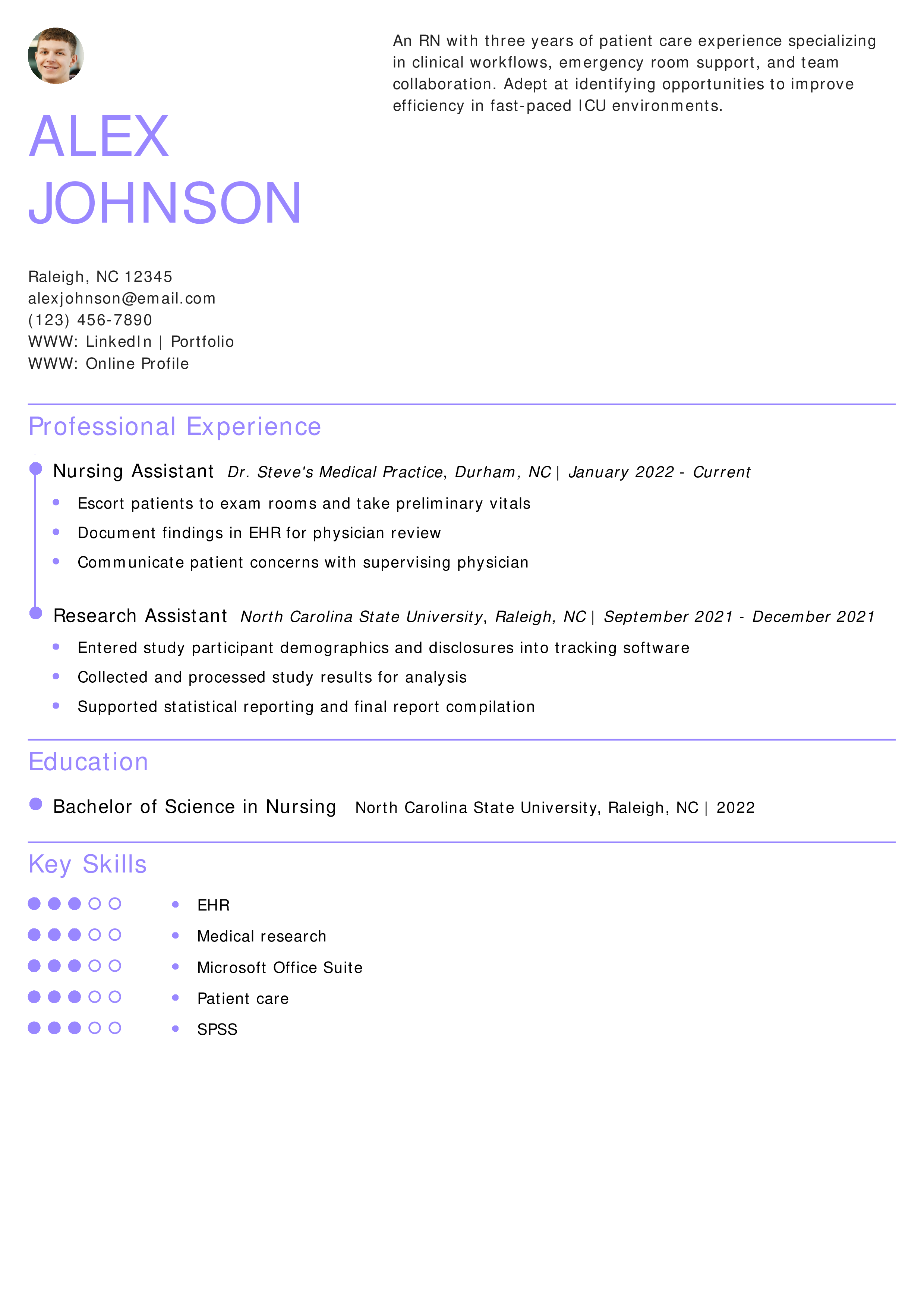 If your hands-on nursing experience is limited, highlight research and academic contributions. See more examples in resume summary examples.