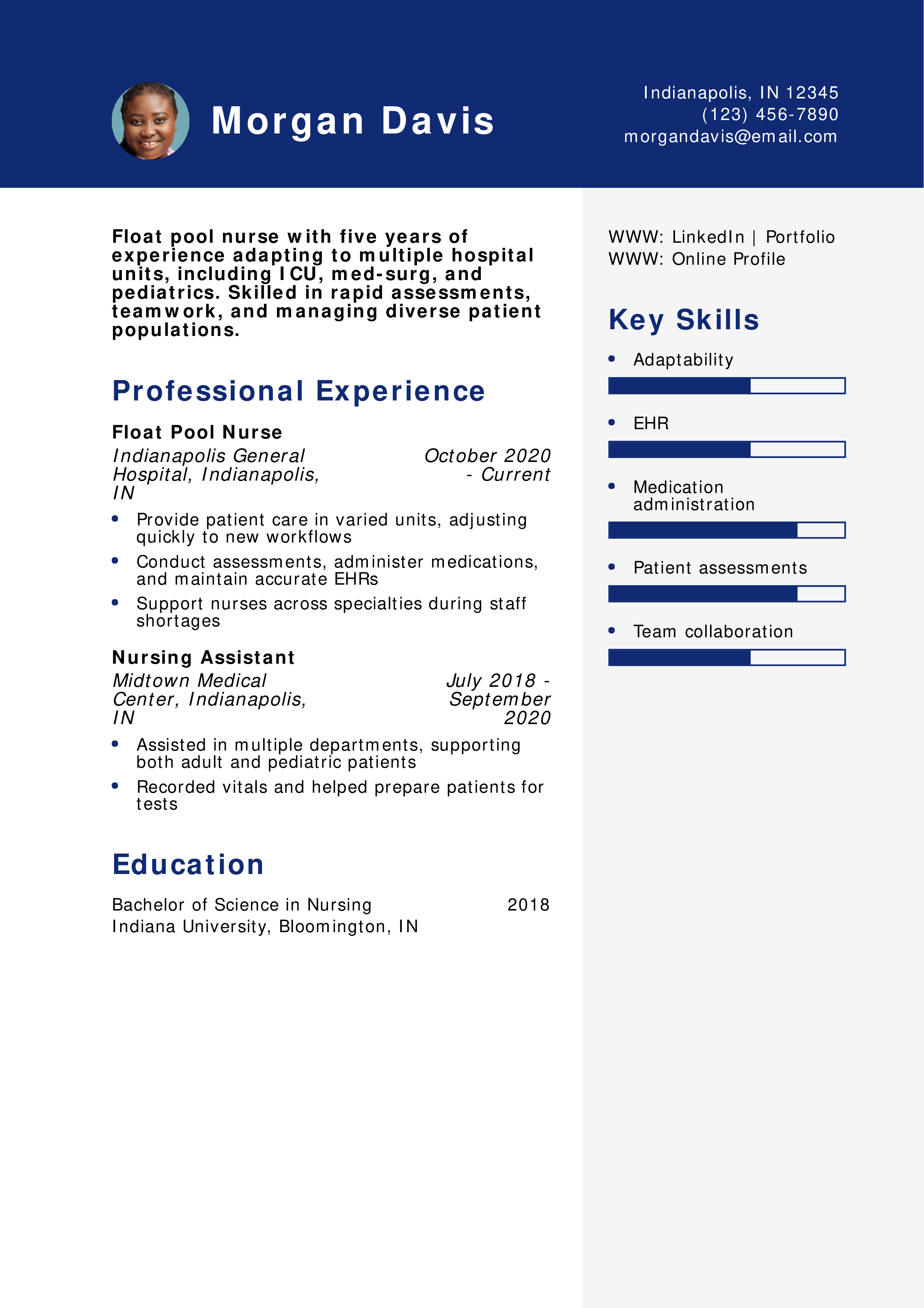 This resume highlights flexibility and adaptability, crucial traits for float pool nurses.