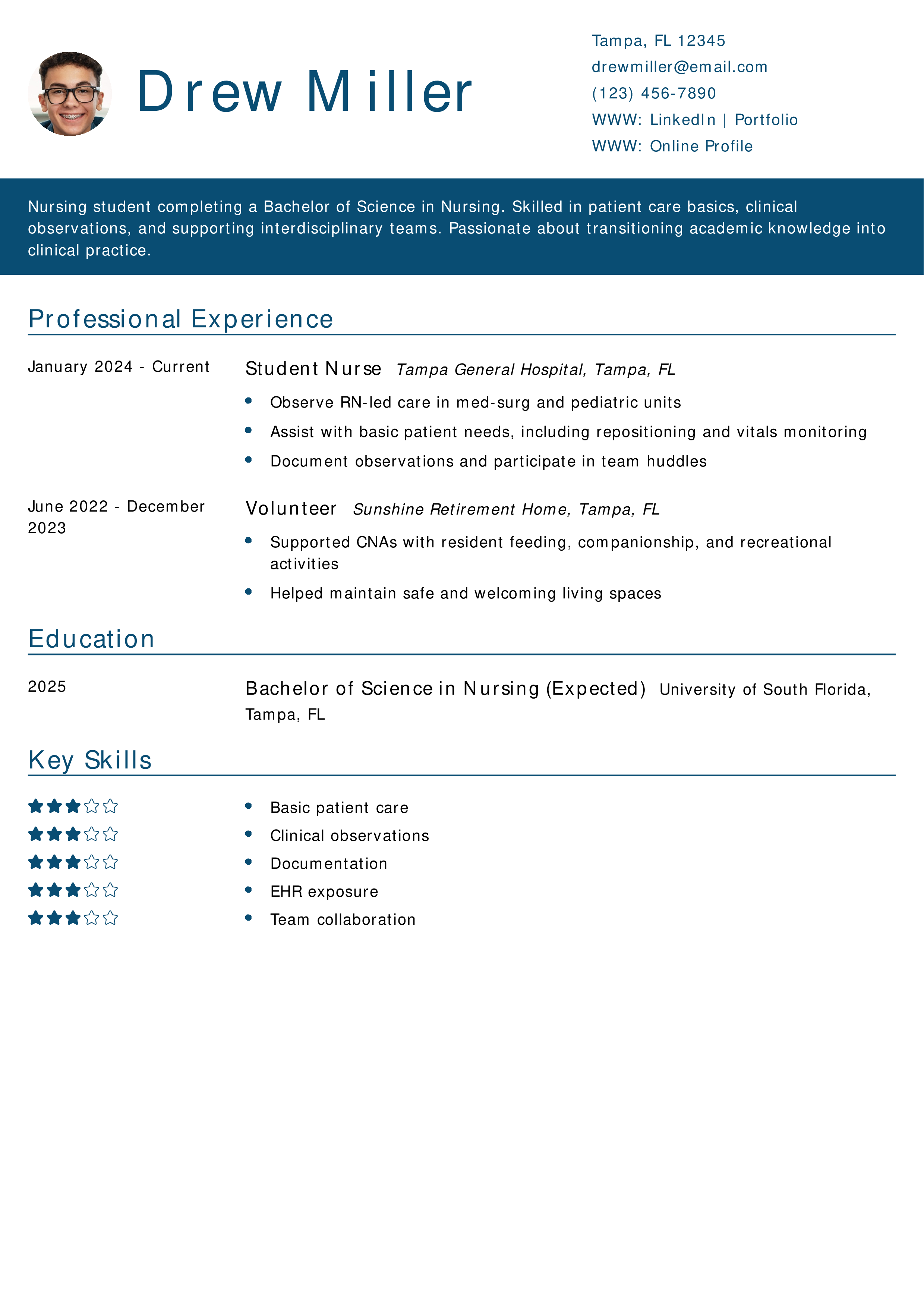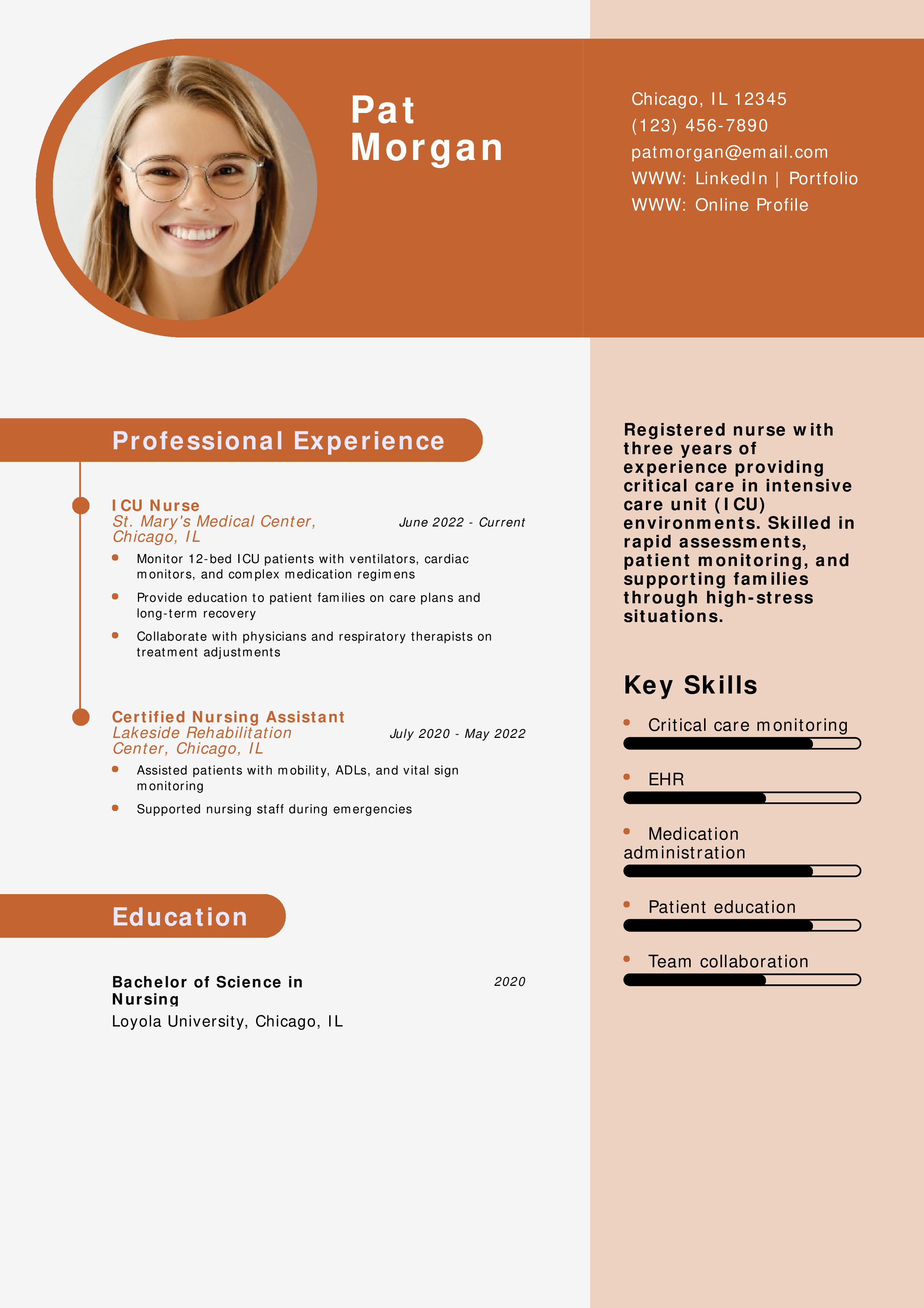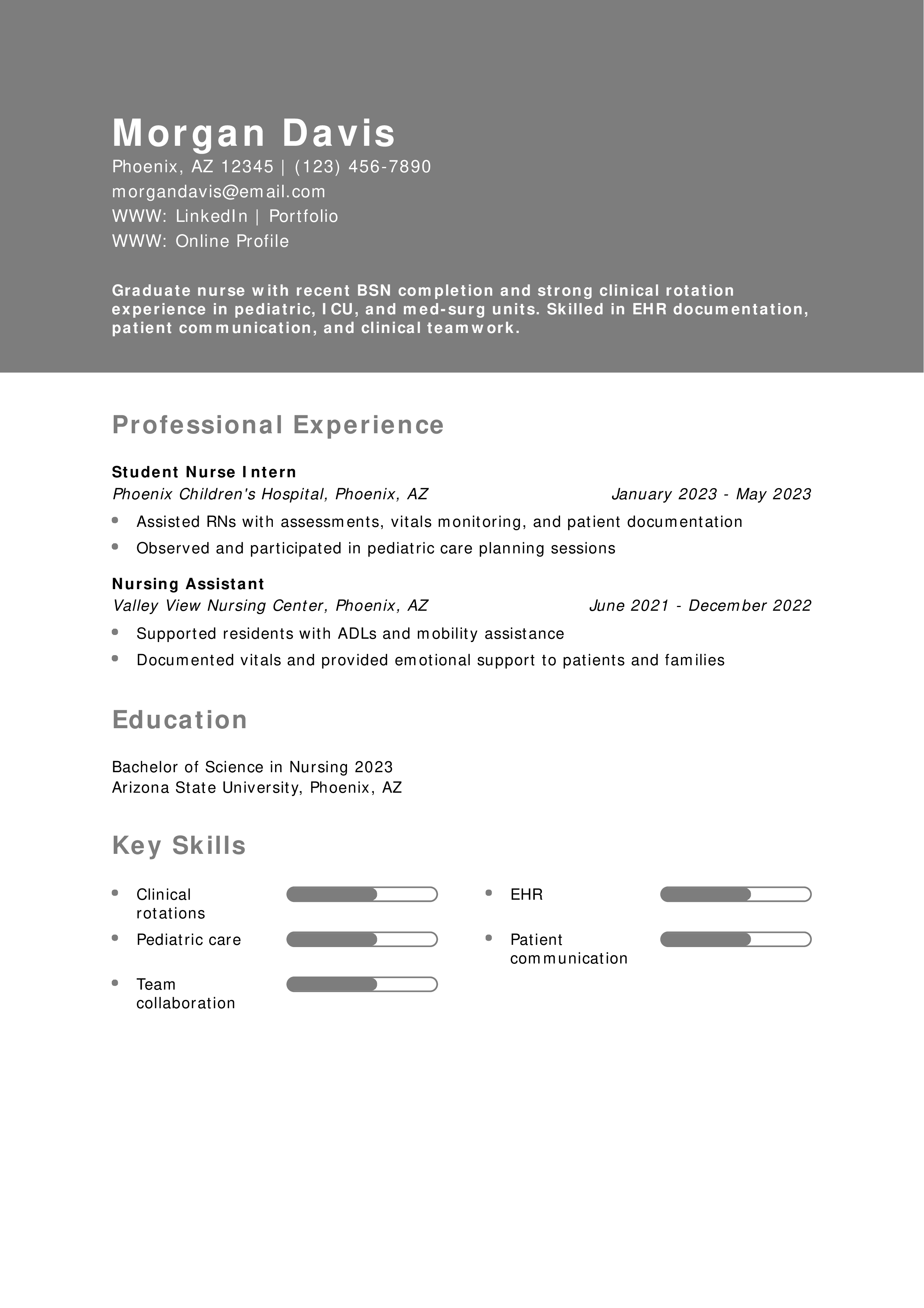 “As a new nursing graduate, your clinical experience, compassion, and adaptability matter most. Use your resume to show you’re ready to step into a fast-paced care setting with professionalism and purpose.”