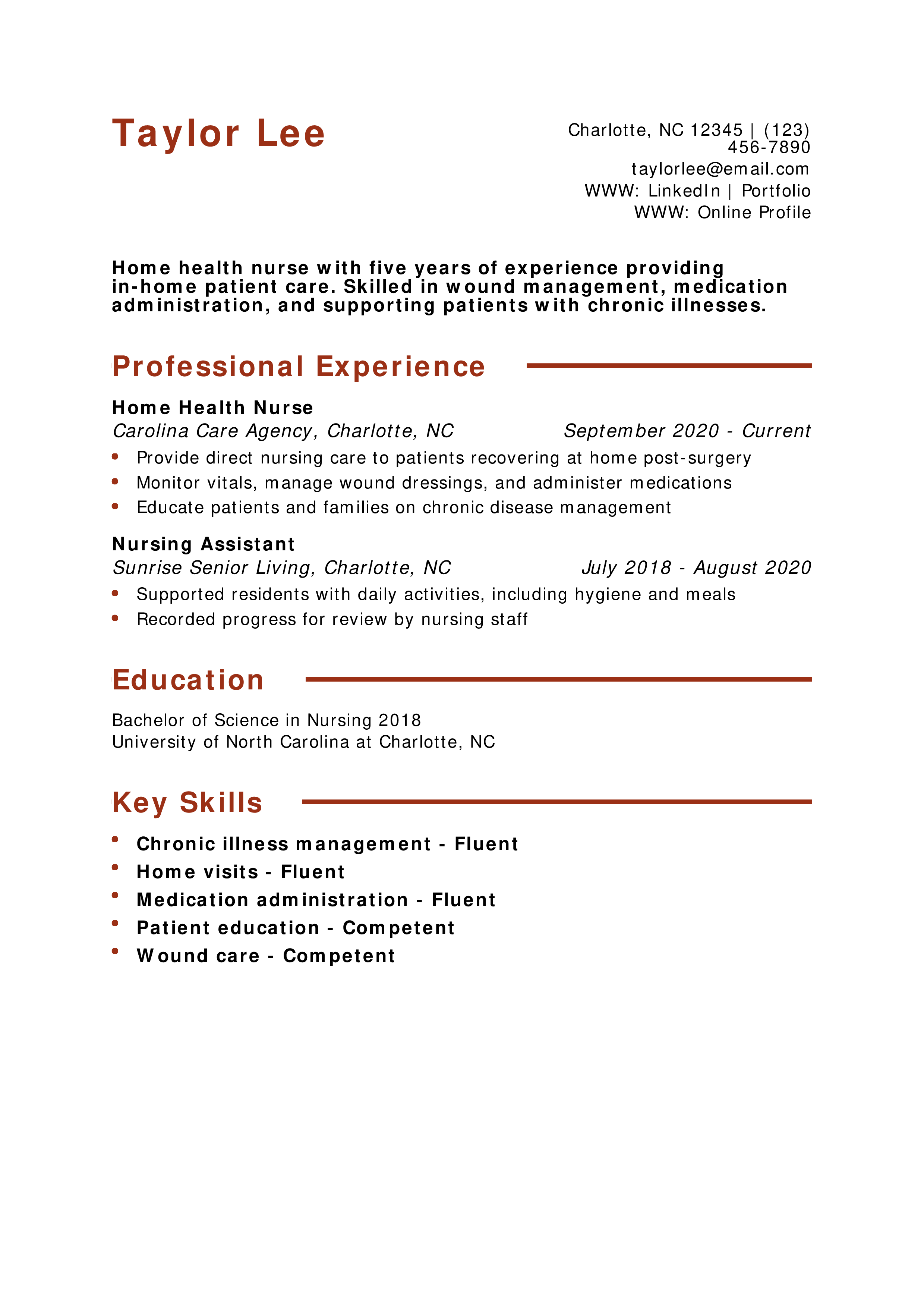 This resume highlights independence, flexibility, and strong patient education skills, essential for home health nurses.