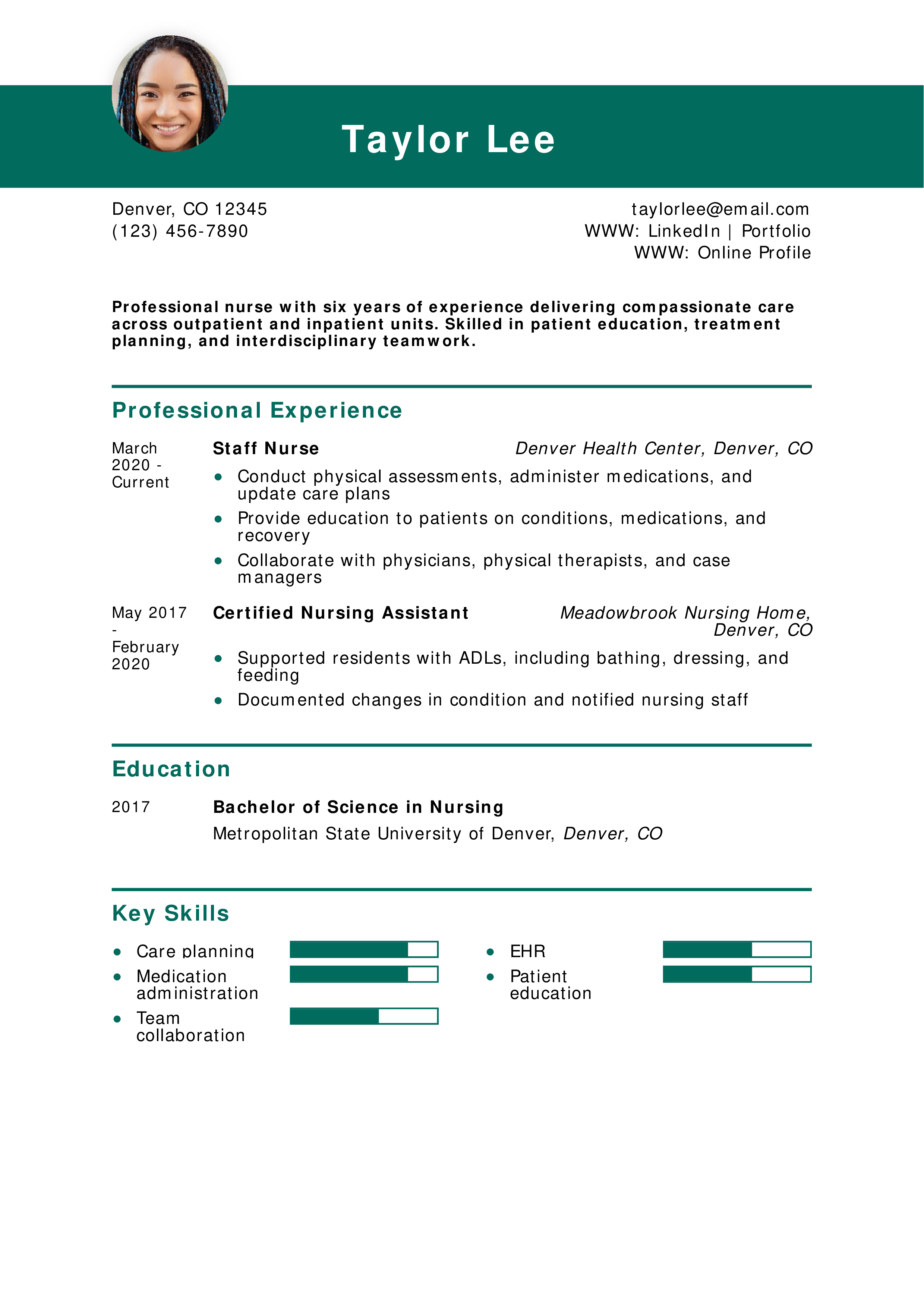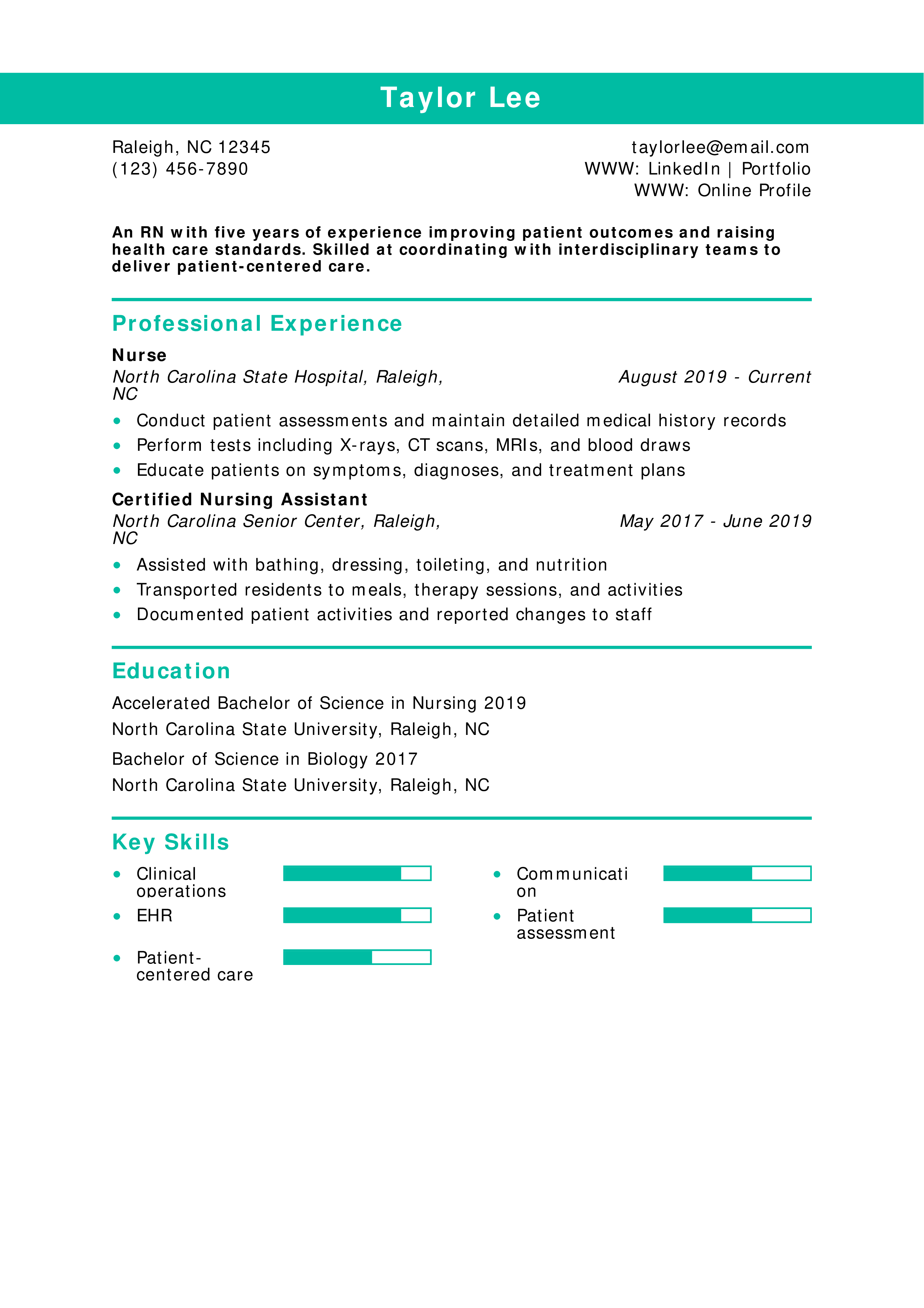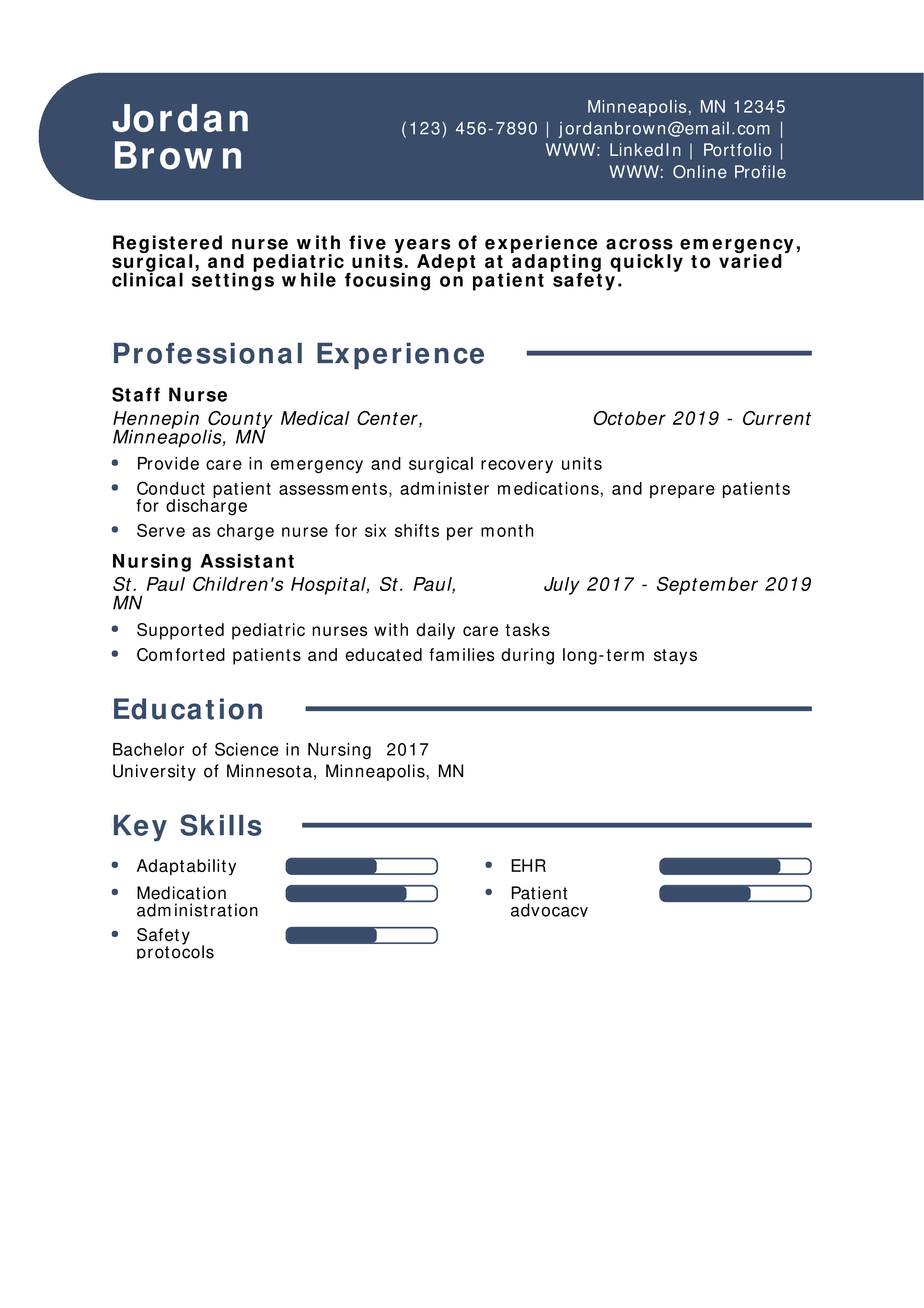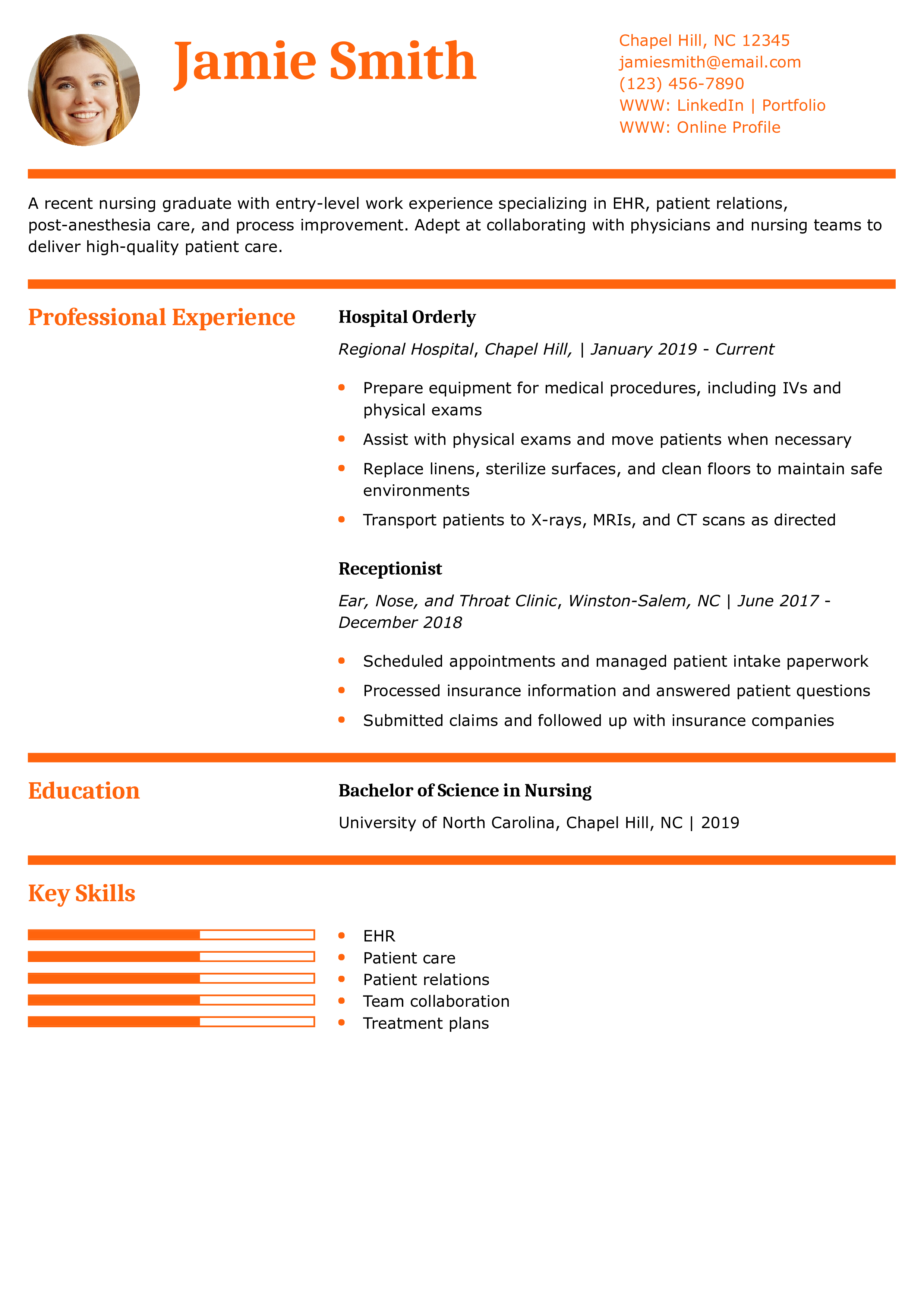 Start the professional experience section with your most relevant positions or the most recent, depending on your work history. If you still need to hold a nursing job, focus on the experience you garnered during your nursing externship. Emphasize important trends within the medical industry, such as patient-centered care, diversity and inclusion, and patient advocacy. Even without years of experience, you can still craft a results-driven resume that highlights the unique aspects of who you are as a health care professional.