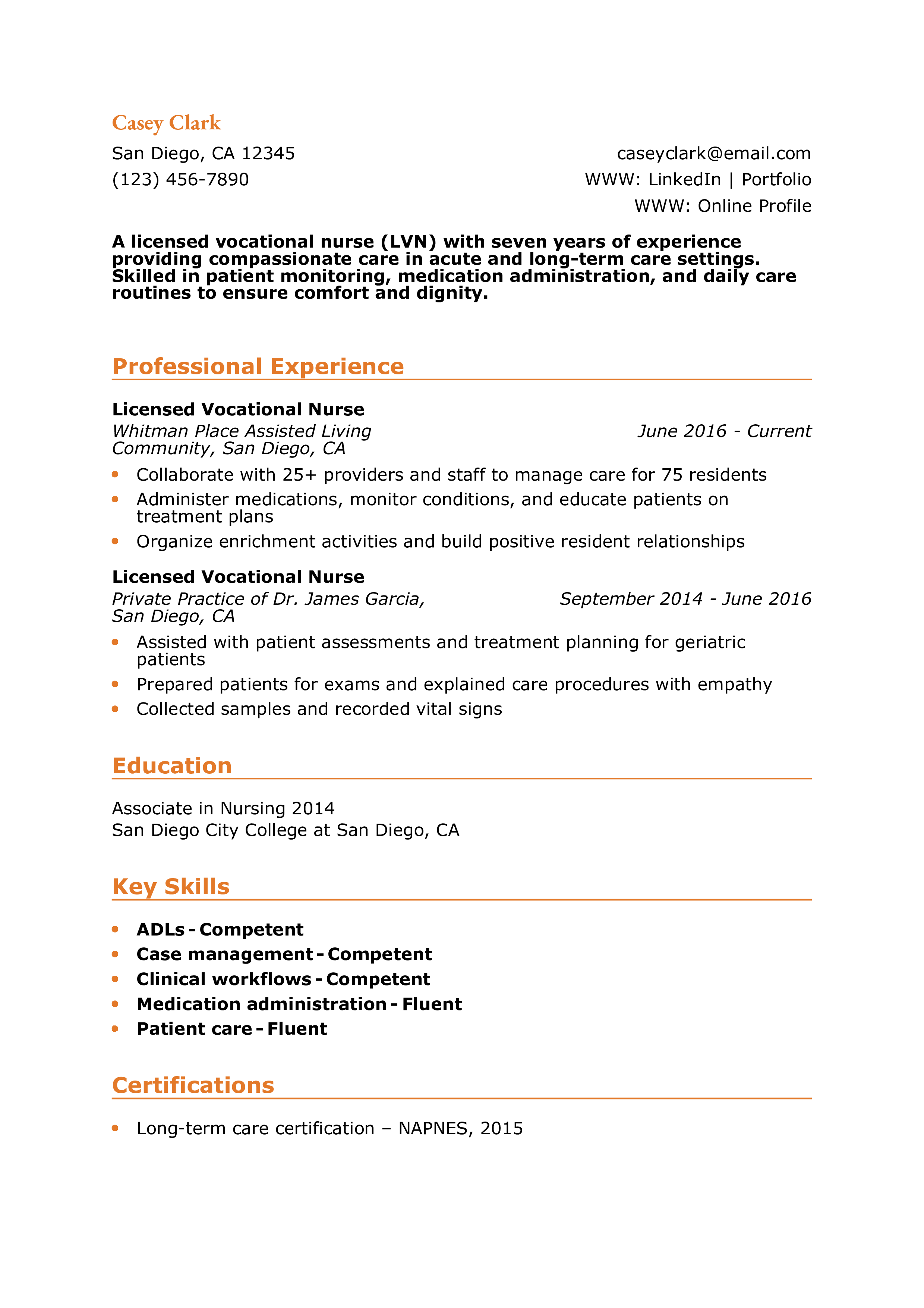 Nursing is a hands-on profession, and the hiring manager will look for applicants with specific capabilities. While some of this may be covered in your work history, it’s a good idea to include a key skills list so the reviewer can quickly see if you’re a match for the position. This should be a mix of technical nursing skills, such as inserting IVs and calculating medication dosages. Also, highlight interpersonal skills, such as de-escalating conflicts and educating patients.