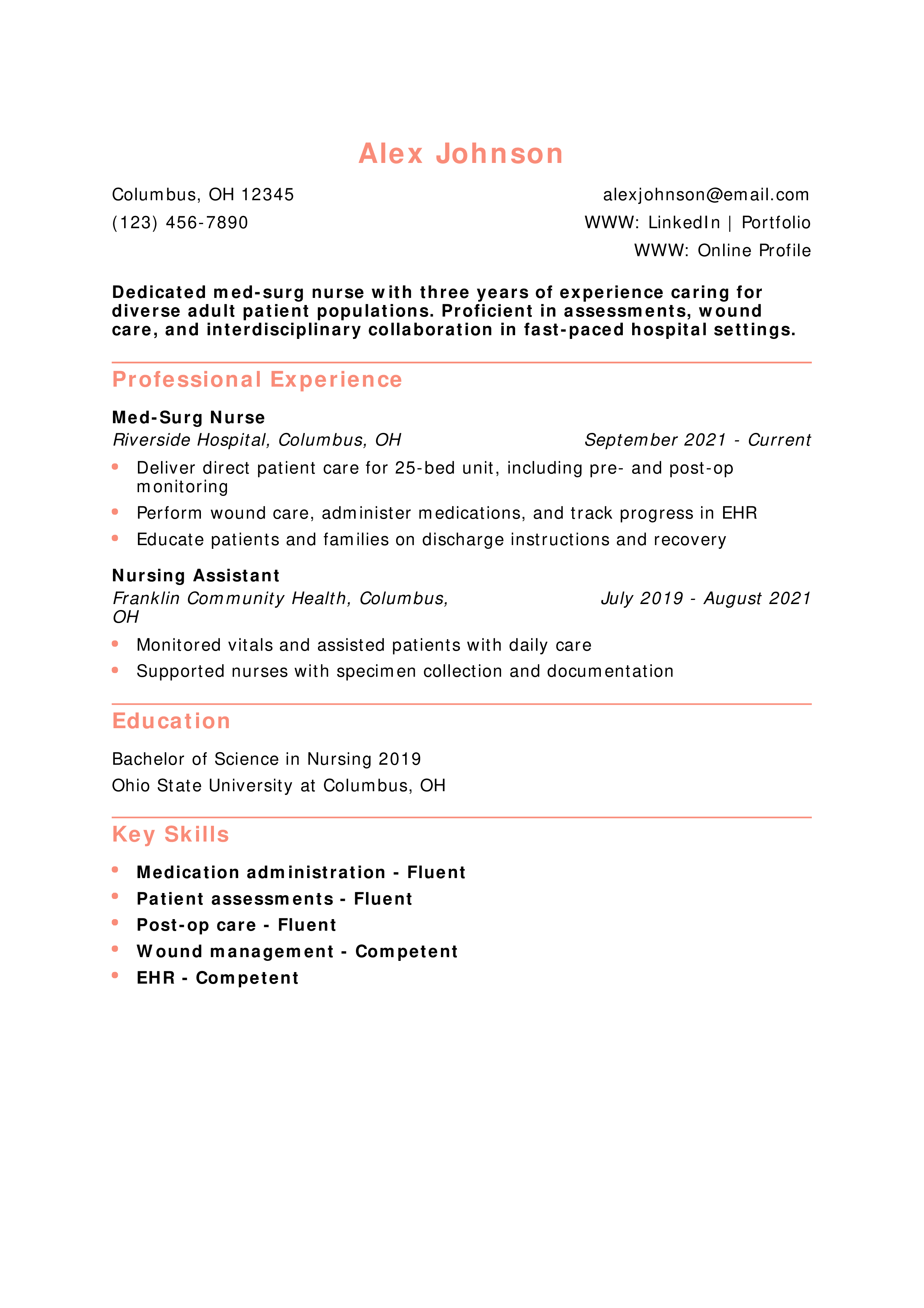 This resume demonstrates broad patient care skills relevant to med-surg nursing and shows clear clinical progression.