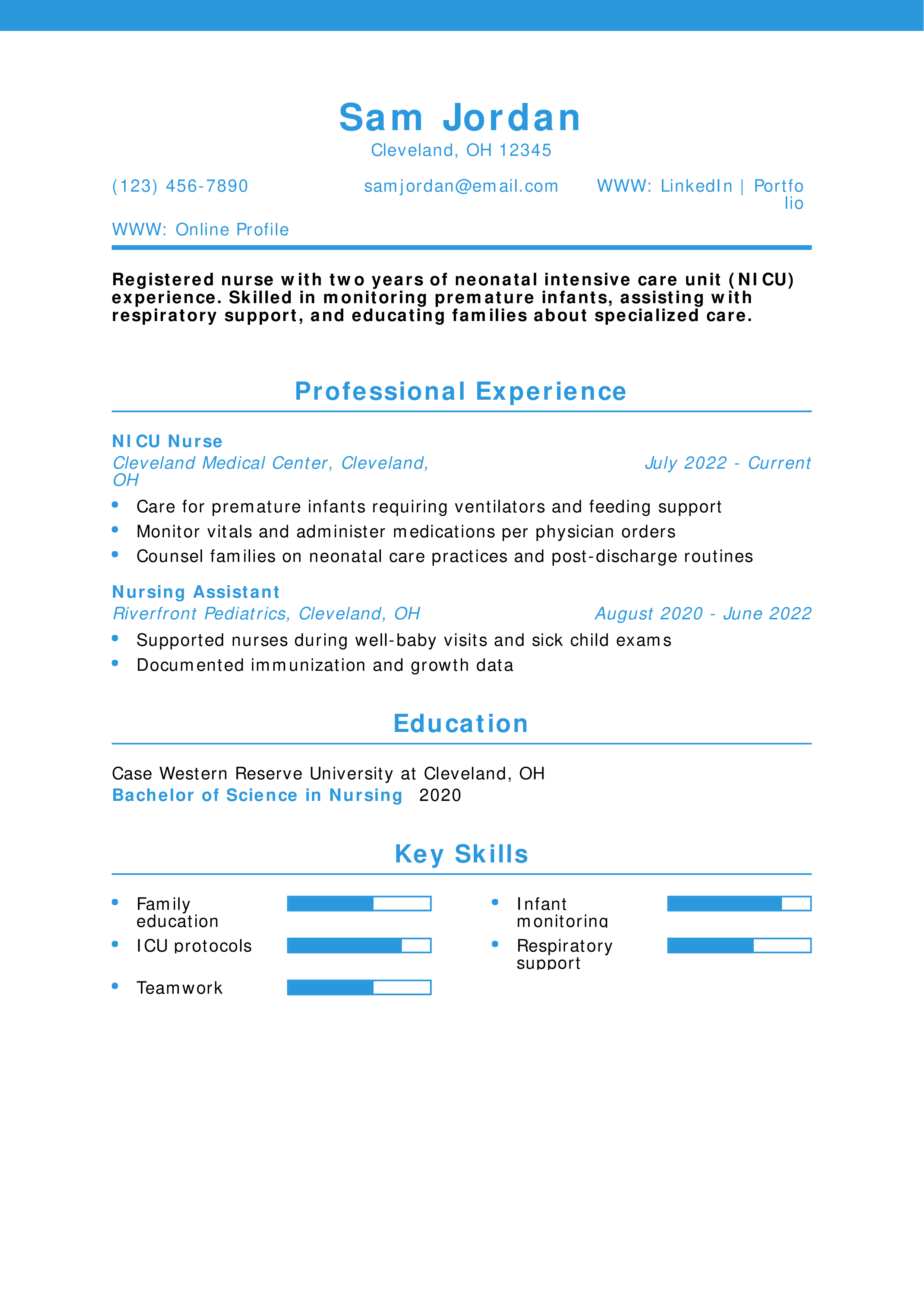 This resume shows specialized neonatal experience with technical care and family support, a key balance for NICU nurses.