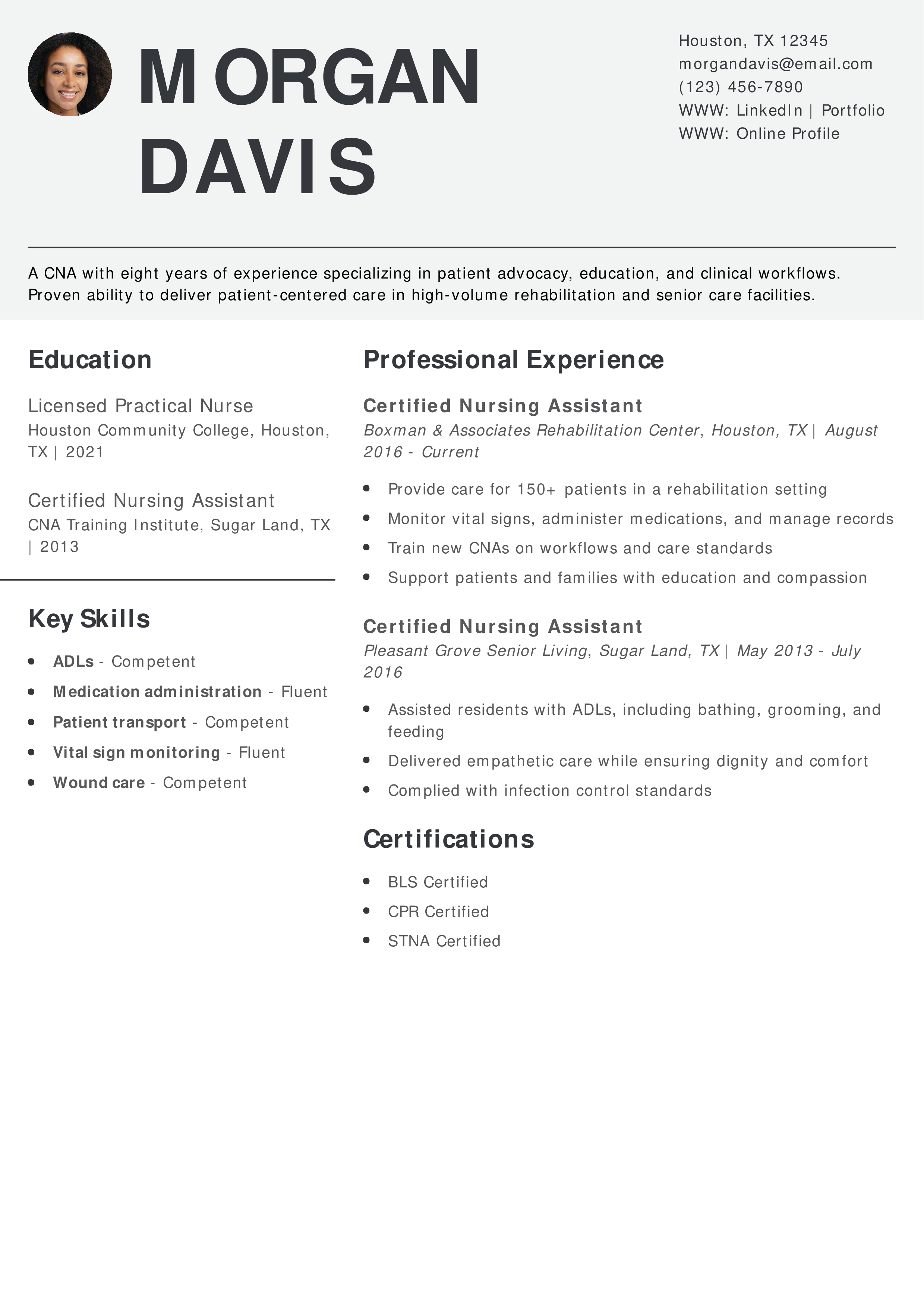 This resume emphasizes relevant clinical experience and patient-centered care. It blends CNA experience with RN responsibilities, showing professional growth.