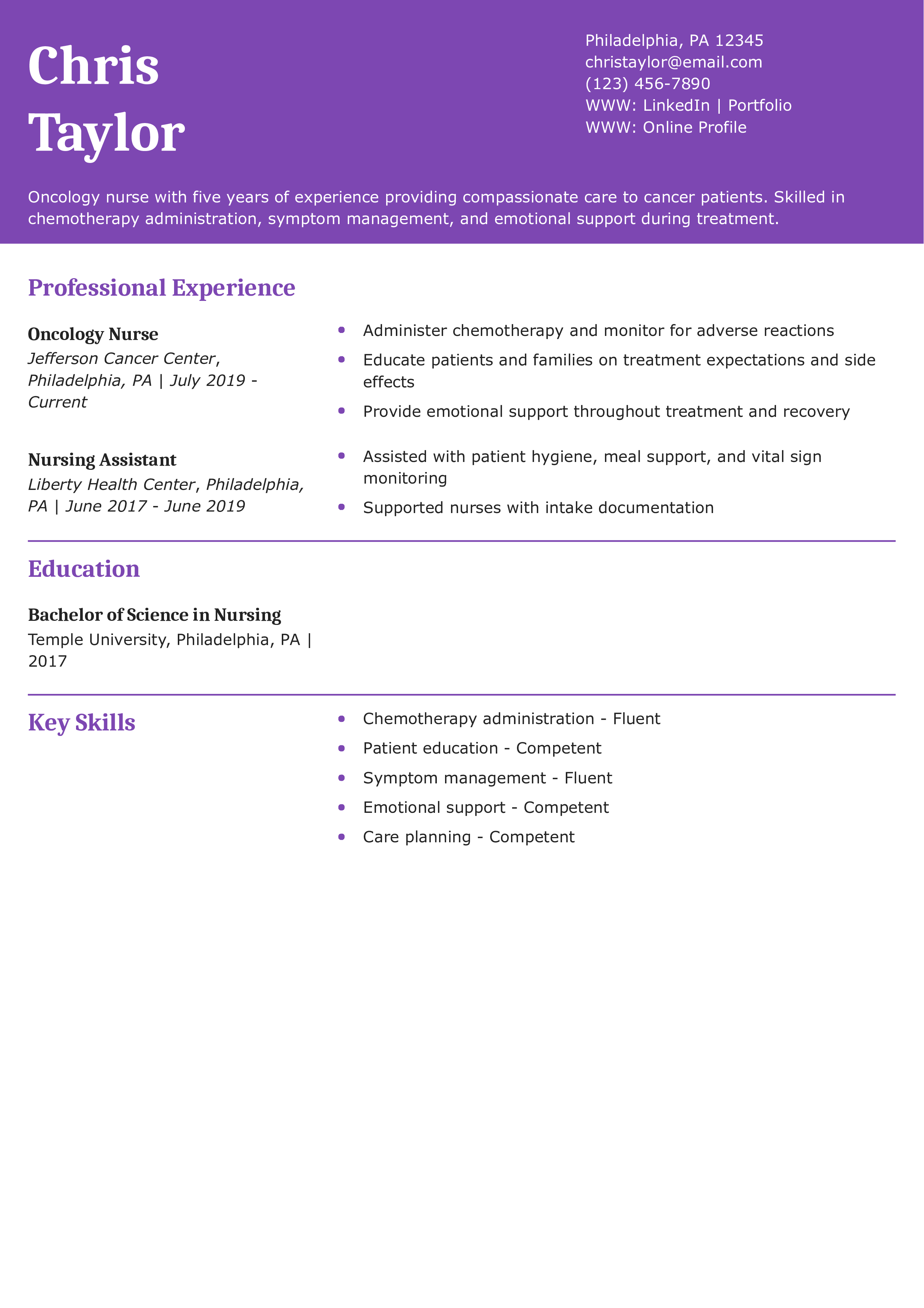This resume showcases specialized oncology knowledge and highlights compassionate care — critical in cancer treatment settings.