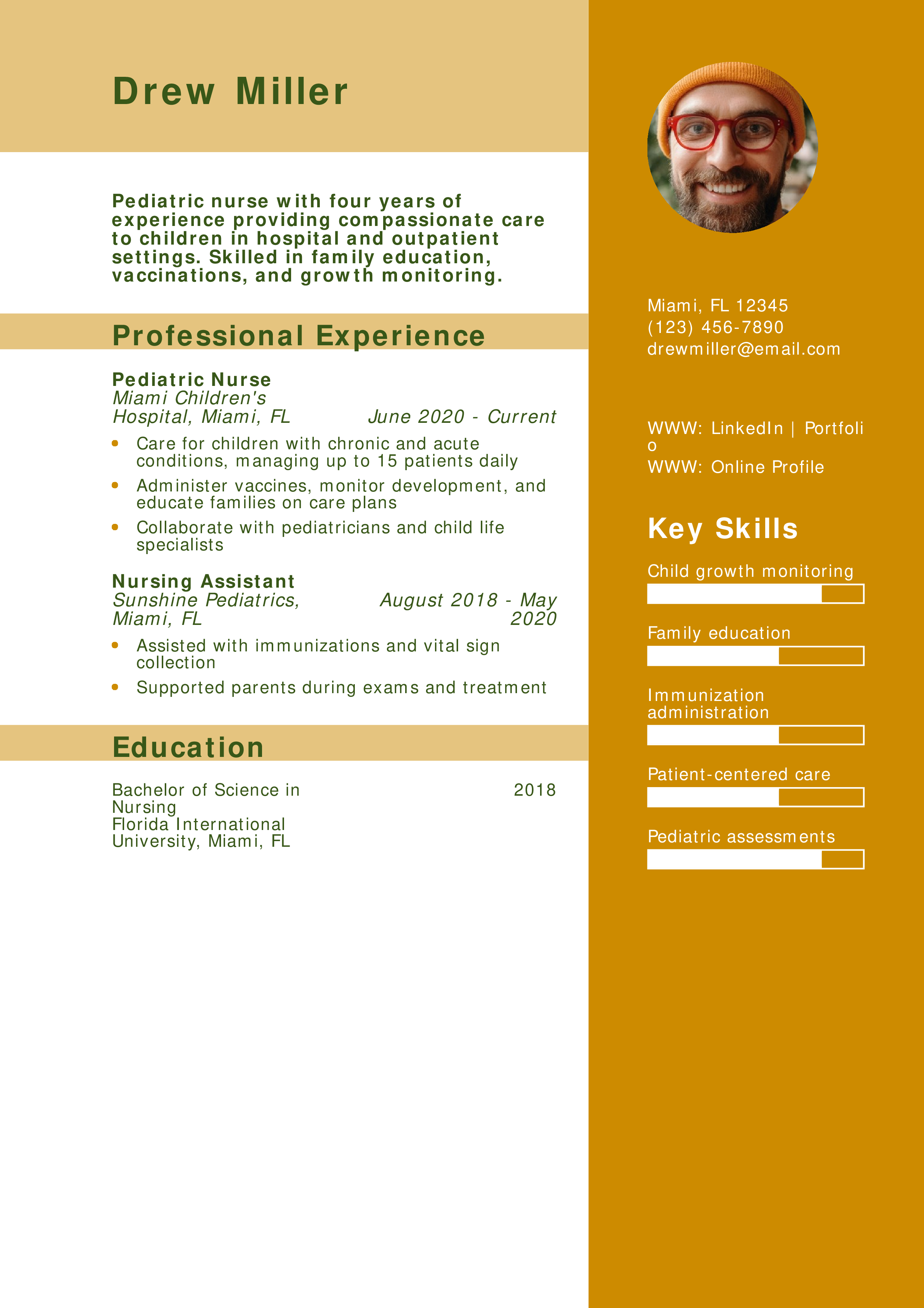 This resume balances technical pediatric skills with empathy and family education, essential in pediatric nursing.