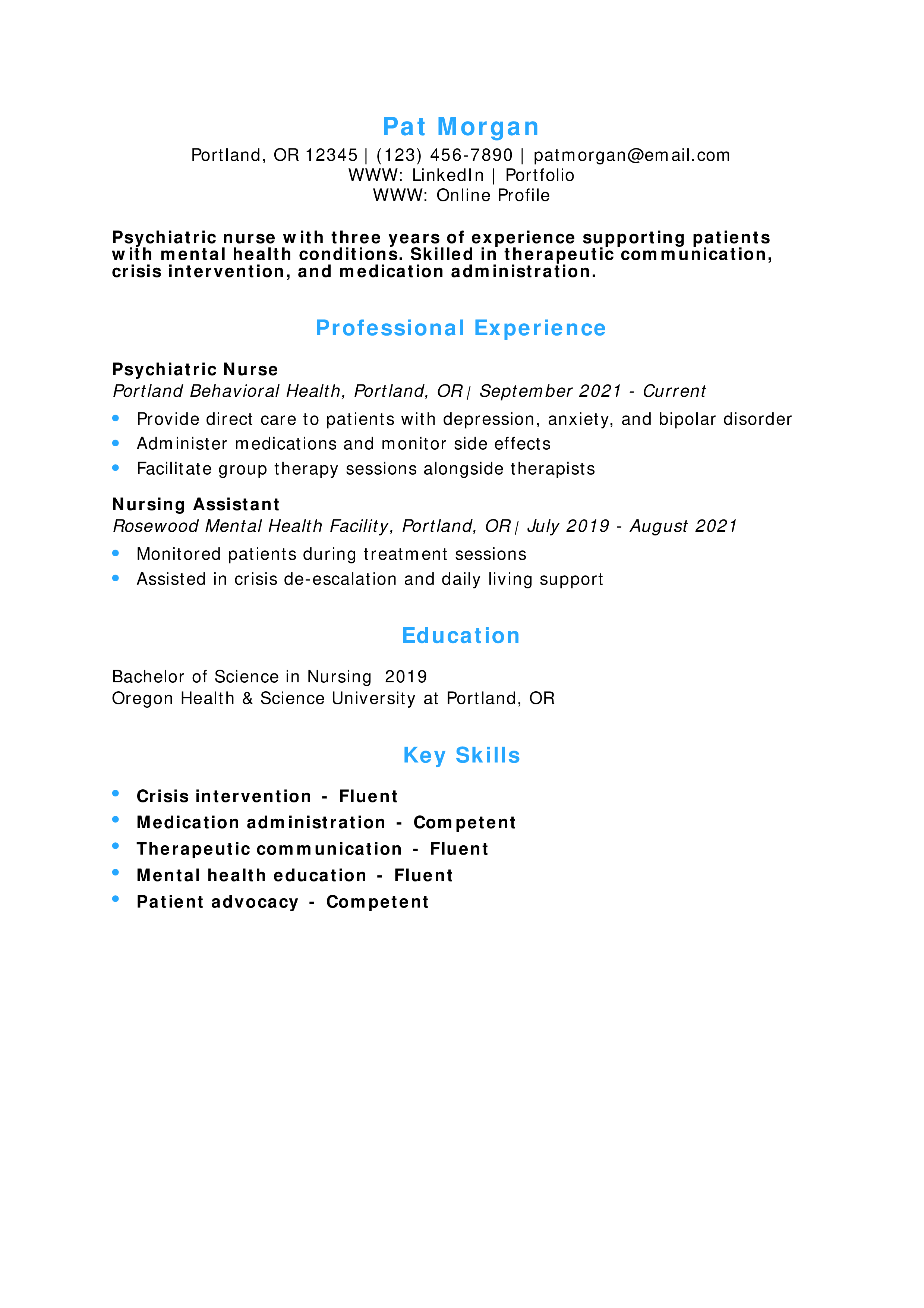 This resume highlights psychiatric nursing skills and direct patient engagement. It balances clinical duties with emotional support experience.
