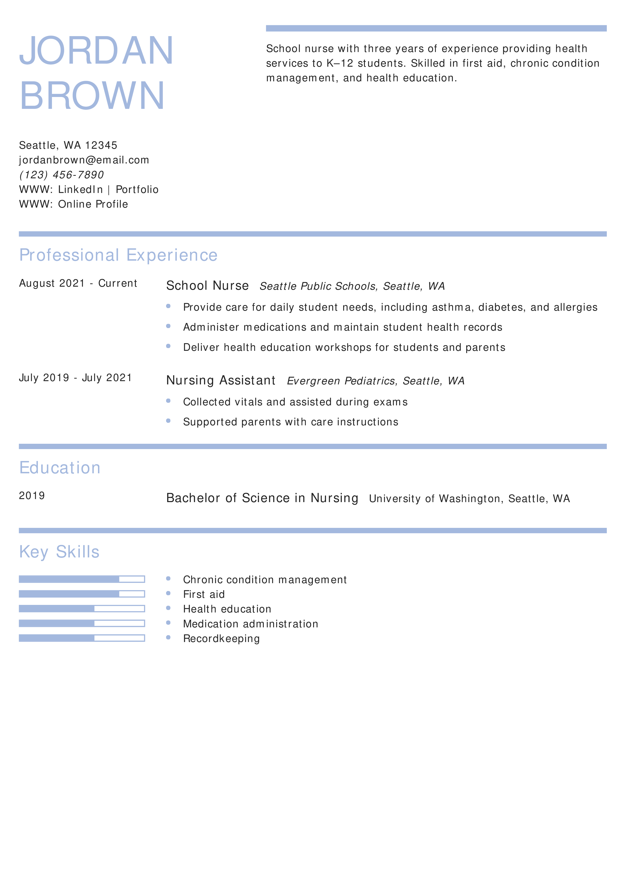 For school nursing, highlight both direct care and educational outreach. Learn more at resume interests section.