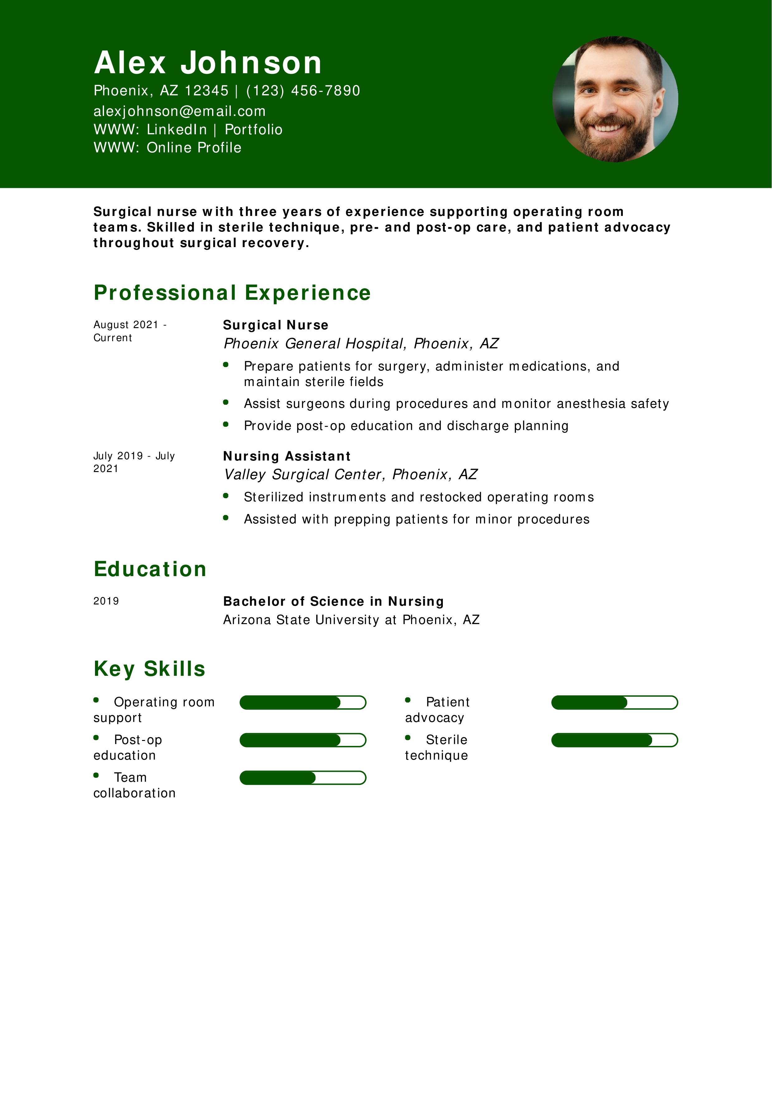 For surgical resumes, highlight sterile technique and intraoperative teamwork. See resume objective examples for ways to capture this upfront.