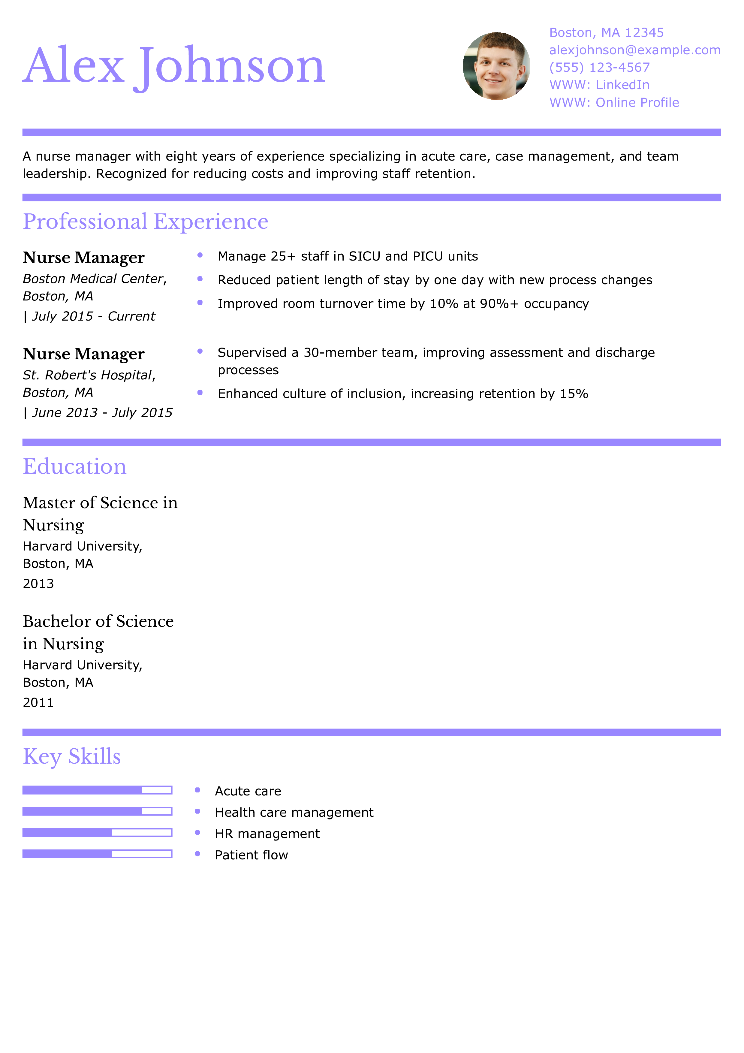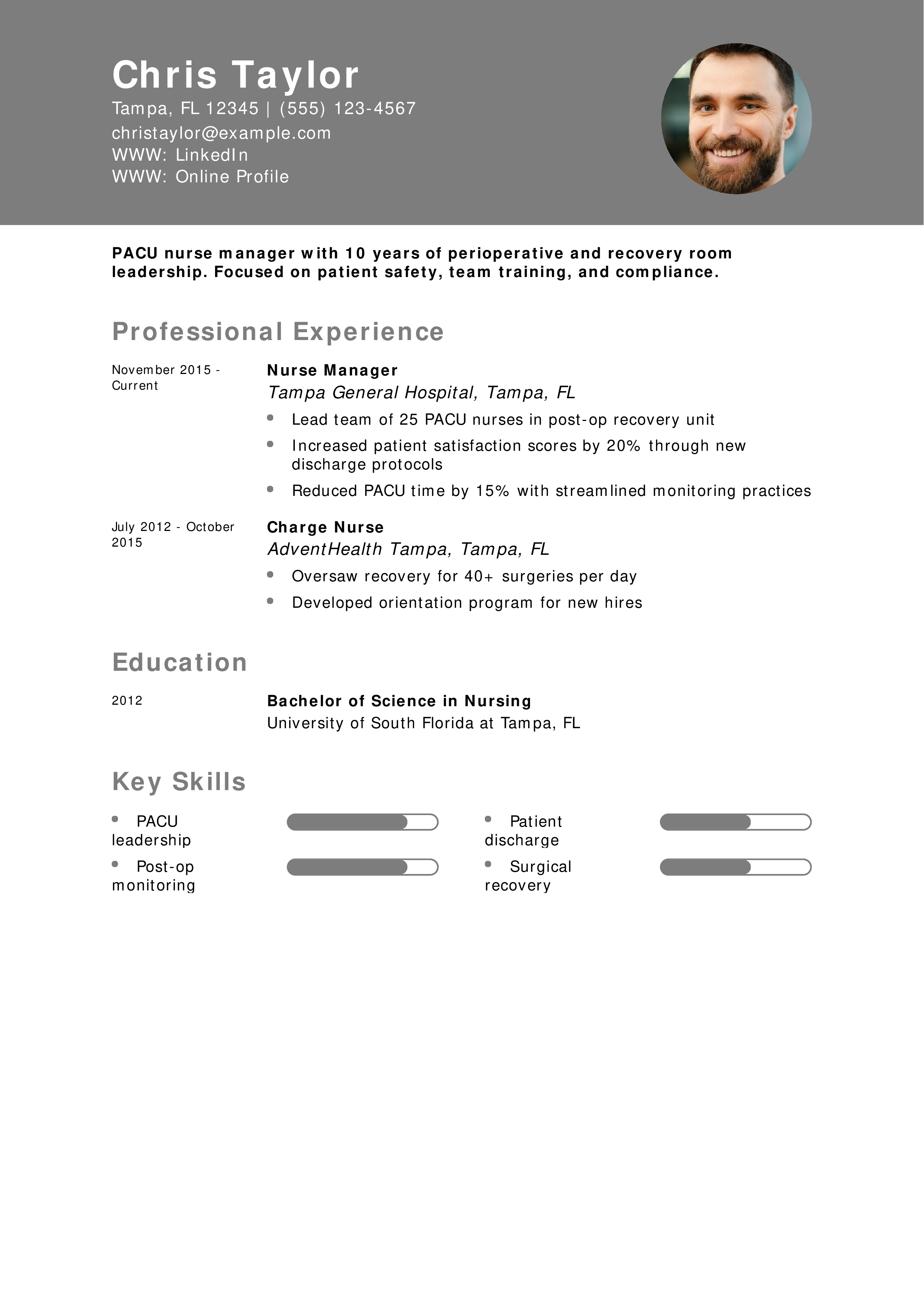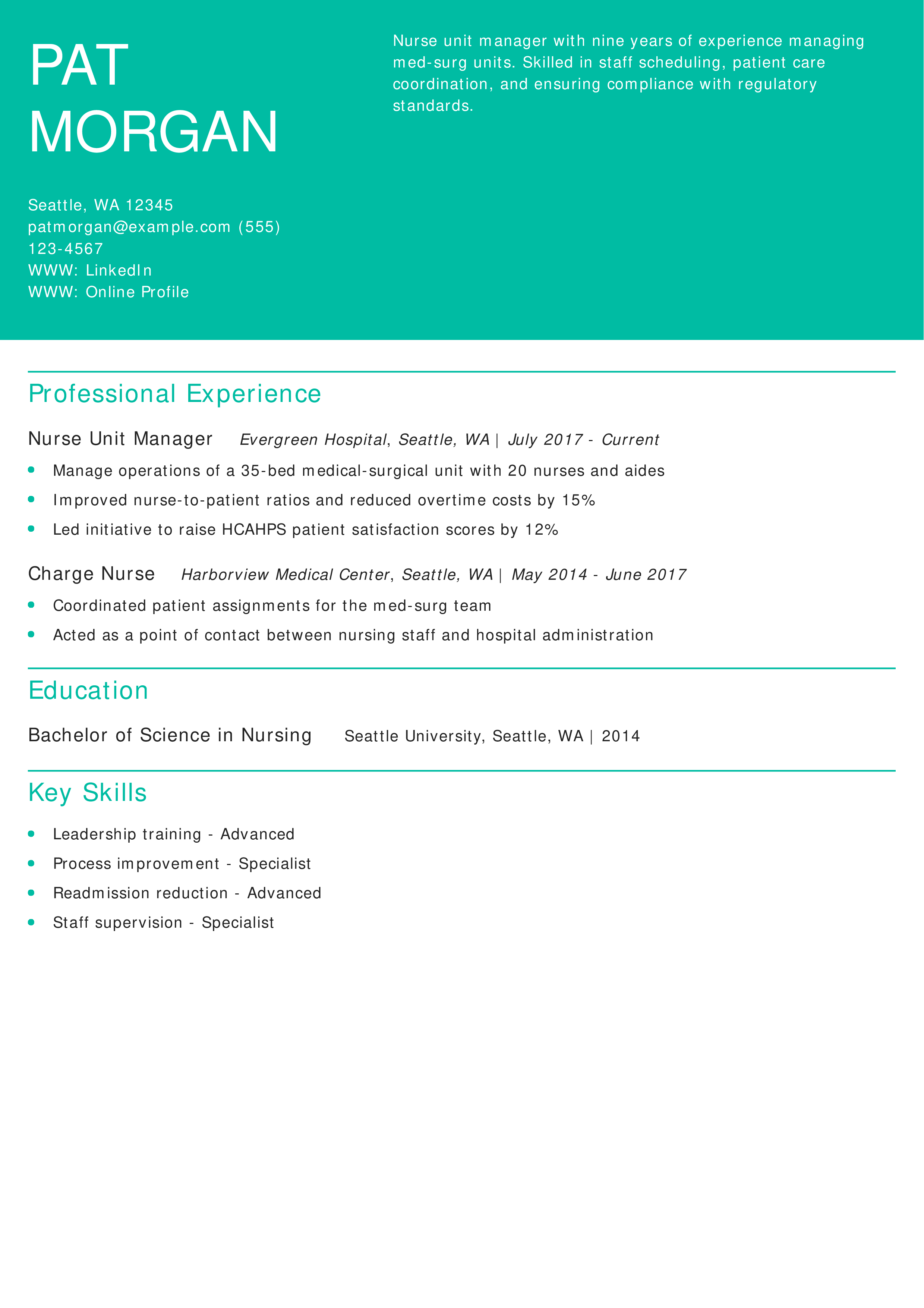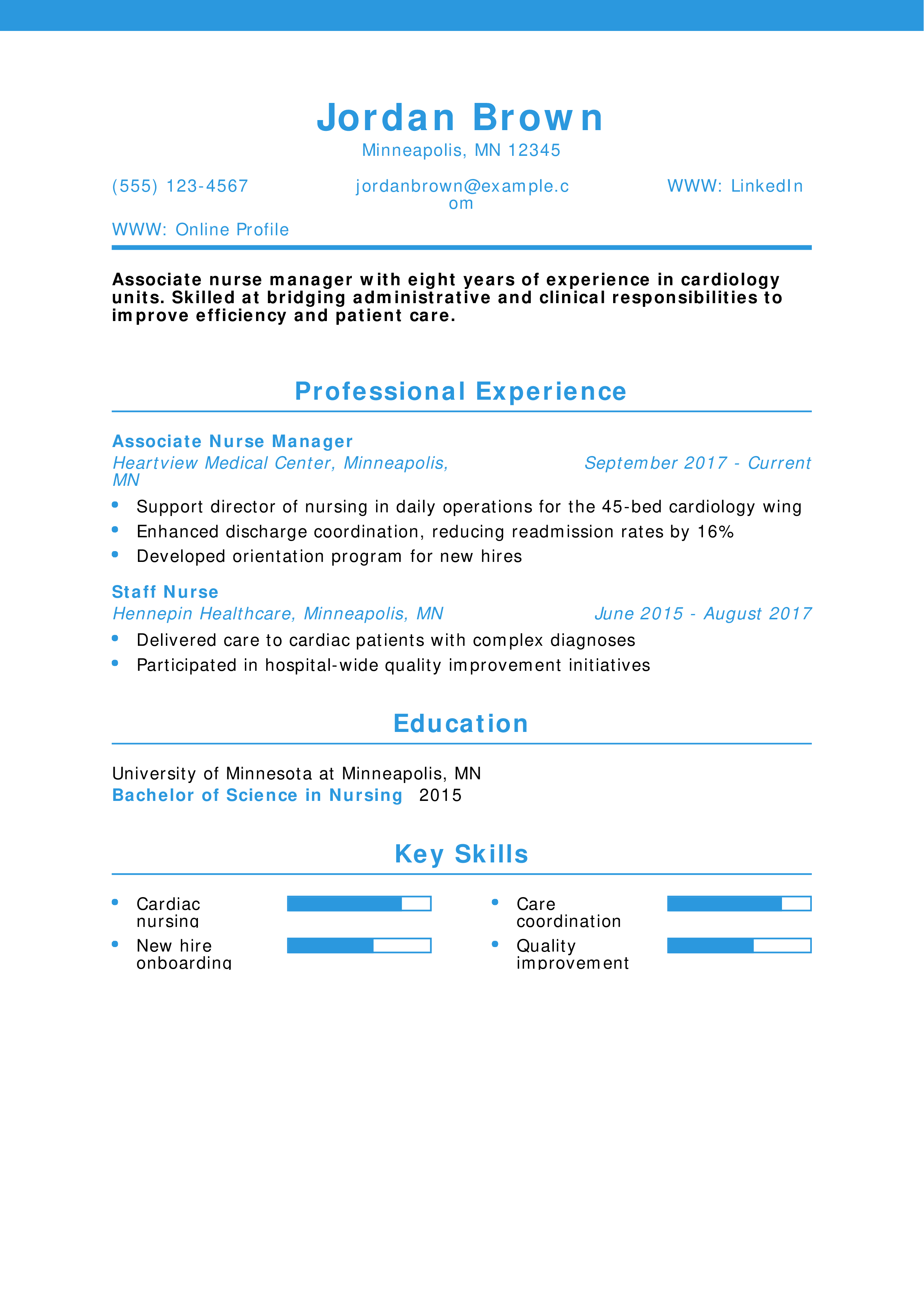 Reverse chronological is the ideal resume format for nurse managers. This ensures that your most recent and relevant experience is featured towards the top of your document. Functional resume formats are generally considered outdated by recruiters, as they don’t offer a structure to create detailed bullet points. Hiring managers want to understand what makes you unique as a health care professional, and only listing skills won’t help you generate interviews on the open market.