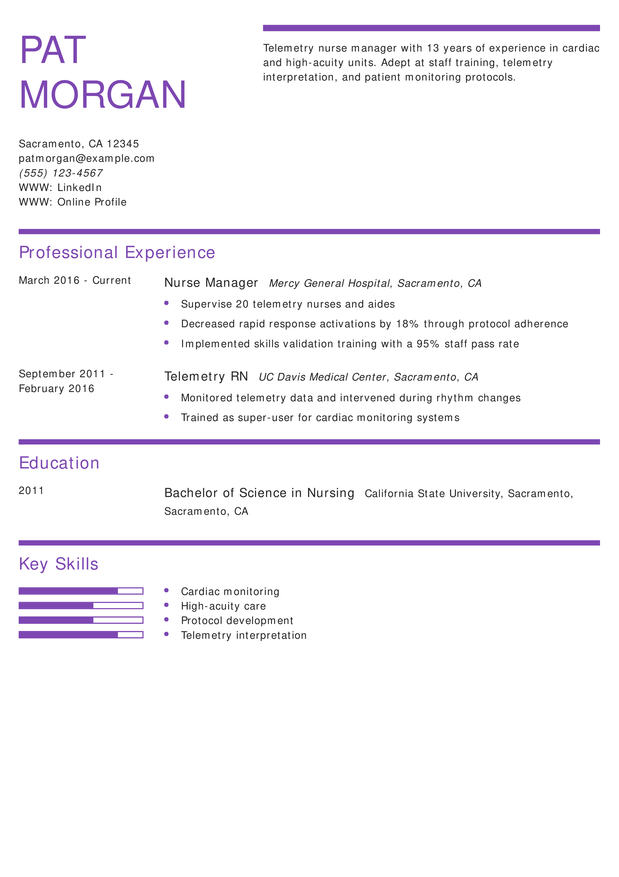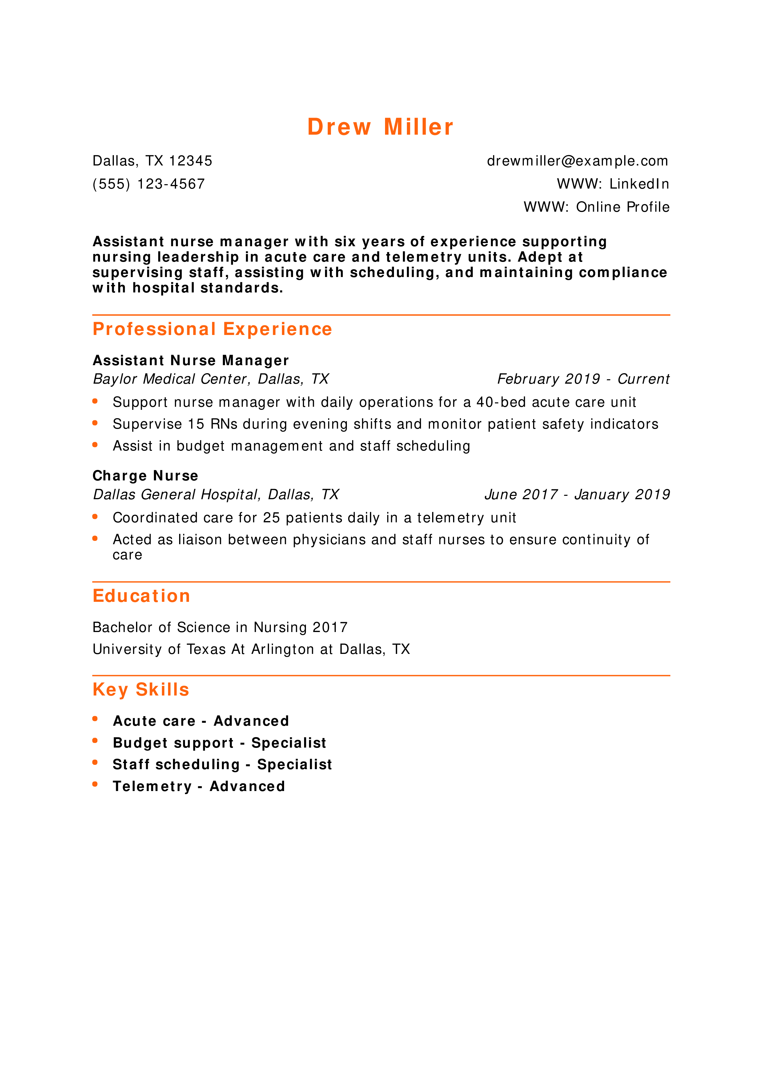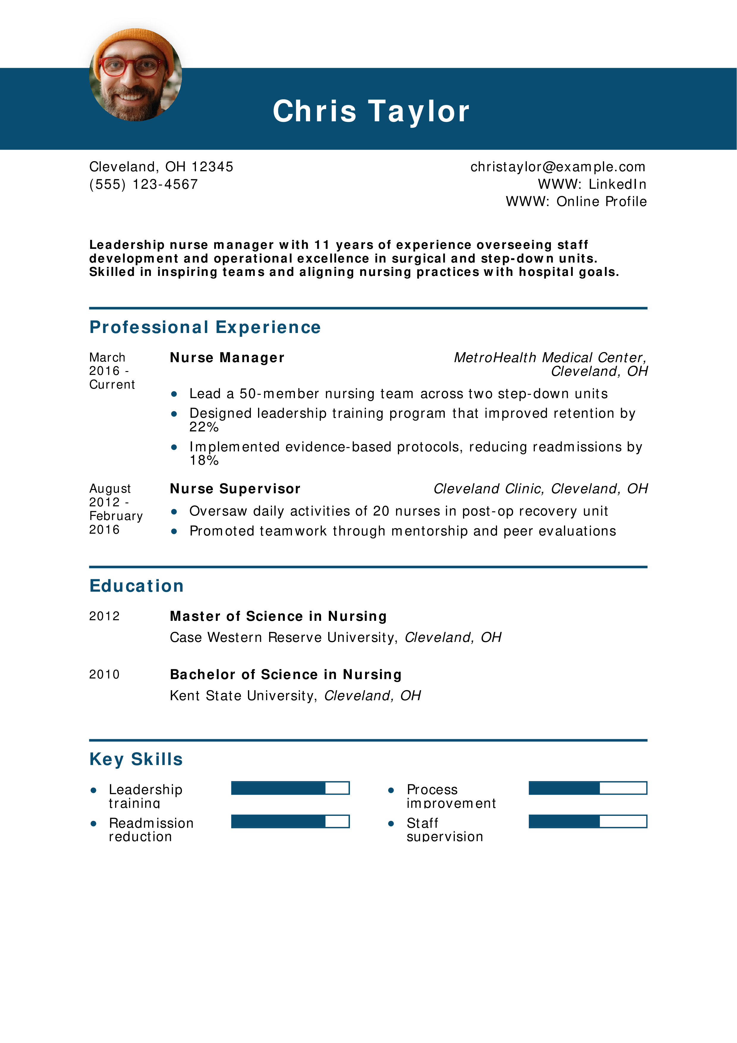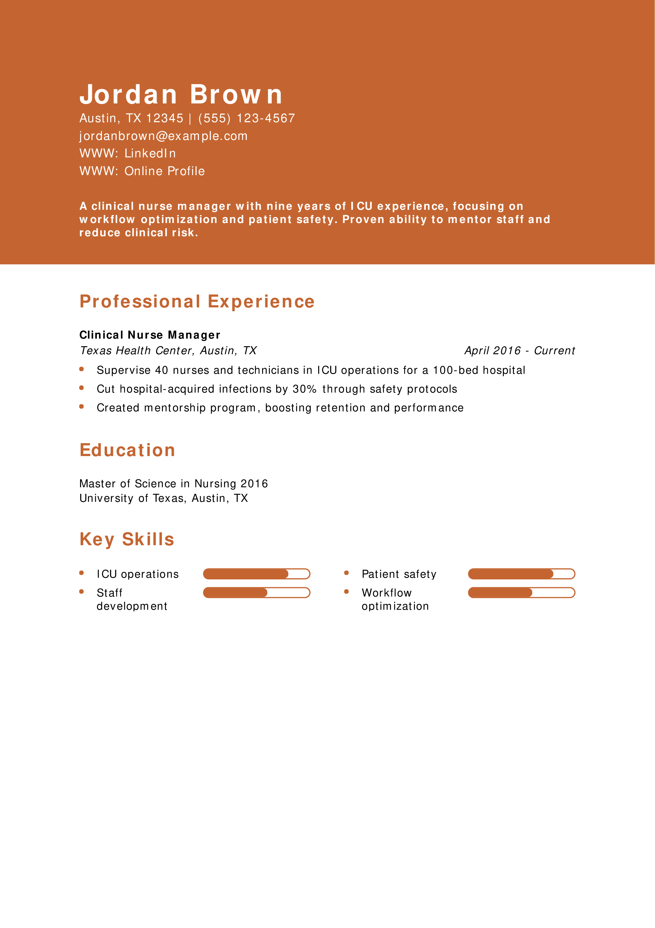 Reverse chronological is the ideal resume format for nurse managers. This ensures that your most recent and relevant experience is featured towards the top of your document. Functional resume formats are generally considered outdated by recruiters, as they don’t offer a structure to create detailed bullet points. Hiring managers want to understand what makes you unique as a health care professional, and only listing skills won’t help you generate interviews on the open market.