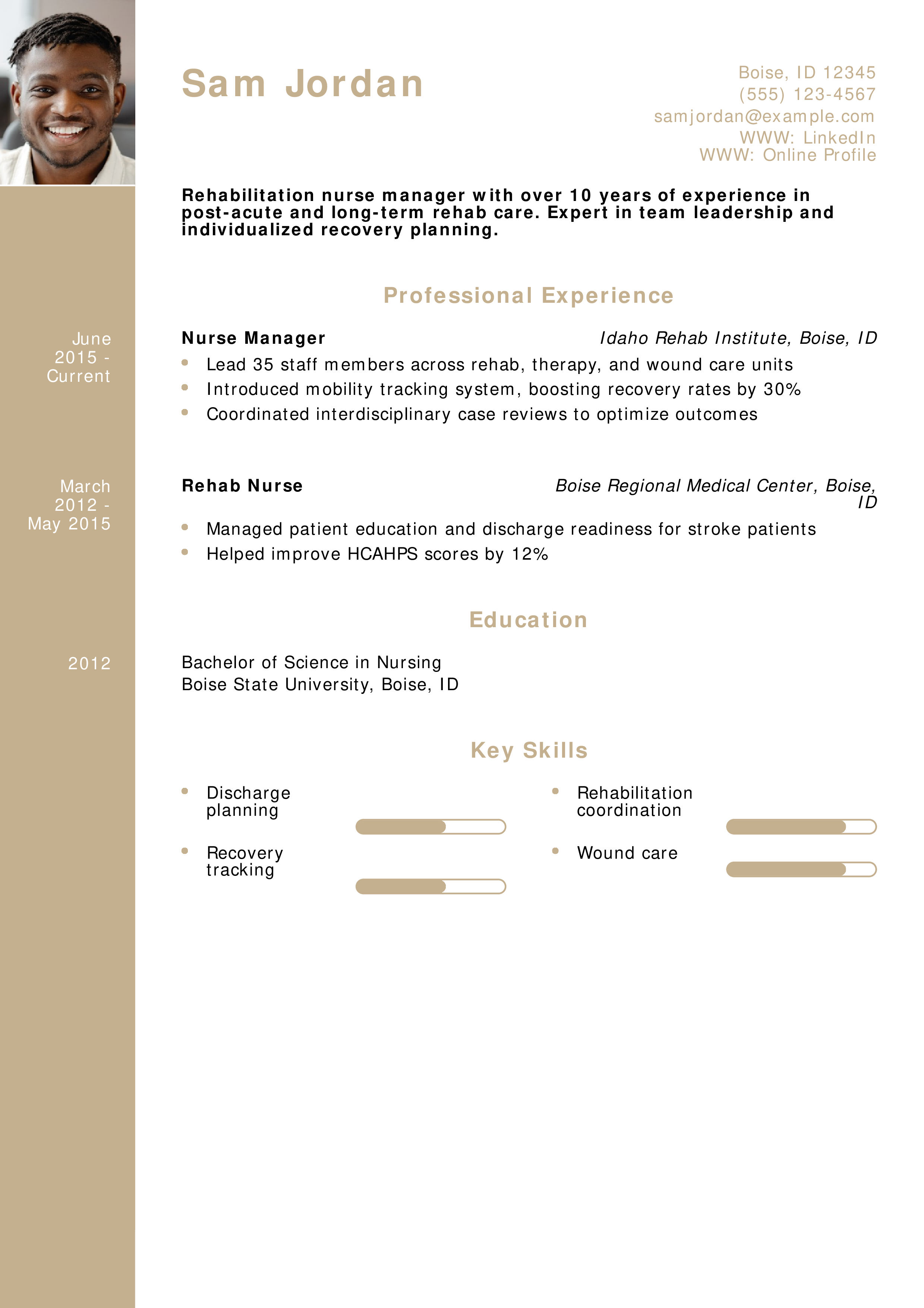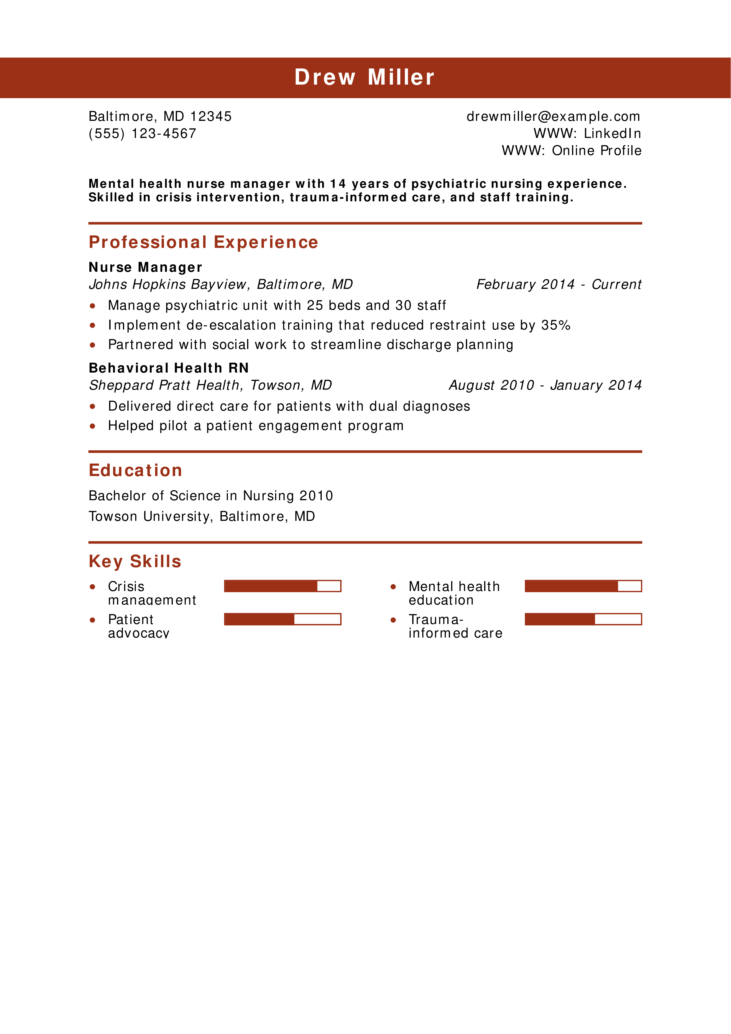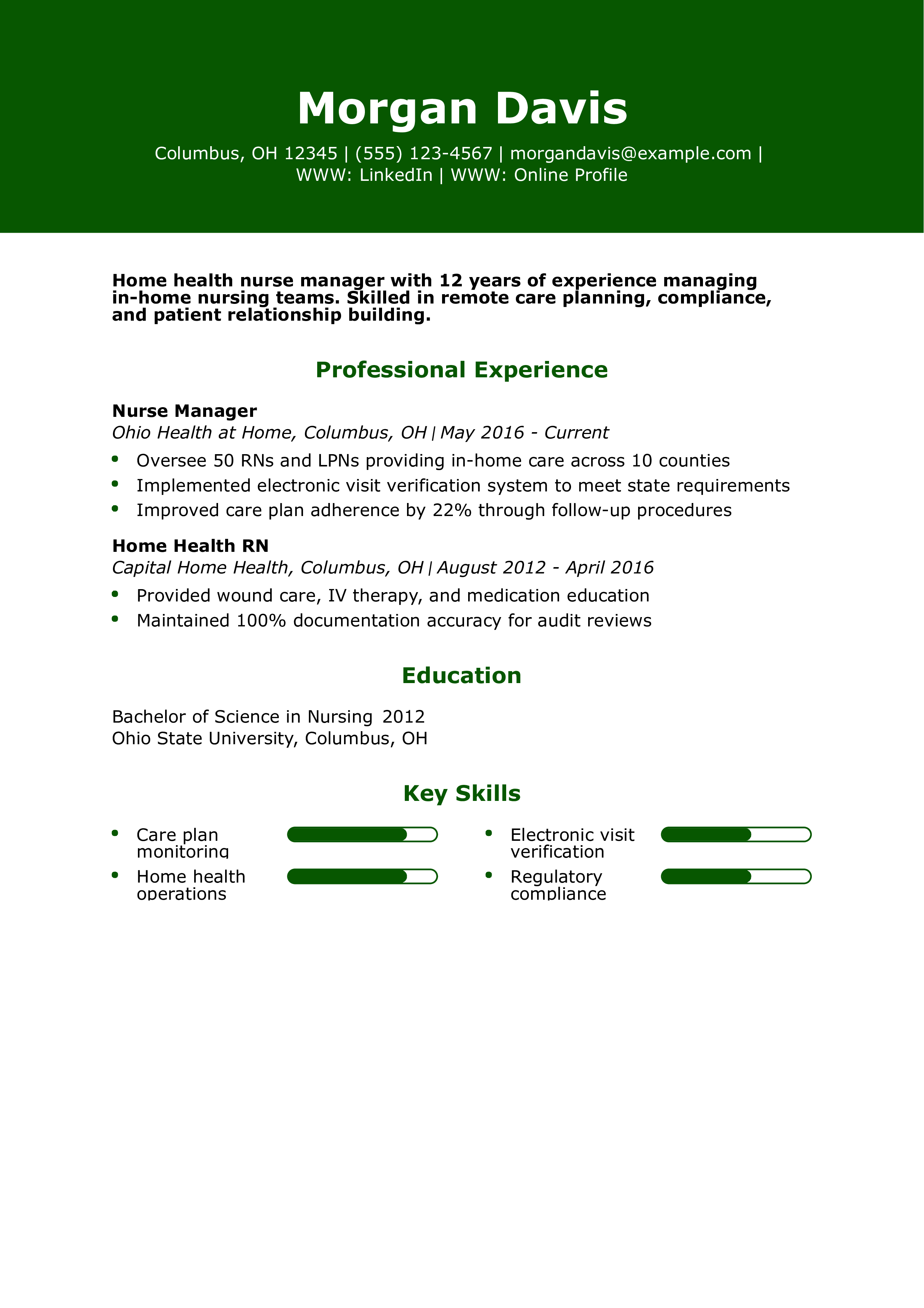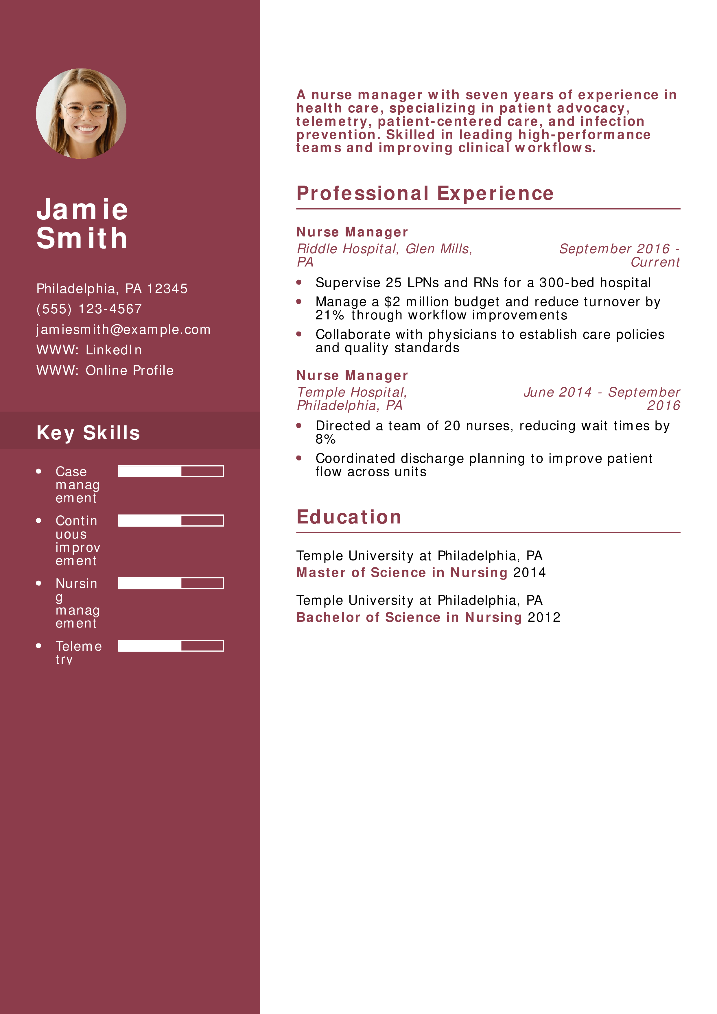 Reverse chronological is the ideal resume format for nurse managers. This ensures that your most recent and relevant experience is featured towards the top of your document. Functional resume formats are generally considered outdated by recruiters, as they don’t offer a structure to create detailed bullet points. Hiring managers want to understand what makes you unique as a health care professional, and only listing skills won’t help you generate interviews on the open market.