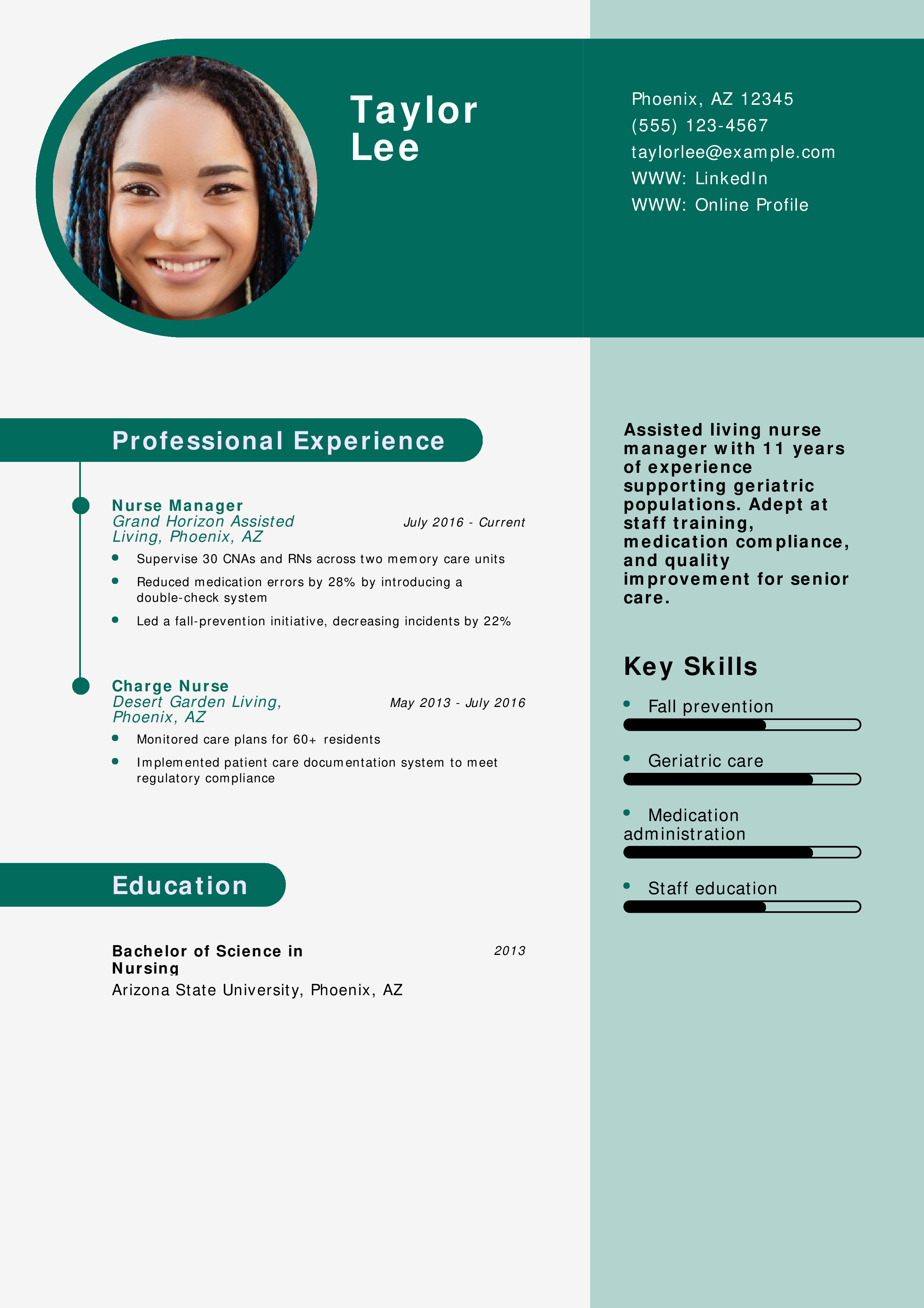 This resume is strong because it emphasizes specialized environments like nursing homes and assisted living while showcasing compassionate care. Learn how to highlight transferable skills at resume skills.