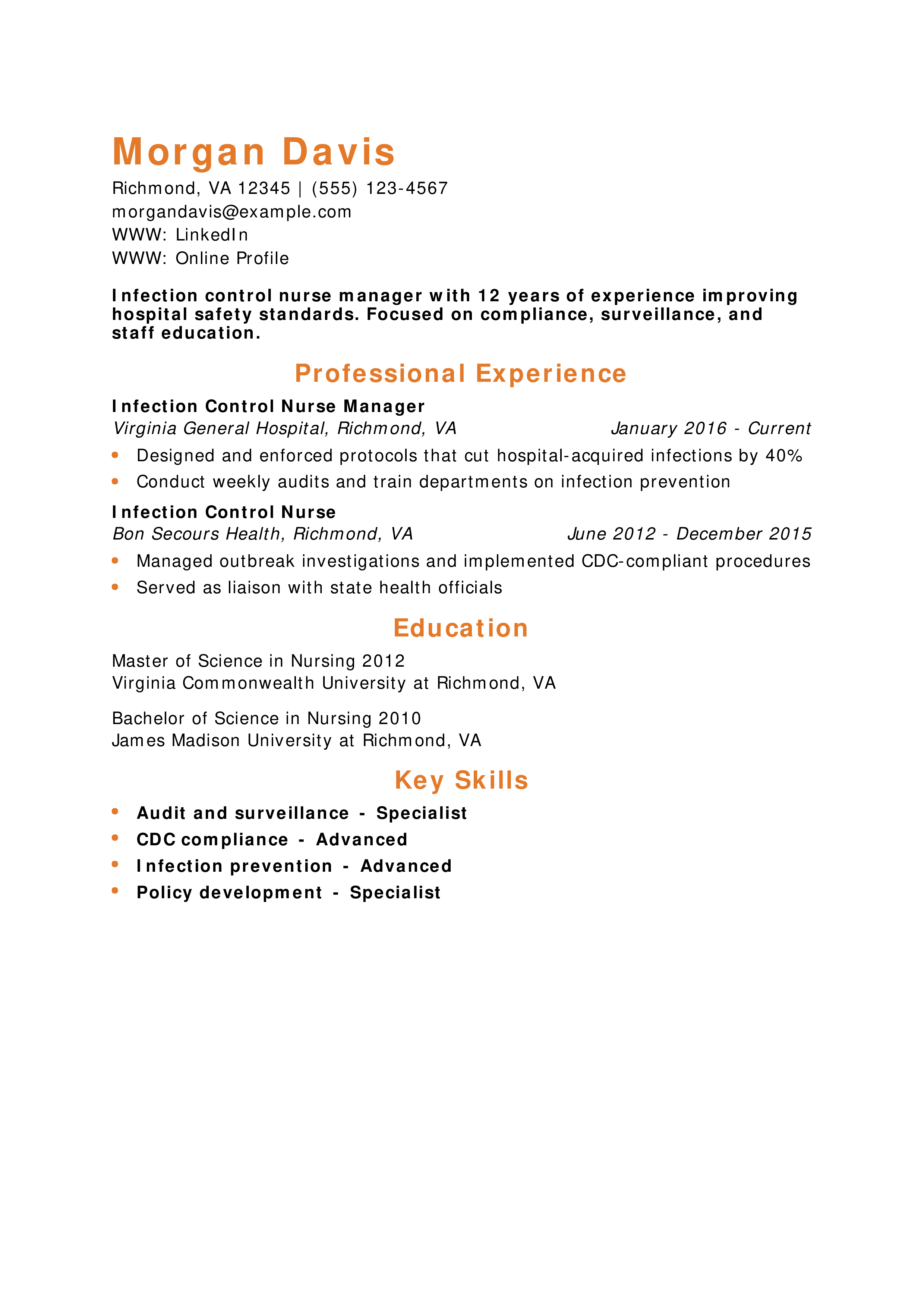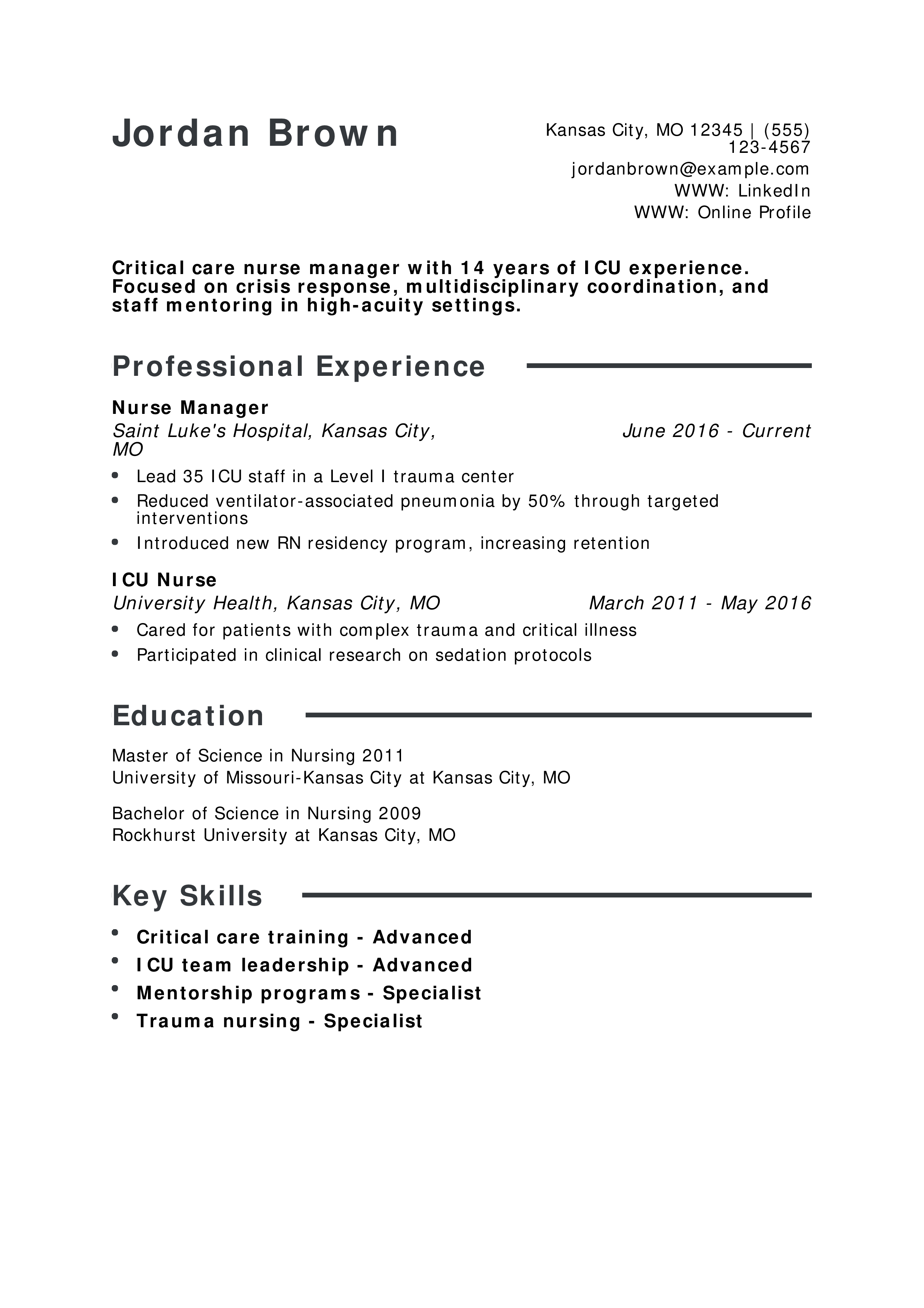 This resume is effective because it highlights ICU leadership and quantifiable safety improvements. See more strategies for writing clear profiles at how to make a resume.