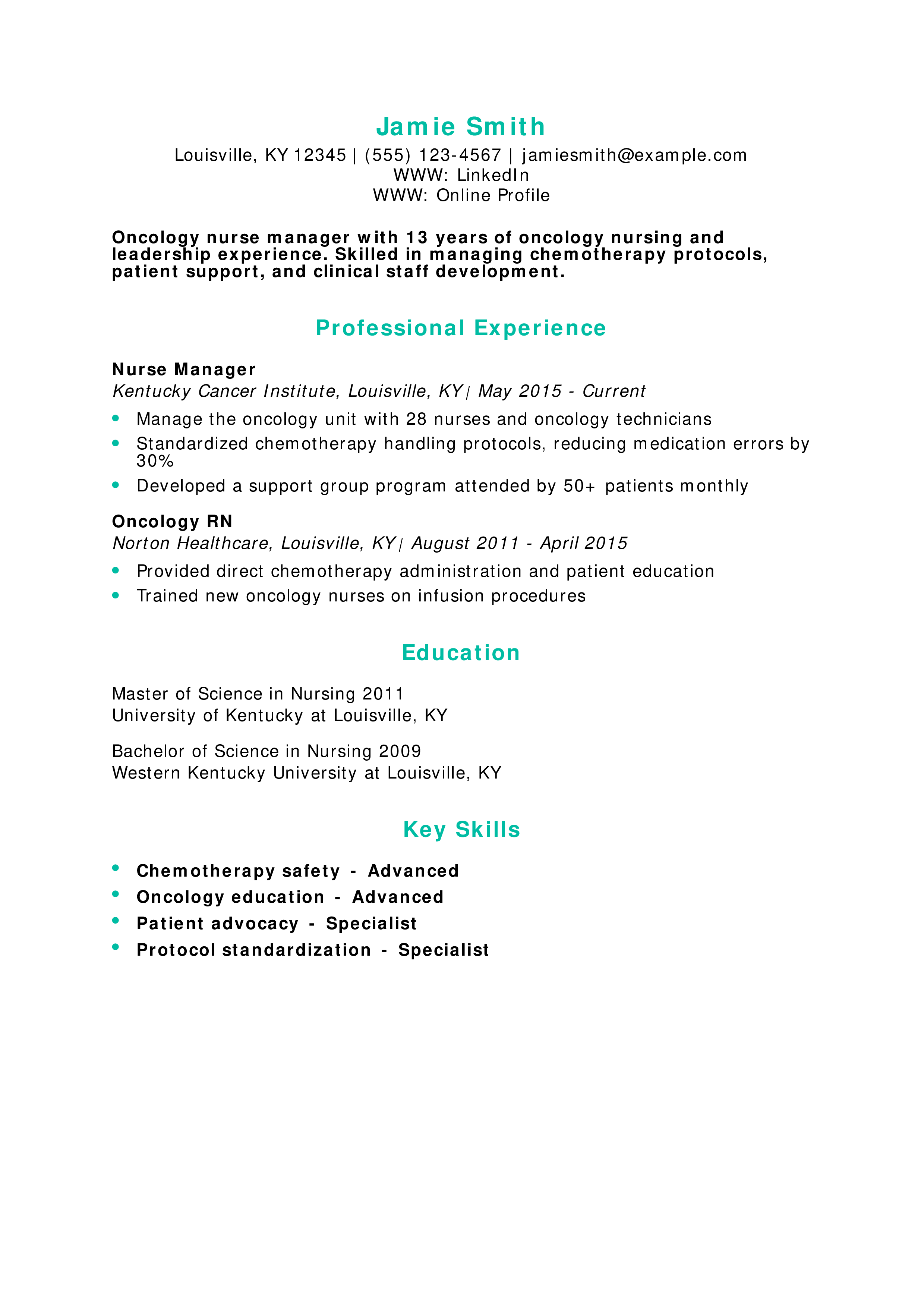 This resume is effective because it shows growth from bedside care to management. Learn how to highlight advancement at resume outline examples.