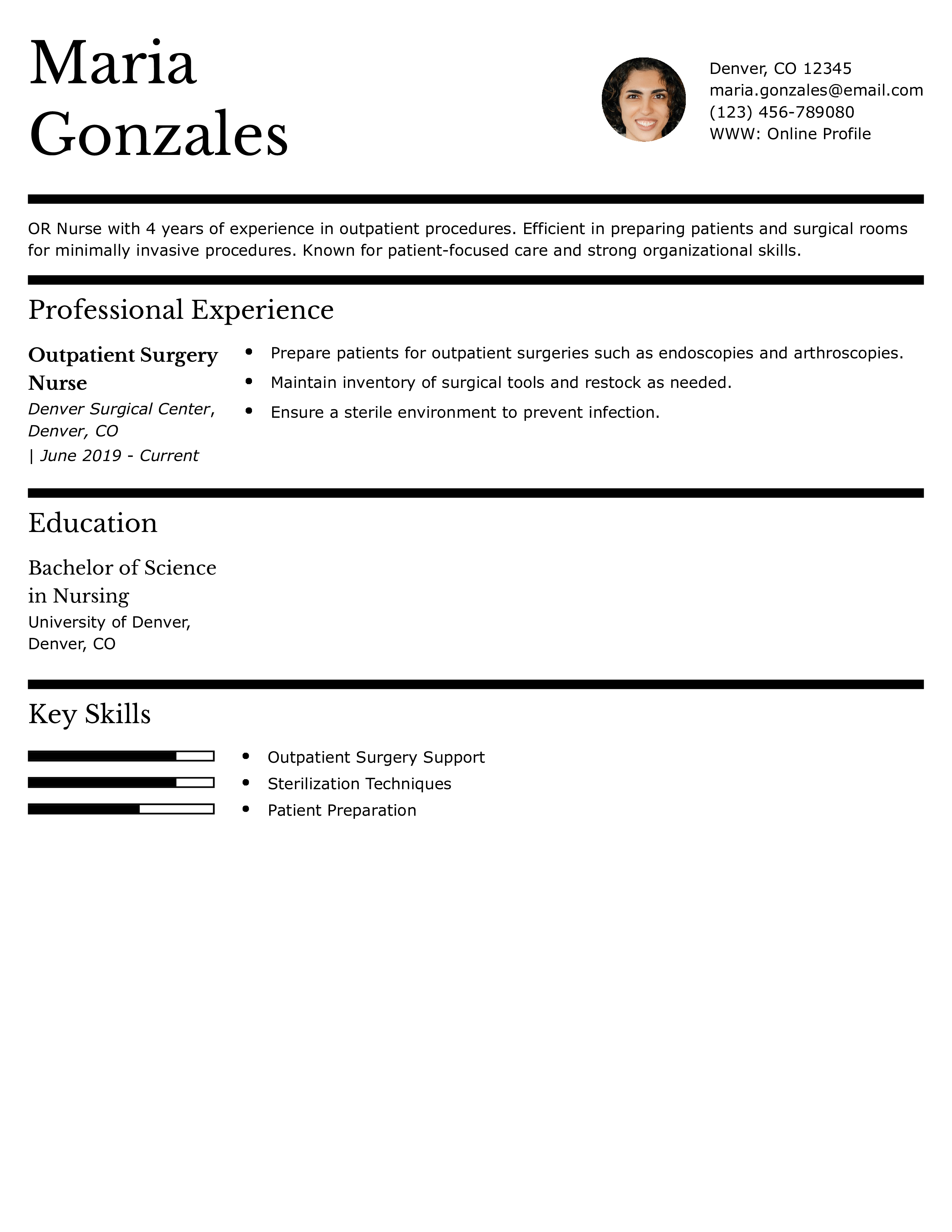 This resume showcases outpatient specialization, appealing to smaller surgical centers. Refer to resume outline examples for structured templates.