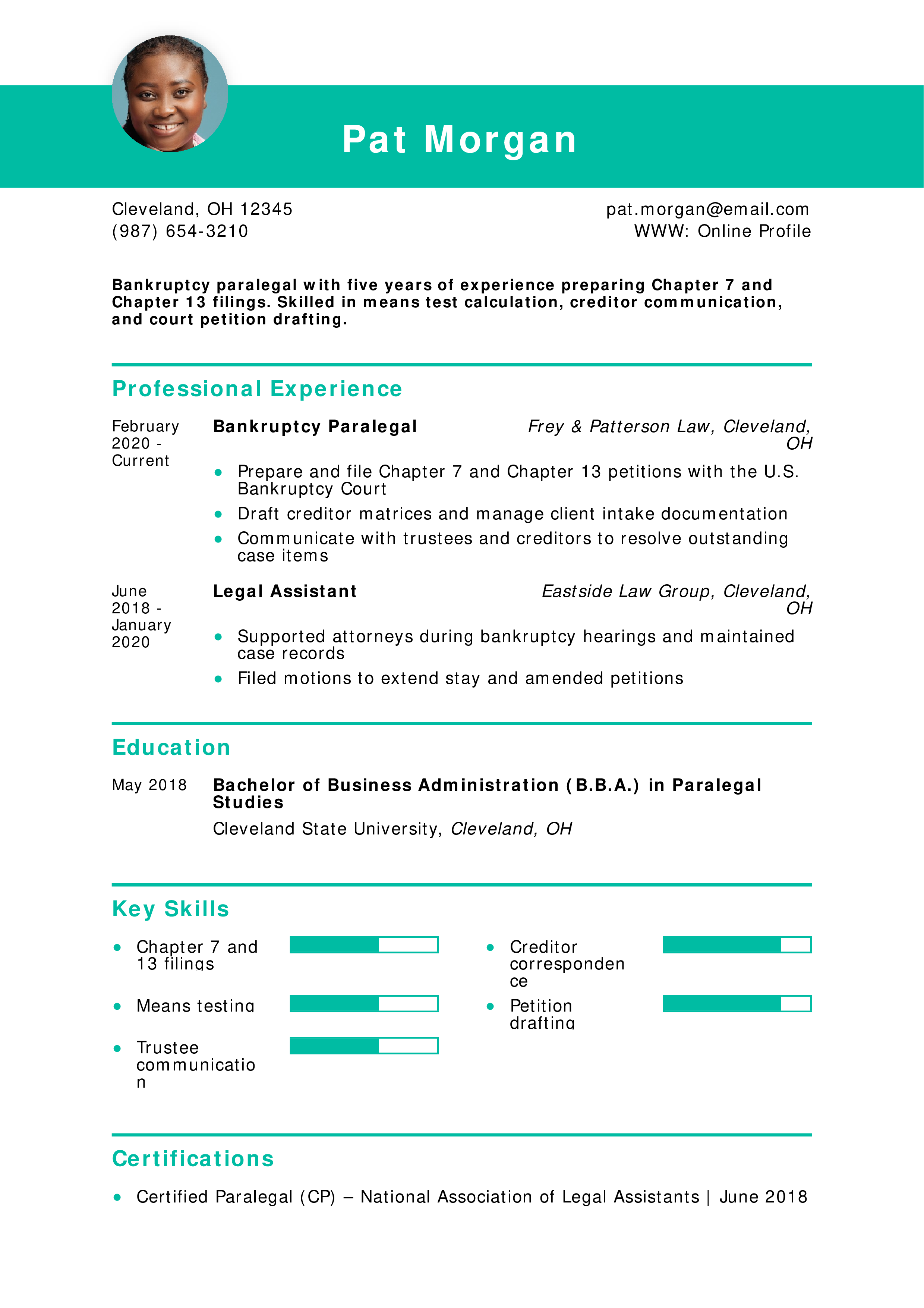 This resume focuses on specialized bankruptcy experience, including Chapter 7 and 13 filings. It also includes relevant legal terms and processes for credibility. Learn how to tailor your resume language in resume language skills.