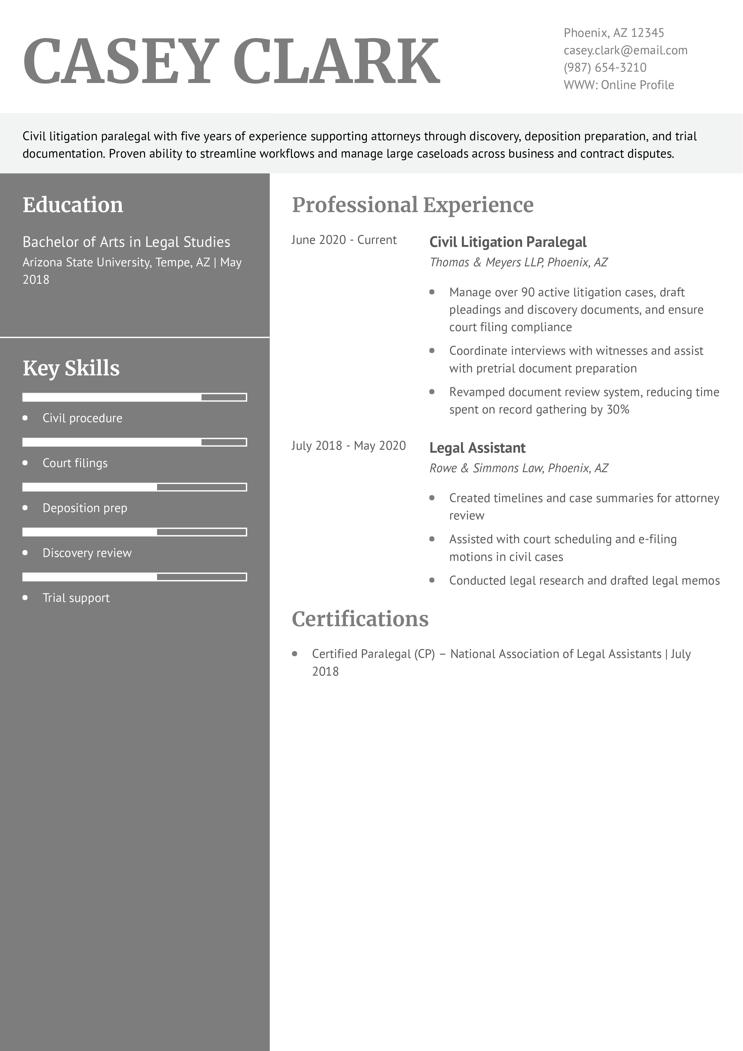 When you’re applying for similar paralegal positions, you may be tempted to use the exact same resume. But this approach can backfire and keep you from moving to the next hiring round. While some job skills do overlap, each hiring manager will look for different credentials in an applicant, such as experience with criminal law or the ability to create a file organization system. Get their attention by including keywords and phrases from the job posting in your Key Skills and Experience sections. Also, if the job requires a certification you have, add that to your Profile so you stand out as a qualified applicant right away.