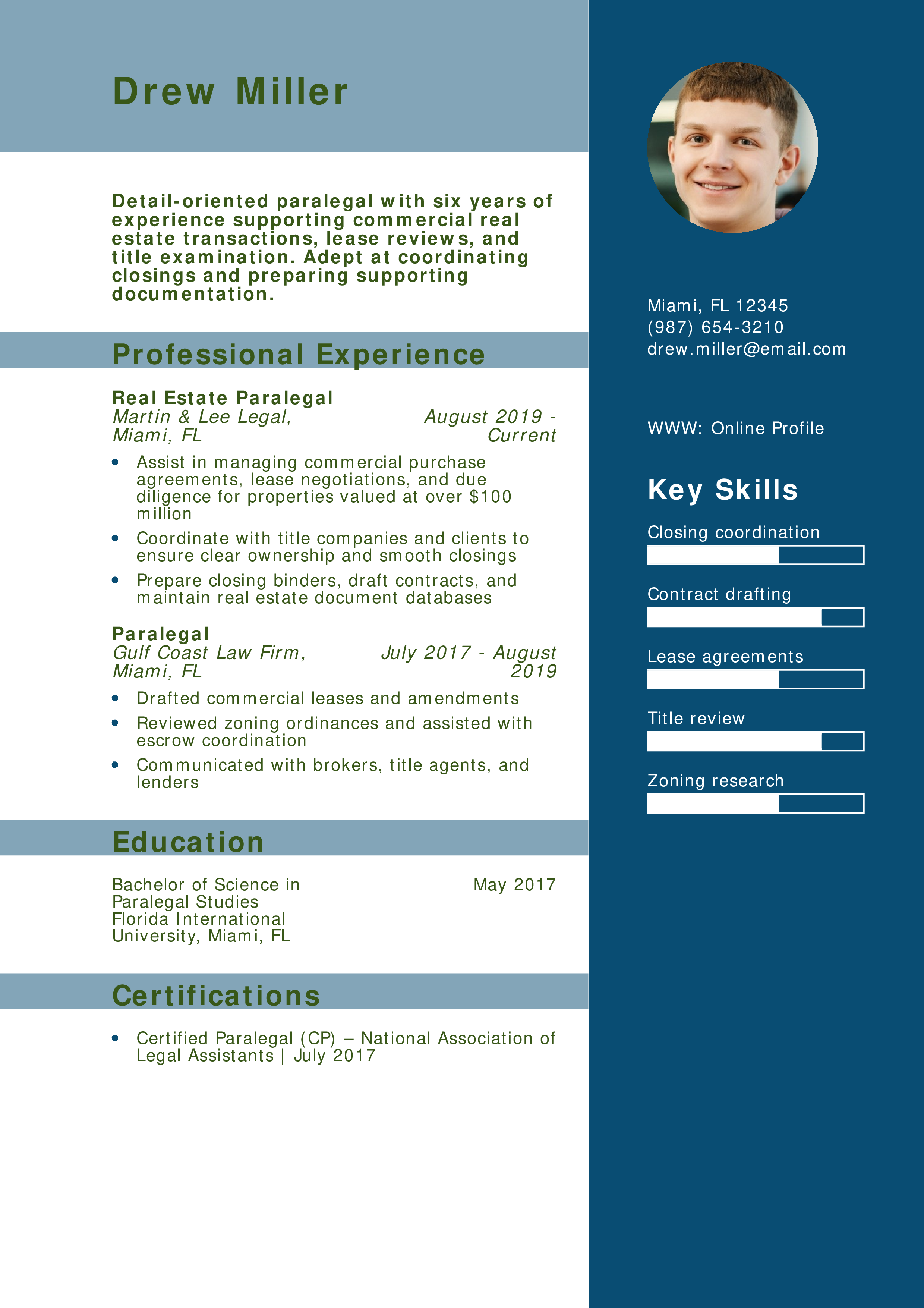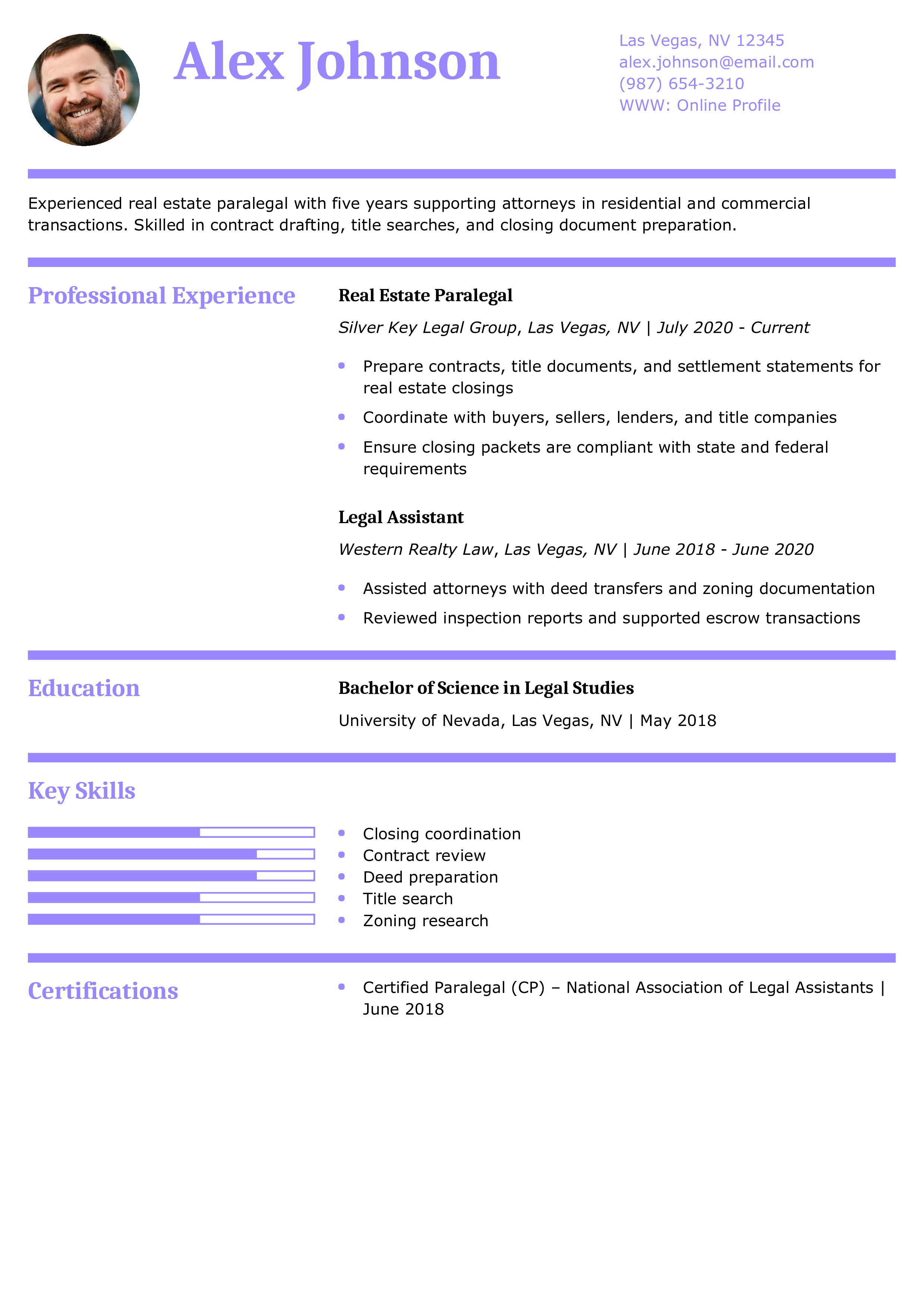 This resume demonstrates real estate-specific legal work with relevant skills like zoning research and closing coordination. To enhance job application targeting, check out how to align your resume with the job description.
