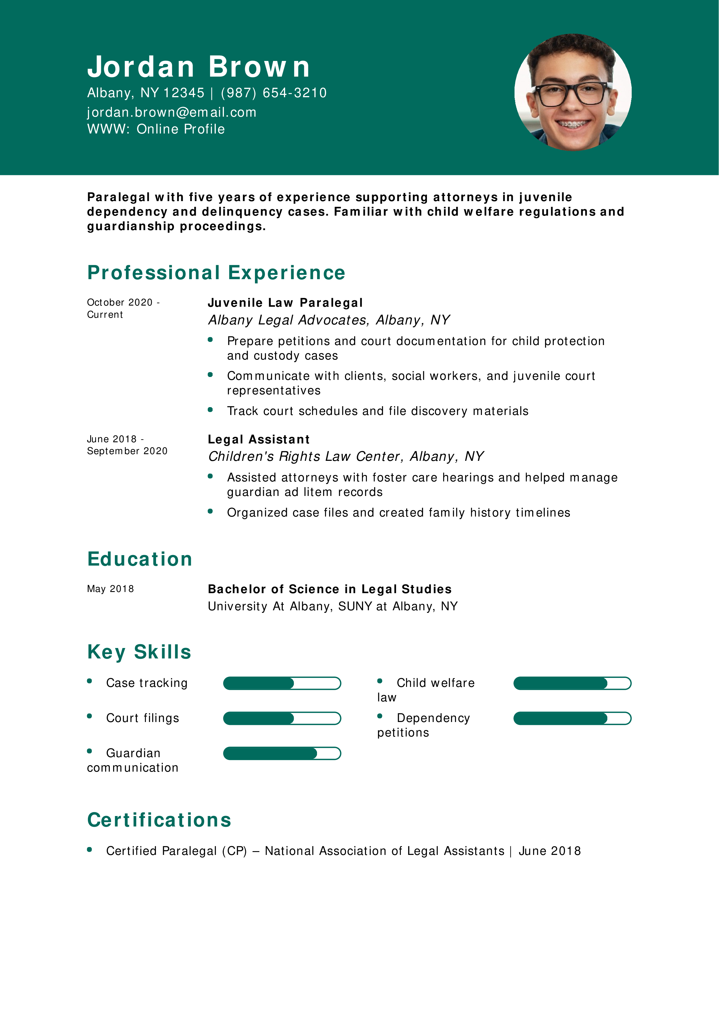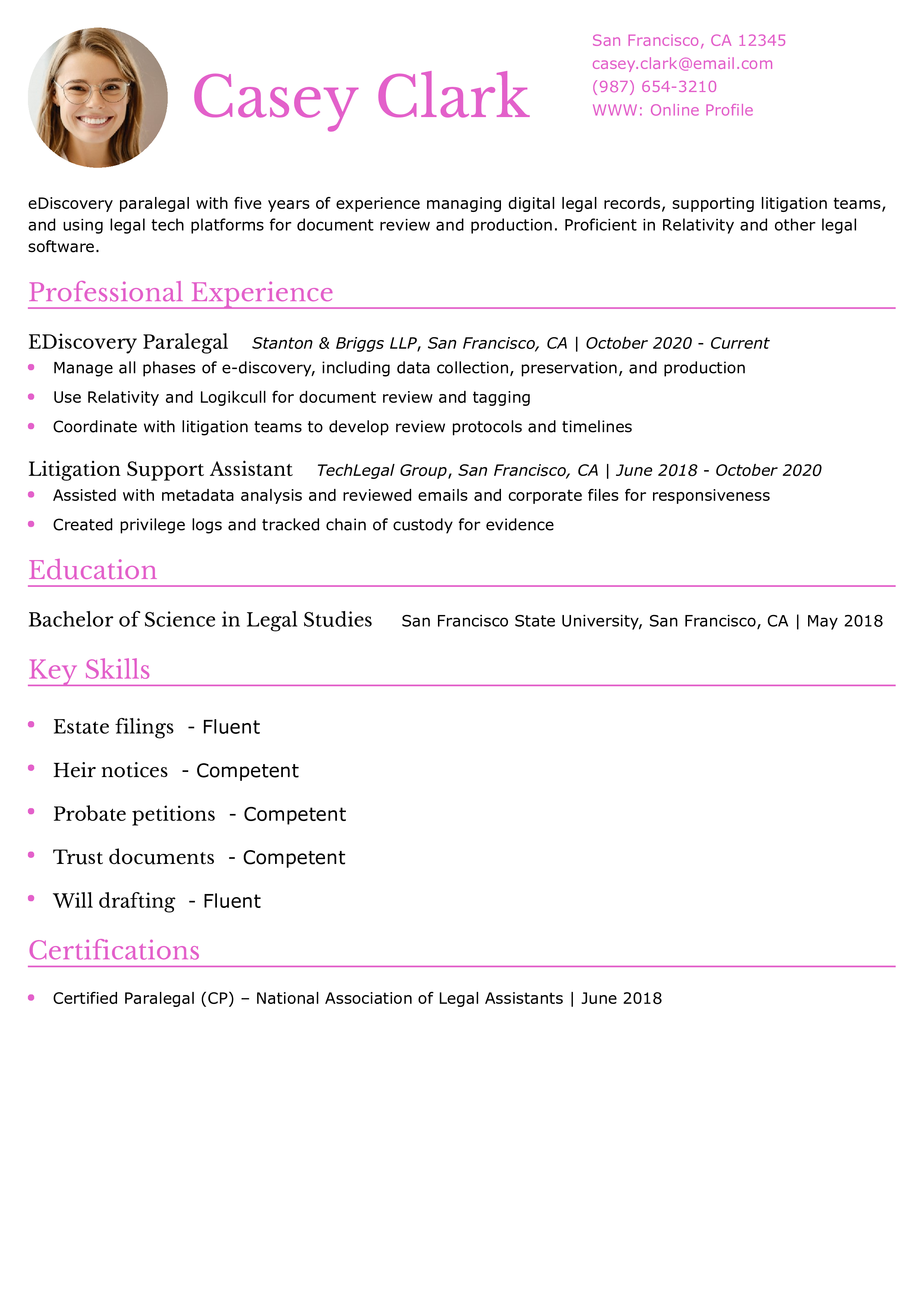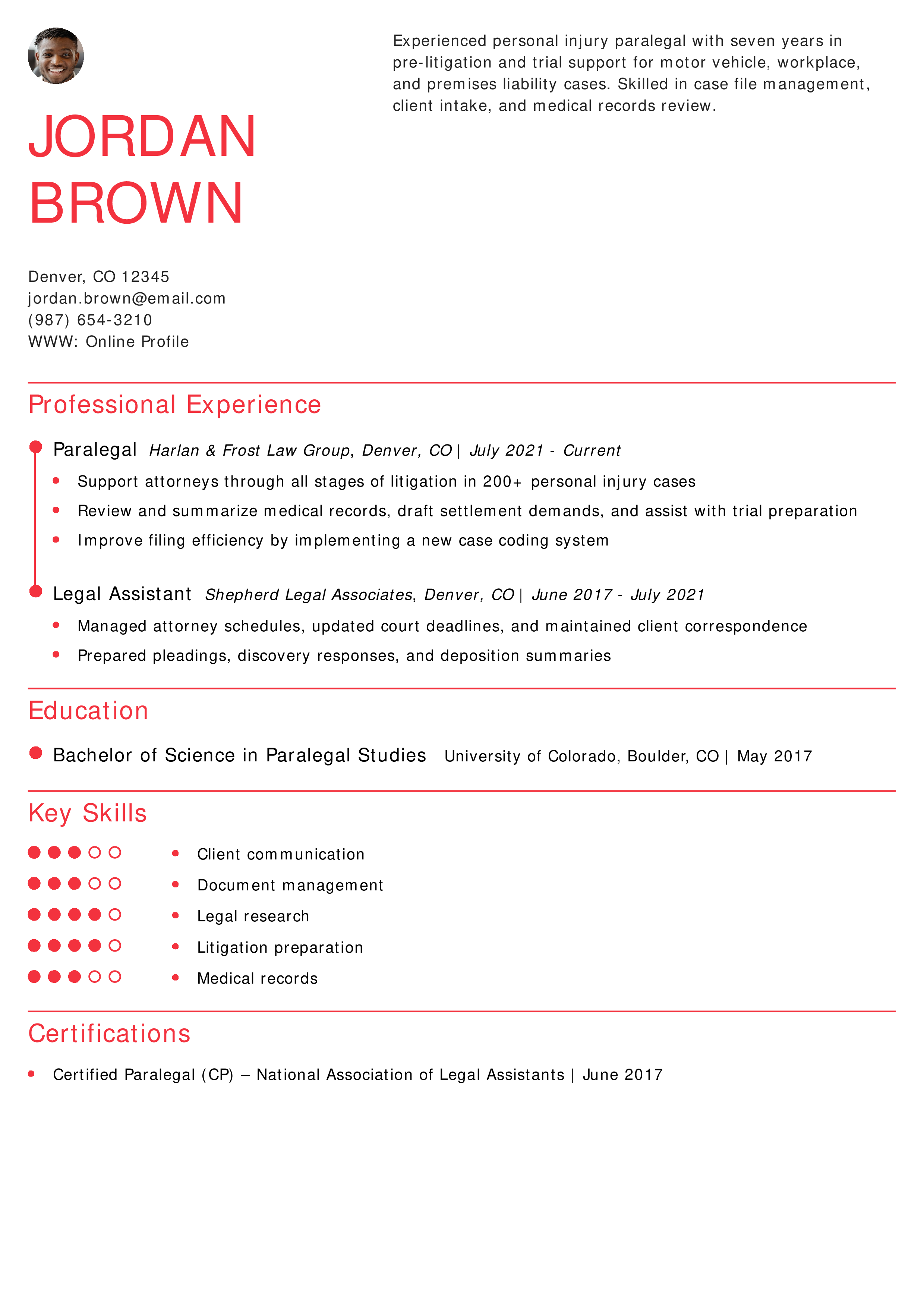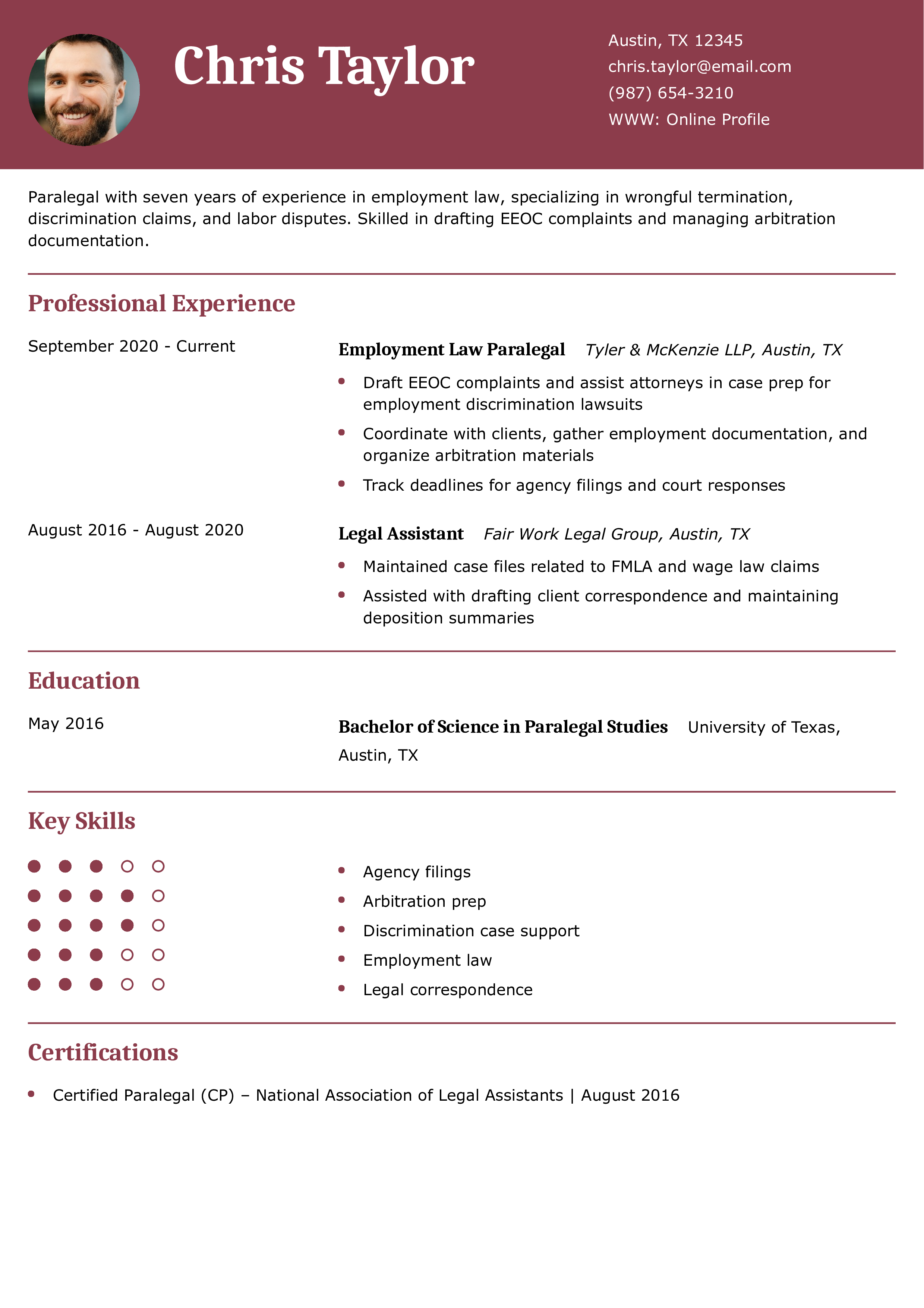 As a paralegal, your job is to support attorneys and expedite law office procedures. When writing your Experience section, focus on how you’ve helped firms streamline operations or break large projects into manageable steps. Also, emphasize your organizational skills since a key part of this role is researching and managing multiple case files across different clients.