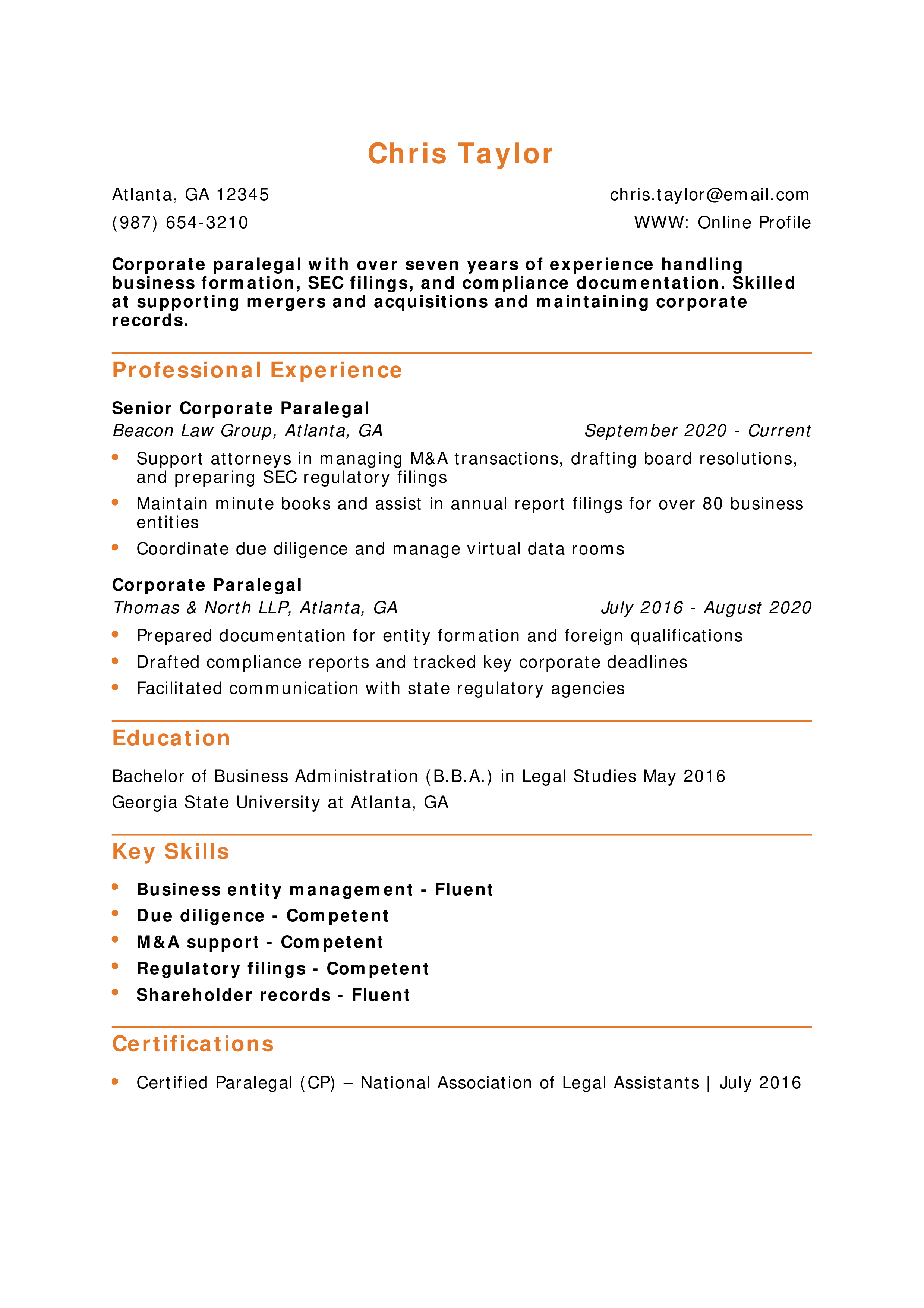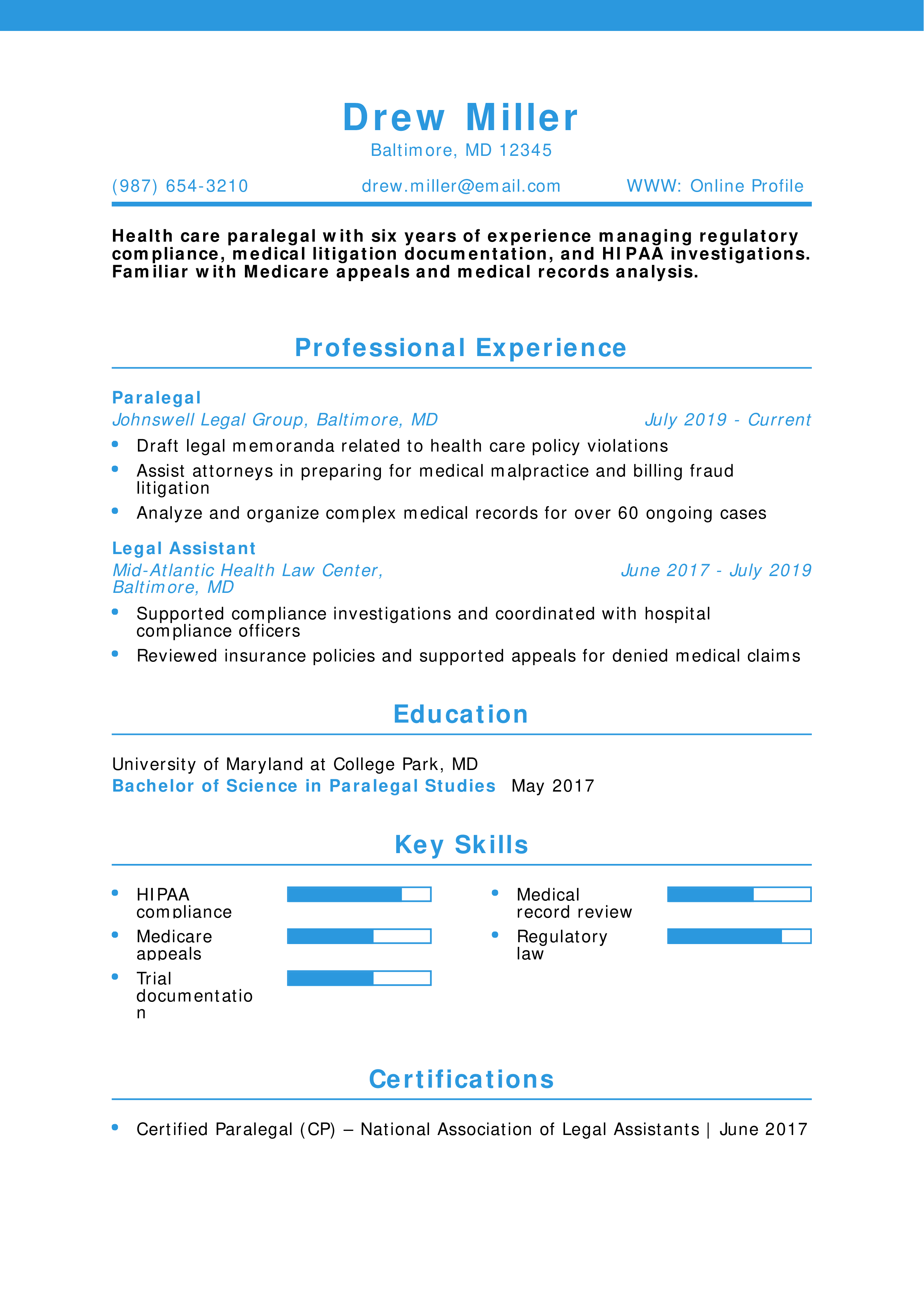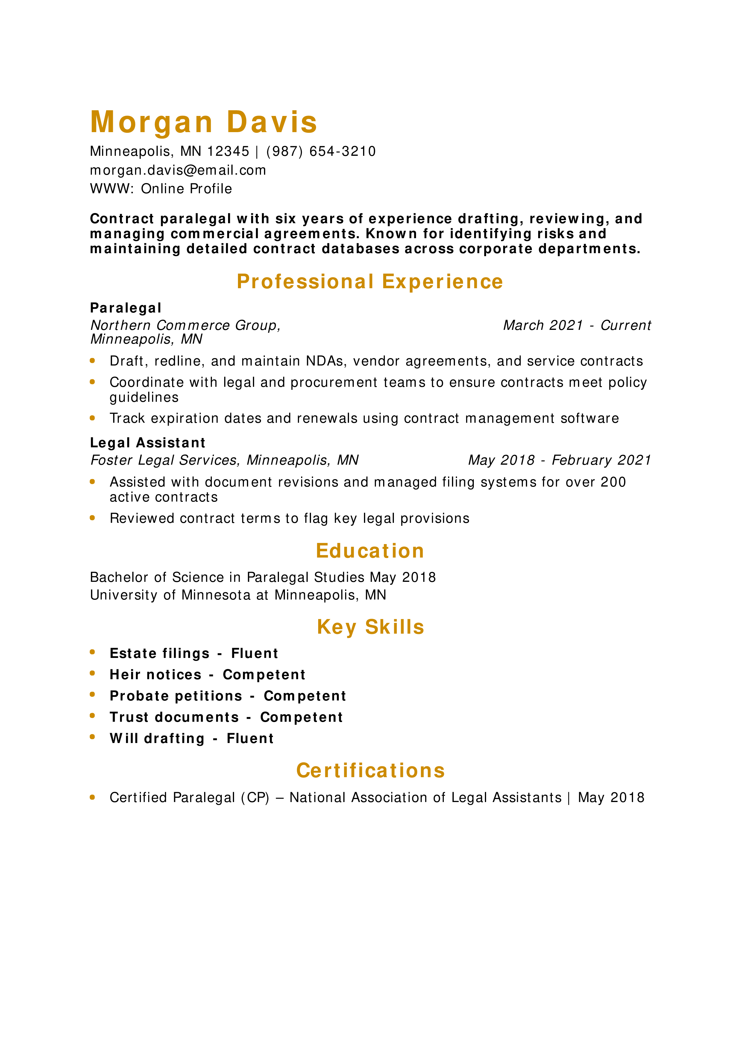 As a paralegal, your job is to support attorneys and expedite law office procedures. When writing your Experience section, focus on how you’ve helped firms streamline operations or break large projects into manageable steps. Also, emphasize your organizational skills since a key part of this role is researching and managing multiple case files across different clients.