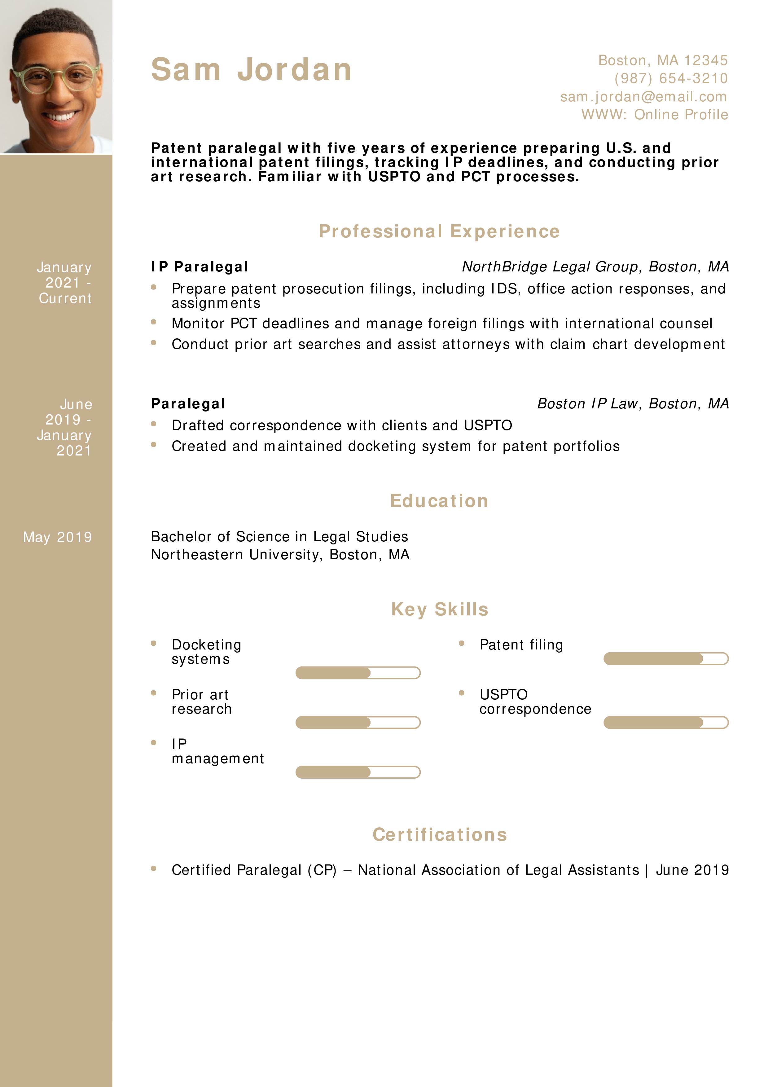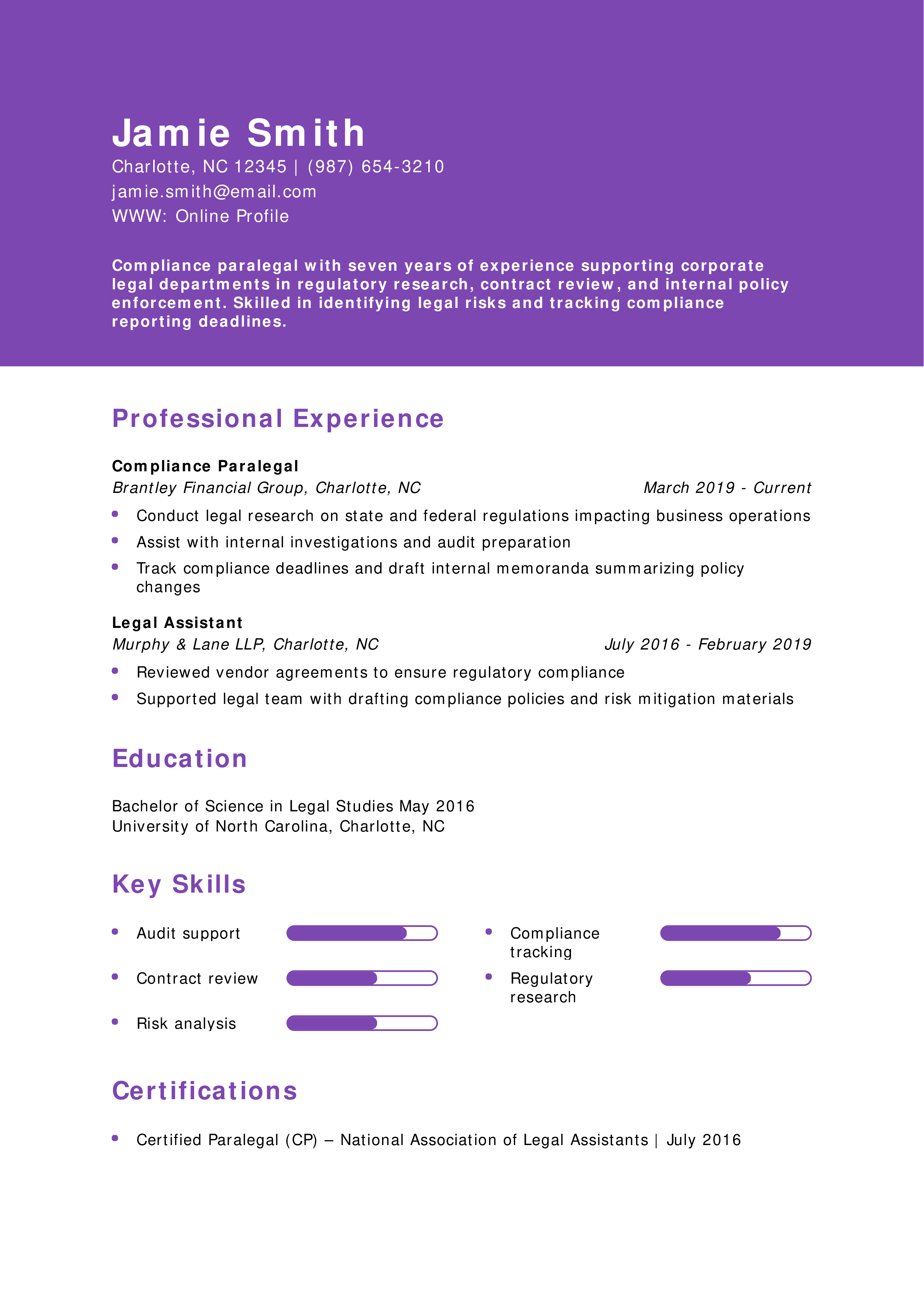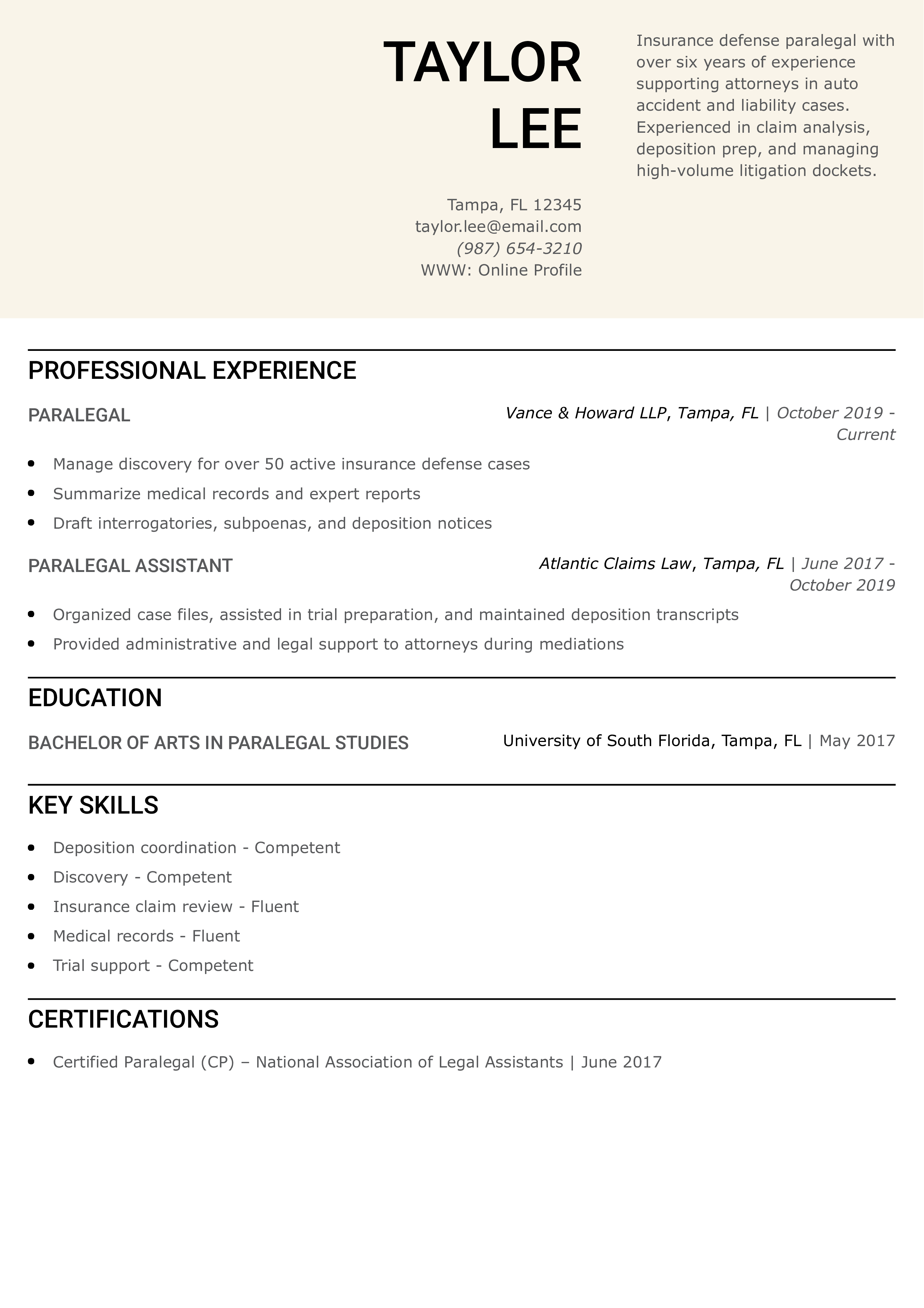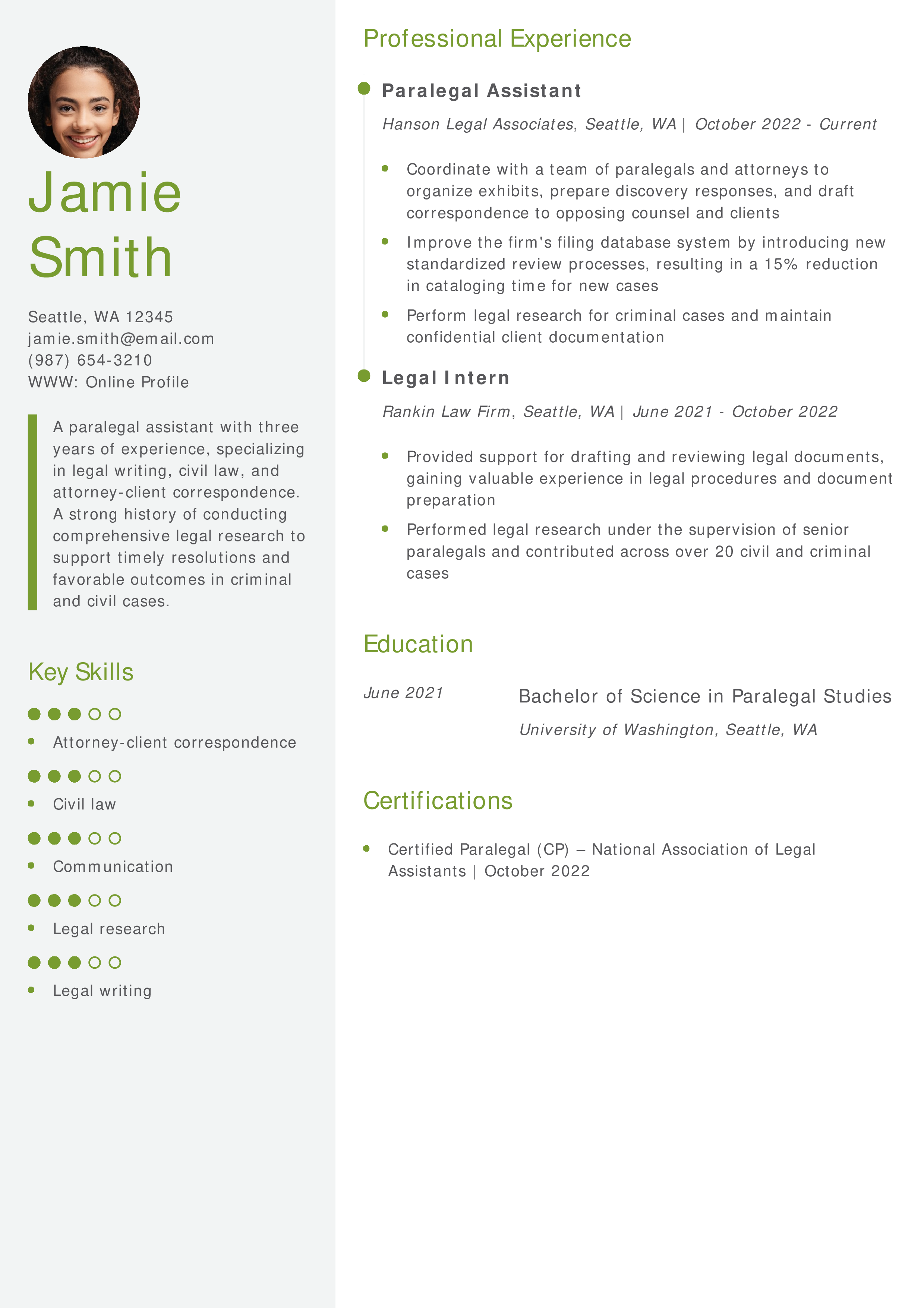 As a paralegal, your job is to support attorneys and expedite law office procedures. When writing your Experience section, focus on how you’ve helped firms streamline operations or break large projects into manageable steps. Also, emphasize your organizational skills since a key part of this role is researching and managing multiple case files across different clients.