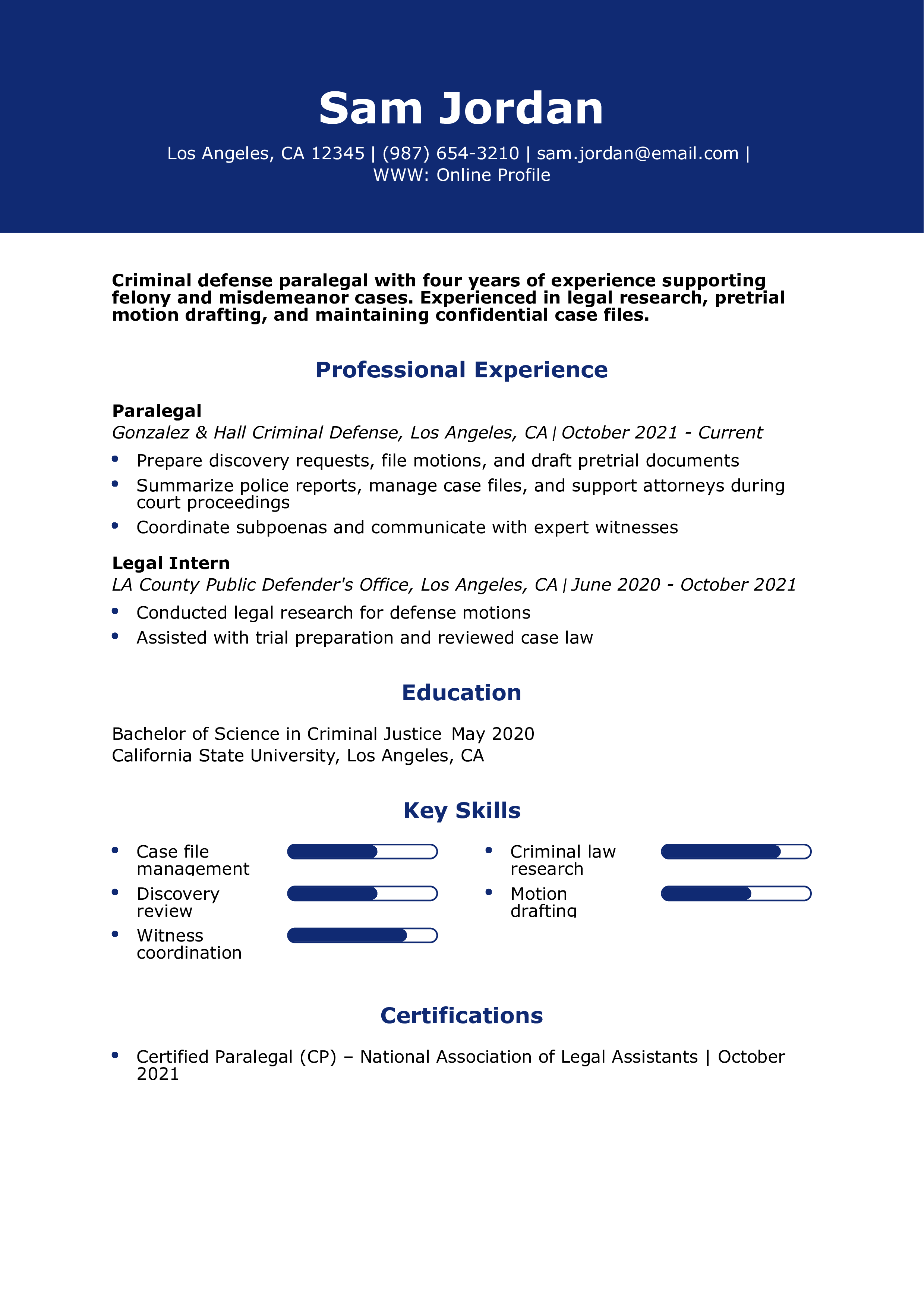 This resume presents a focused legal background with courtroom experience in criminal defense. Emphasis on confidential case handling and document preparation supports relevance. Learn more at resume skills.
