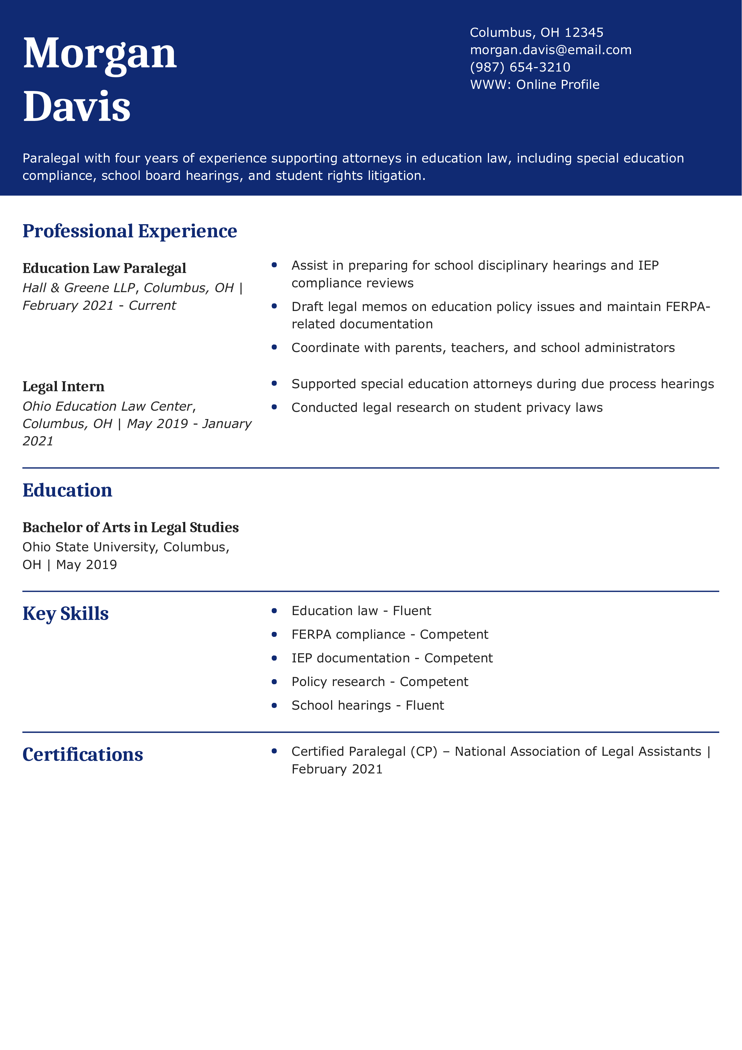 This resume highlights education law experience, including administrative hearings and regulatory compliance. The skills apply to both public and private education systems. For more on tailoring resumes by industry, see how to list your education.