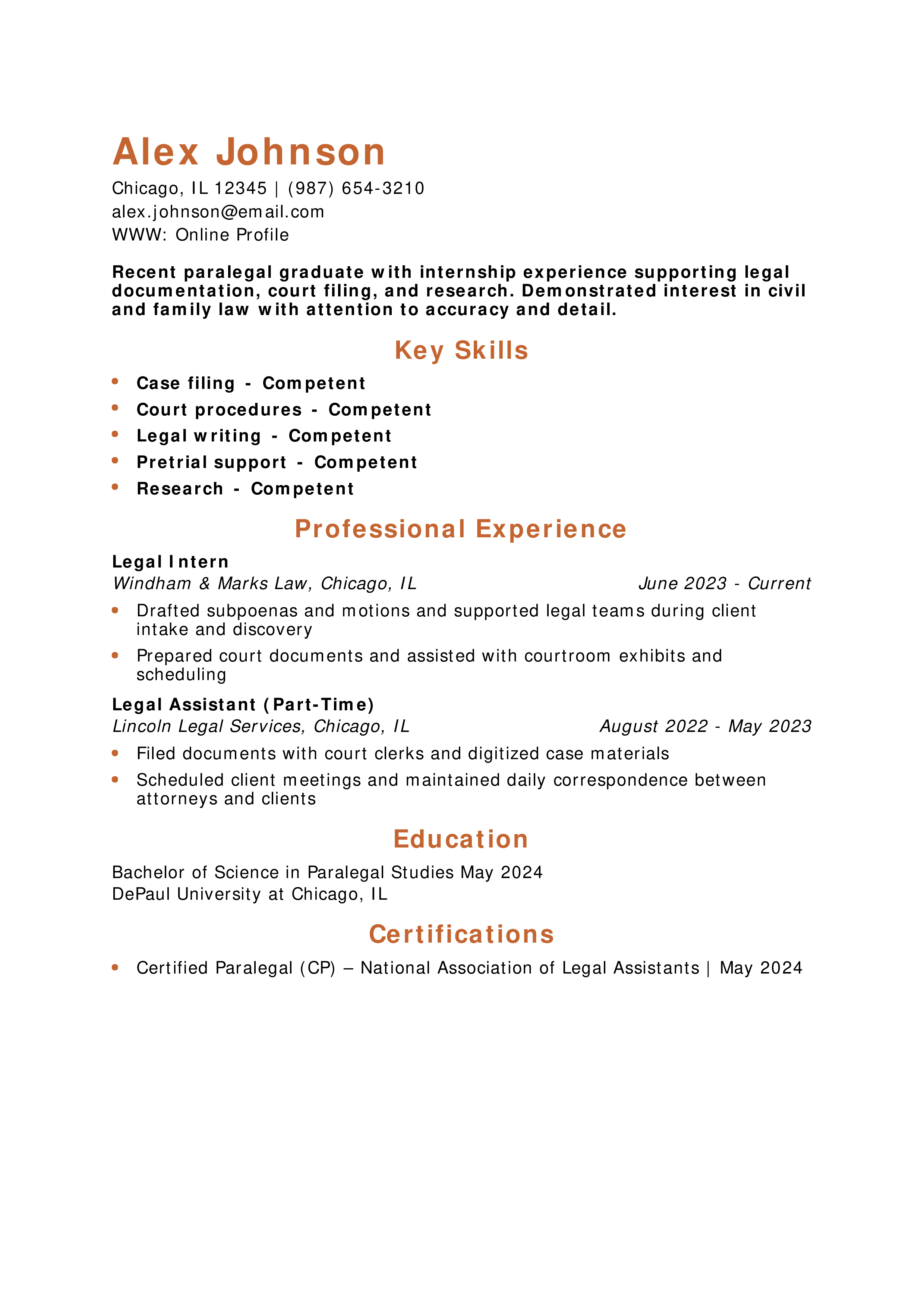 This resume shows a clear path from education to practical legal support. It emphasizes document preparation and courtroom exposure, which are valuable for new paralegals. For more advice on building entry-level resumes, visit how to make a resume.