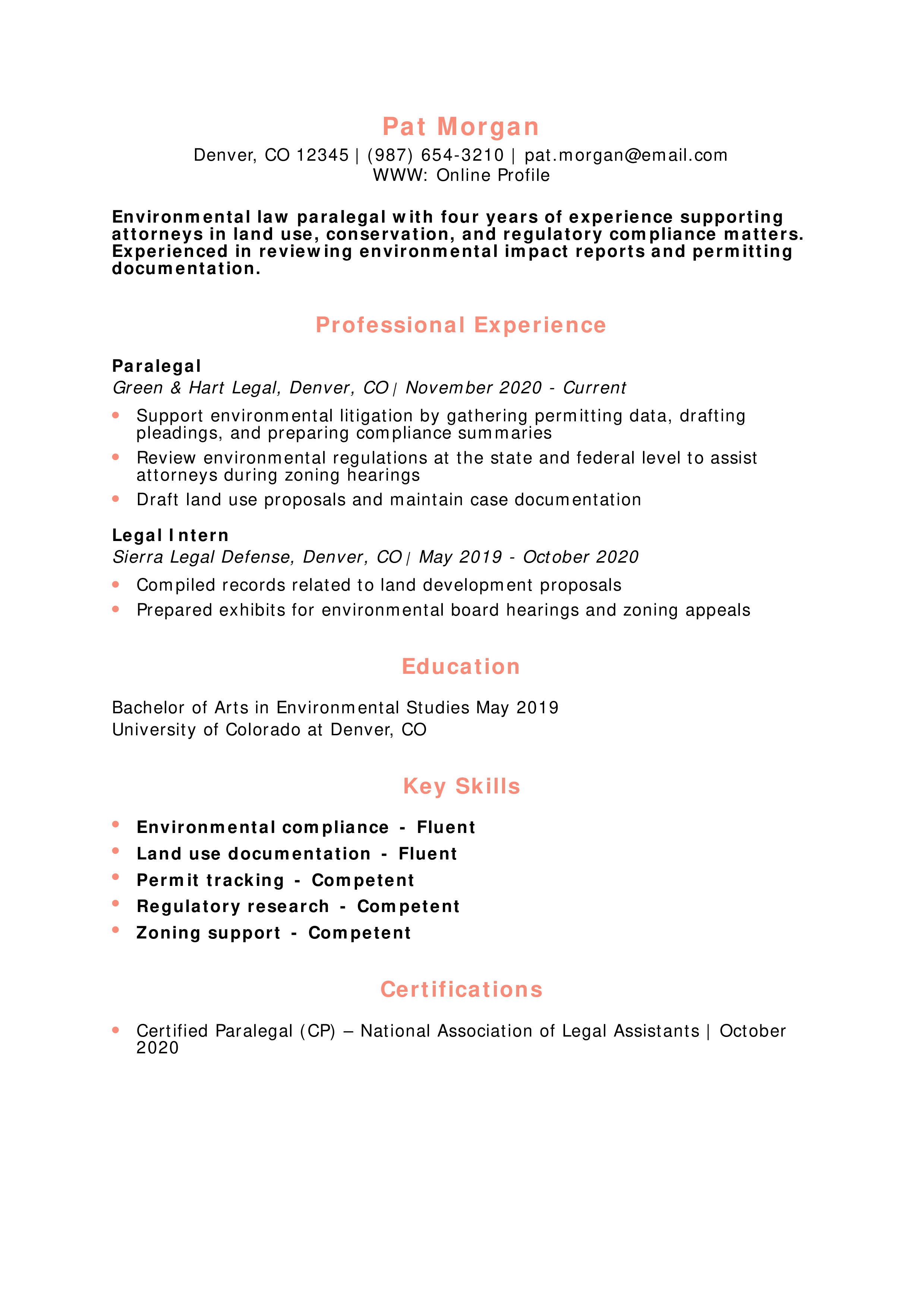 This resume highlights a niche in environmental law with specific duties like zoning research and permit tracking. These are useful for firms that focus on regulatory litigation. To explore environmental experience further, visit how to list your education.