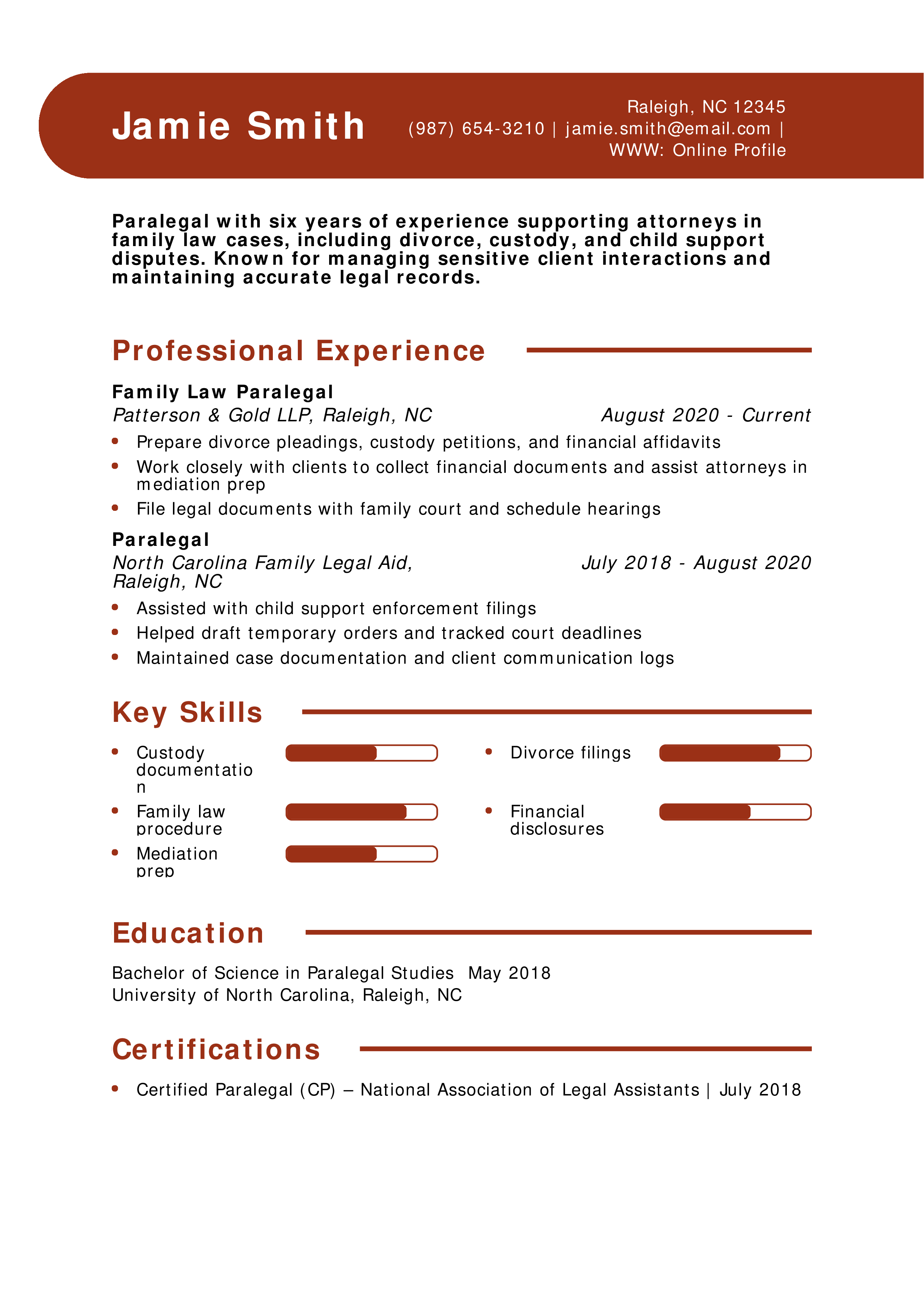 This resume reflects specialized family law experience with tasks that require empathy and confidentiality. It also includes technical filing and mediation skills. Learn how to showcase sensitivity in client-facing roles at soft skills for resume.